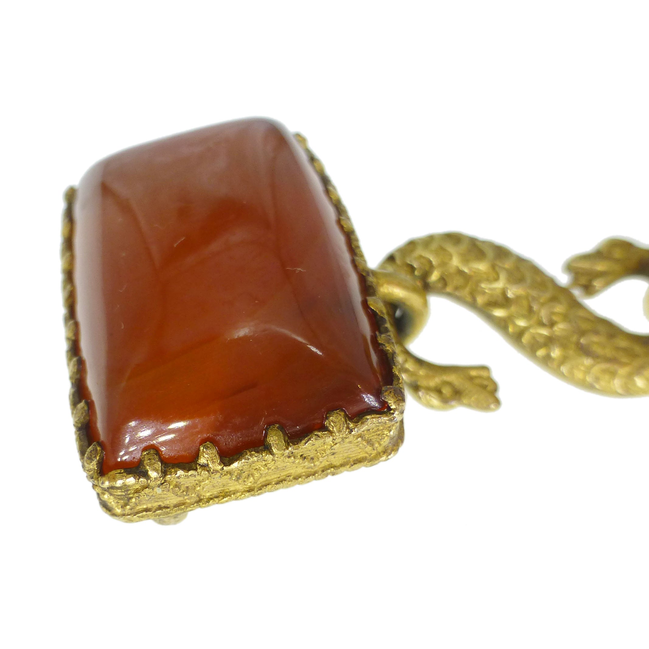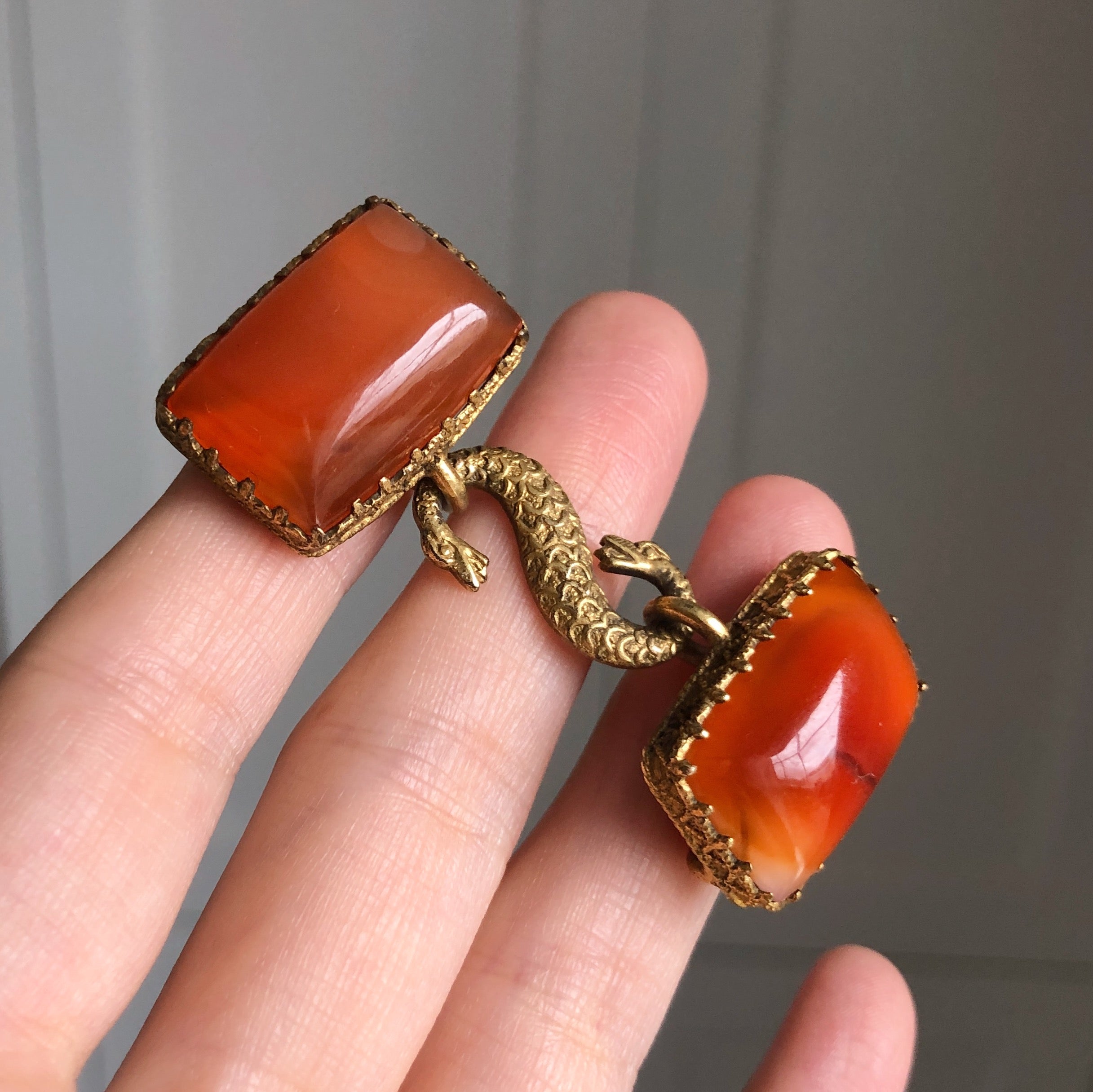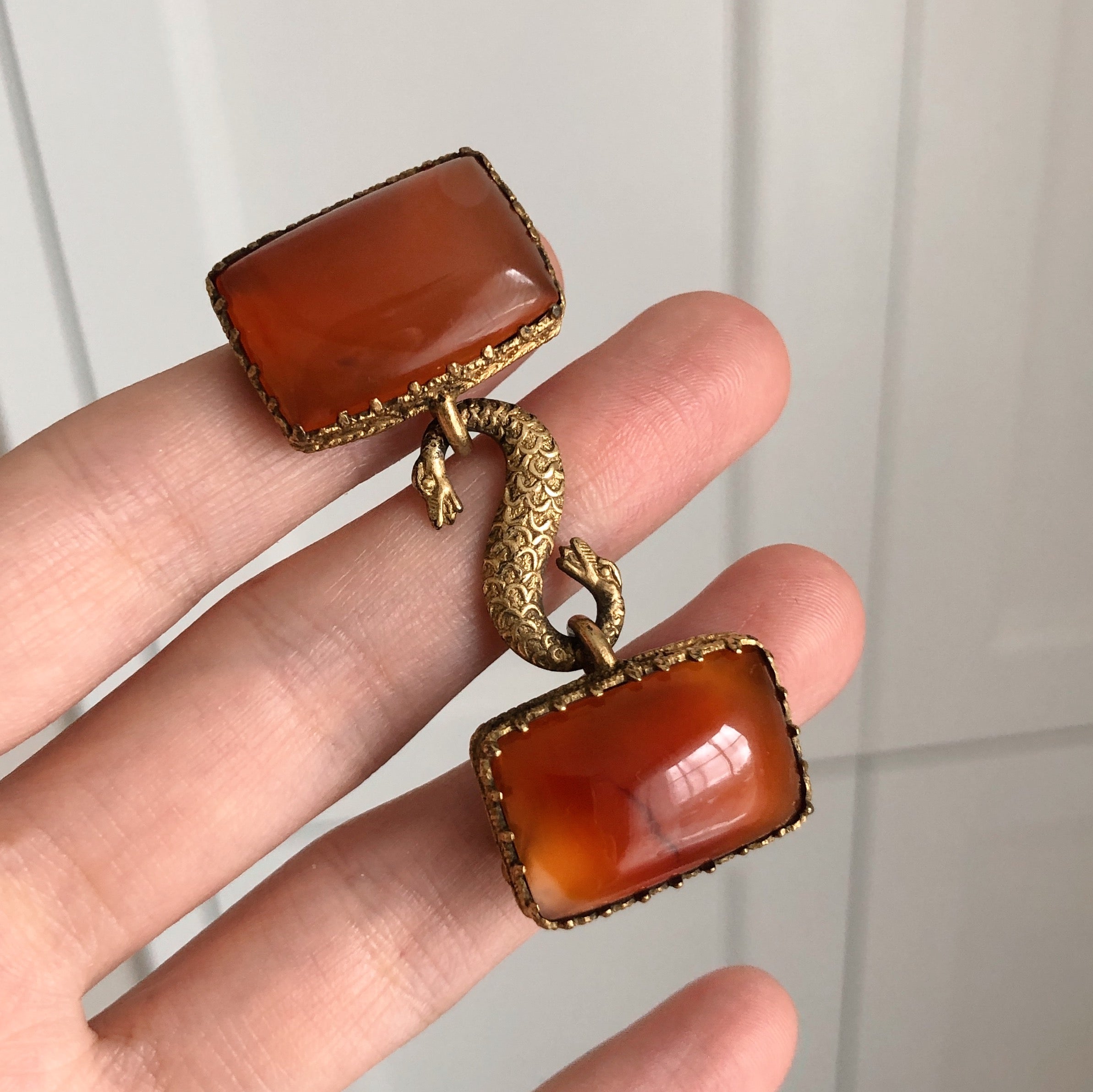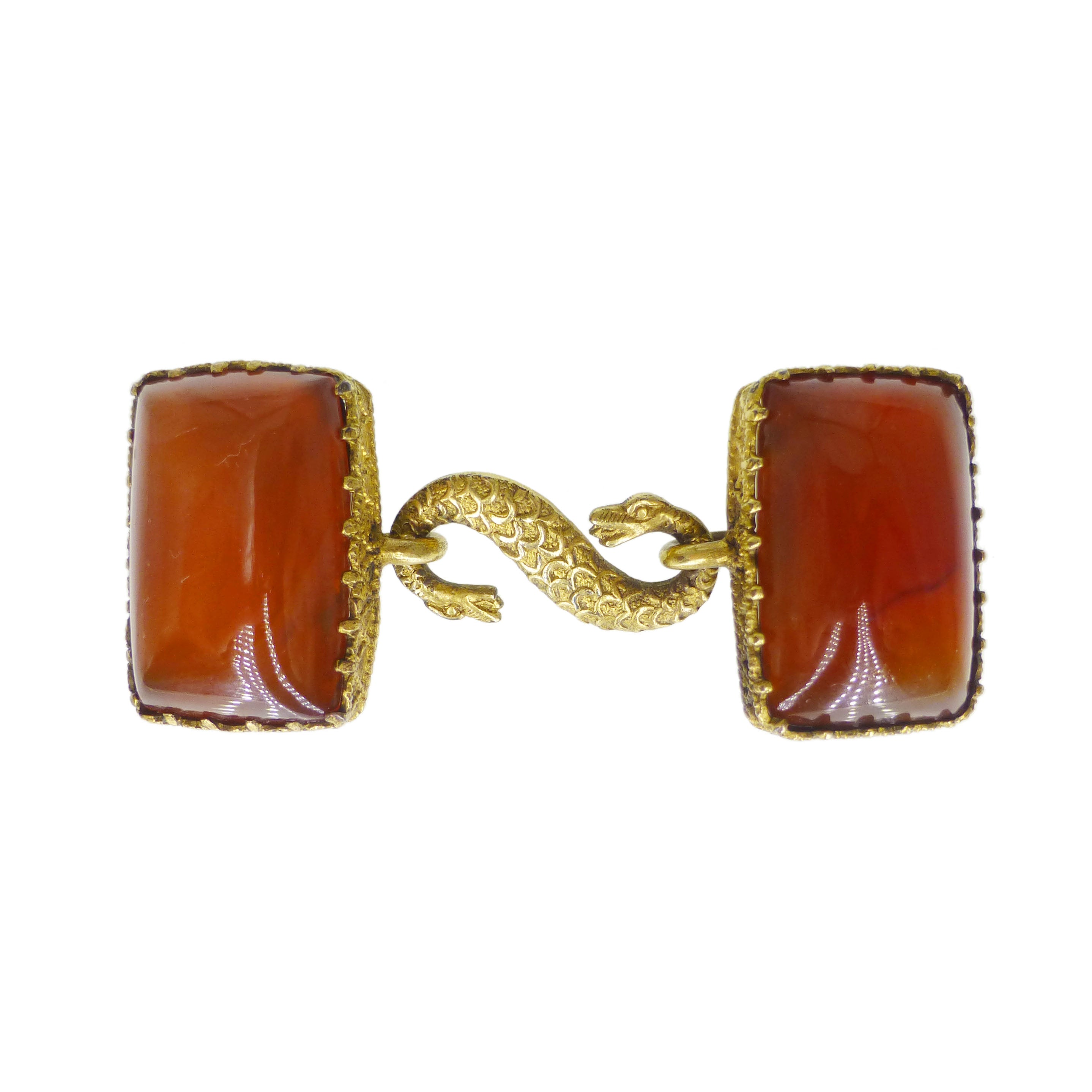 A rare antique snake buckle dating to the 19th Century. The gold tone metal buckle features two large polished carnelian stones ornately set into engraved frames and connected by a detailed snake 'S' hook clasp.