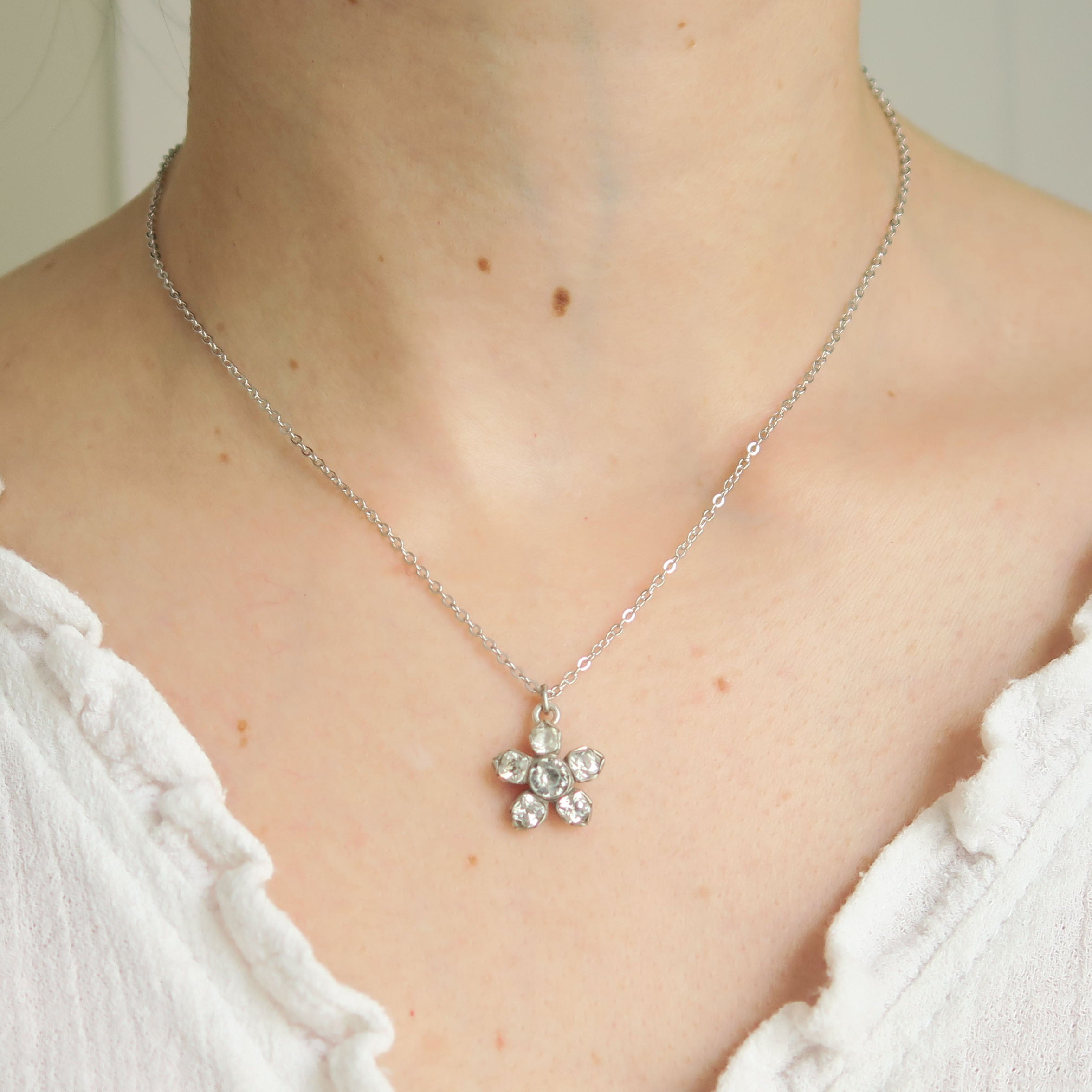 The silver flower is set with little black dot paste stones and features a secure hooked top with a silver bale attached.