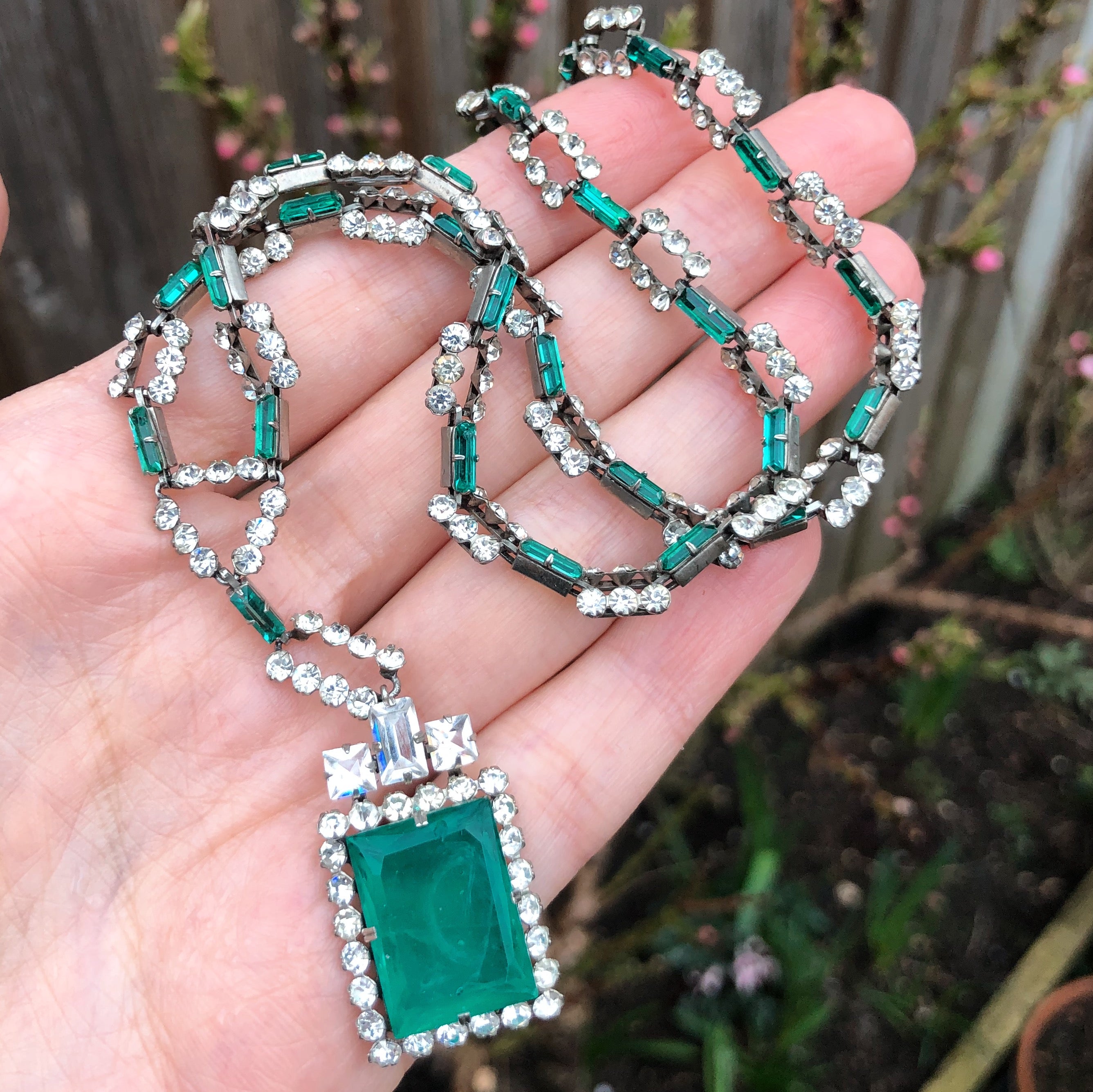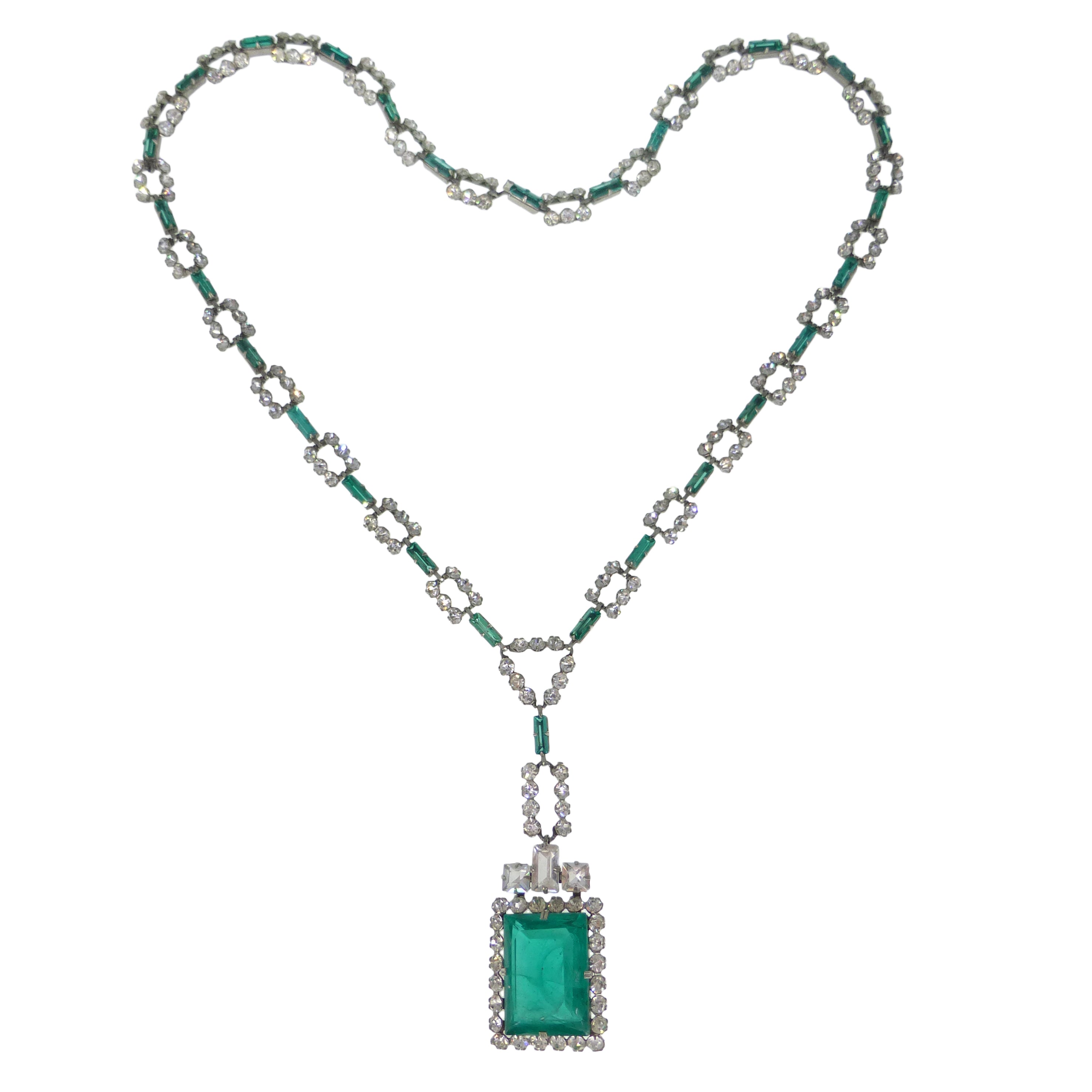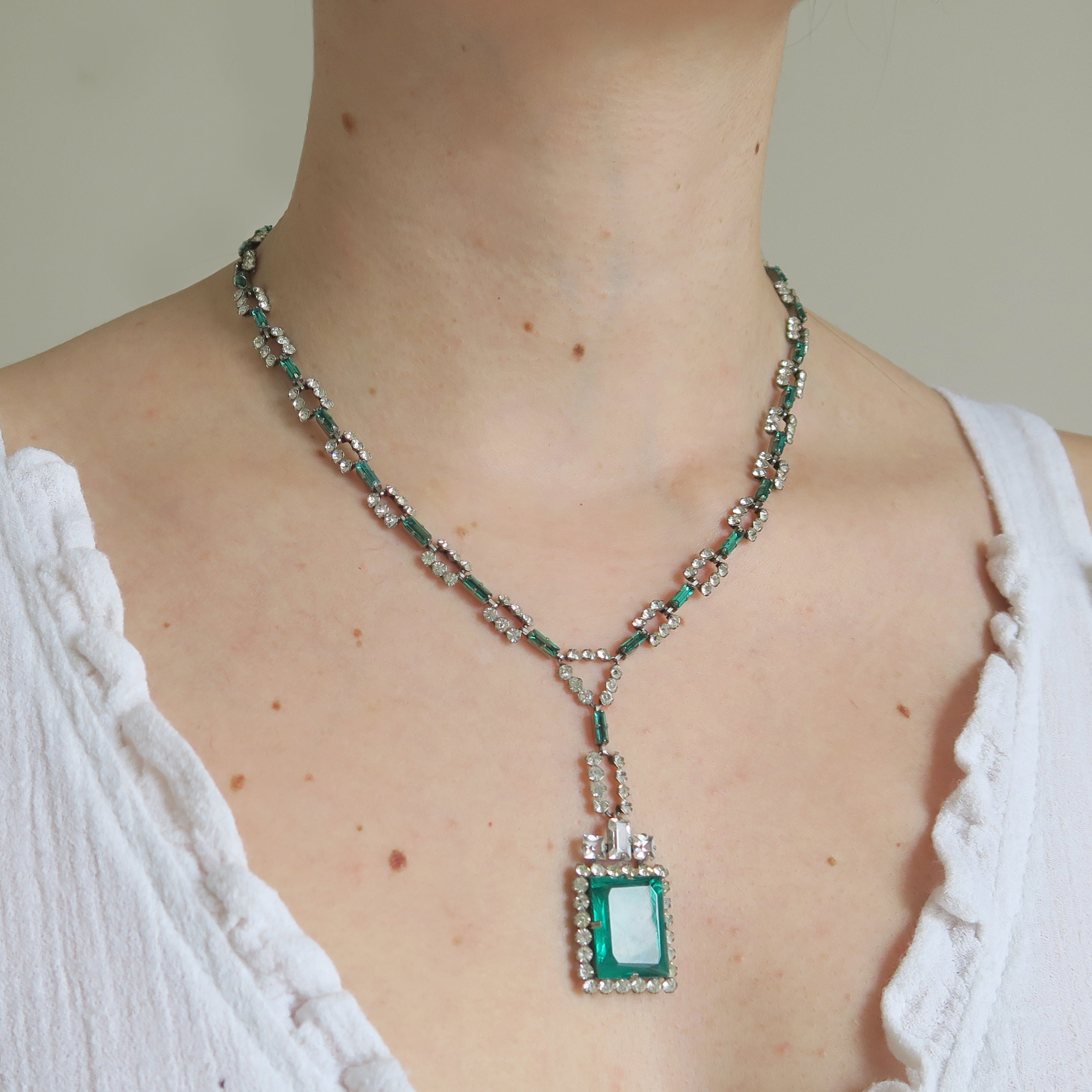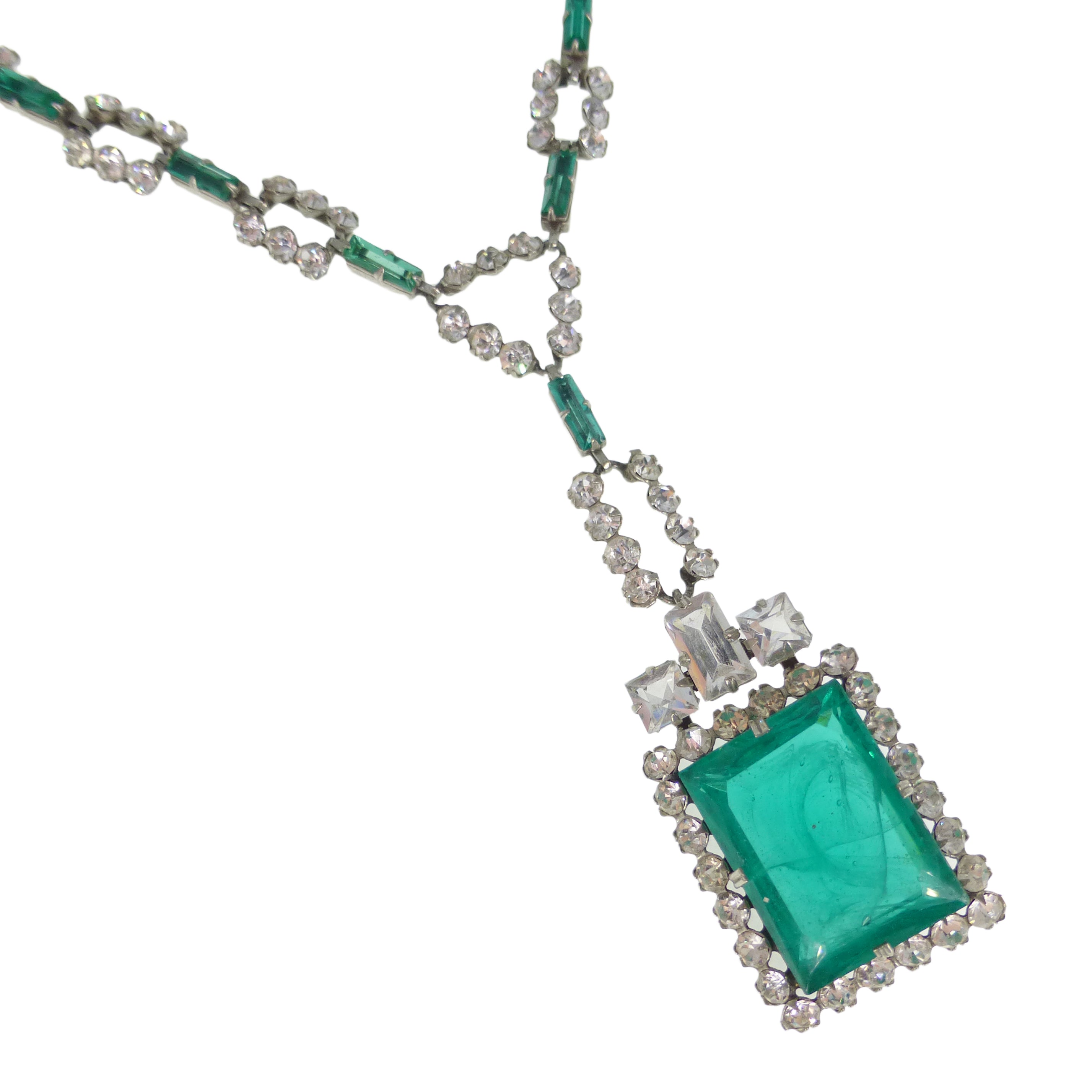 An incredible Art Deco necklace featuring delicate silver panels set with colourful green baguette stones and clear paste stones that lead to a beautiful drop. The central drop features a swirled green glass stone framed by clear paste stones.