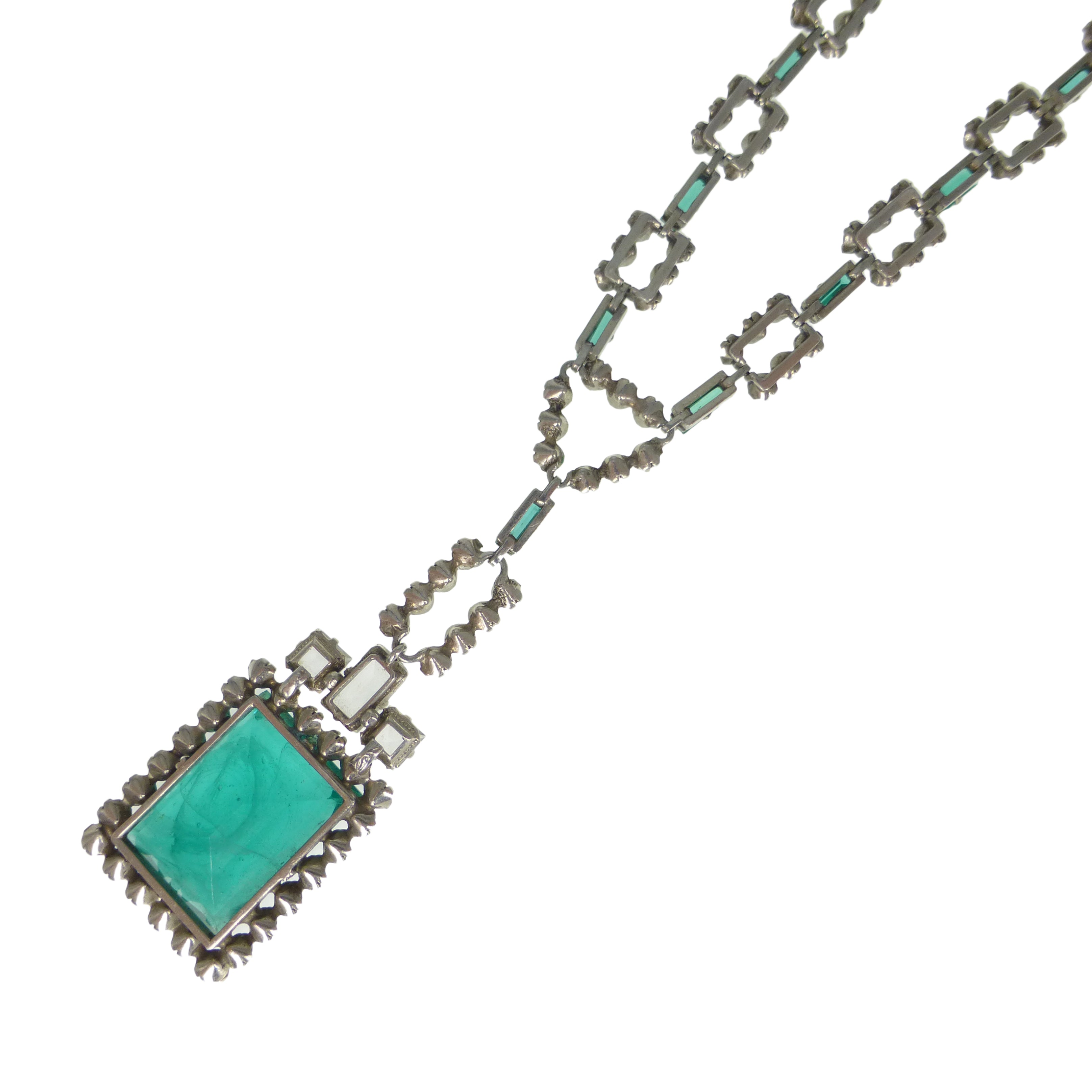 Antique Art Deco Emerald Glass Drop Silver Panel Necklace