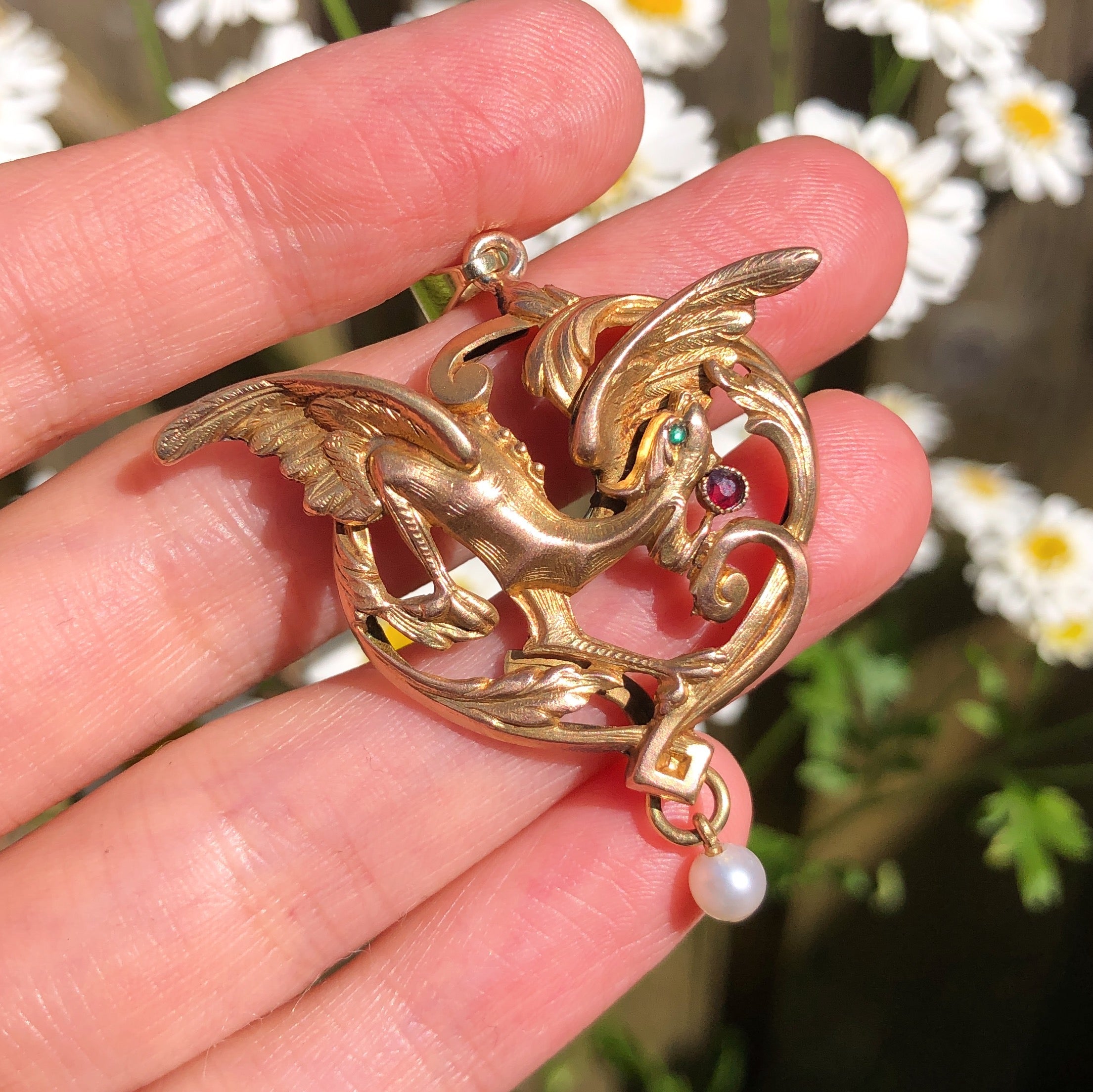 Antique Art Nouveau Gold Filled Dragon Griffon Pendant