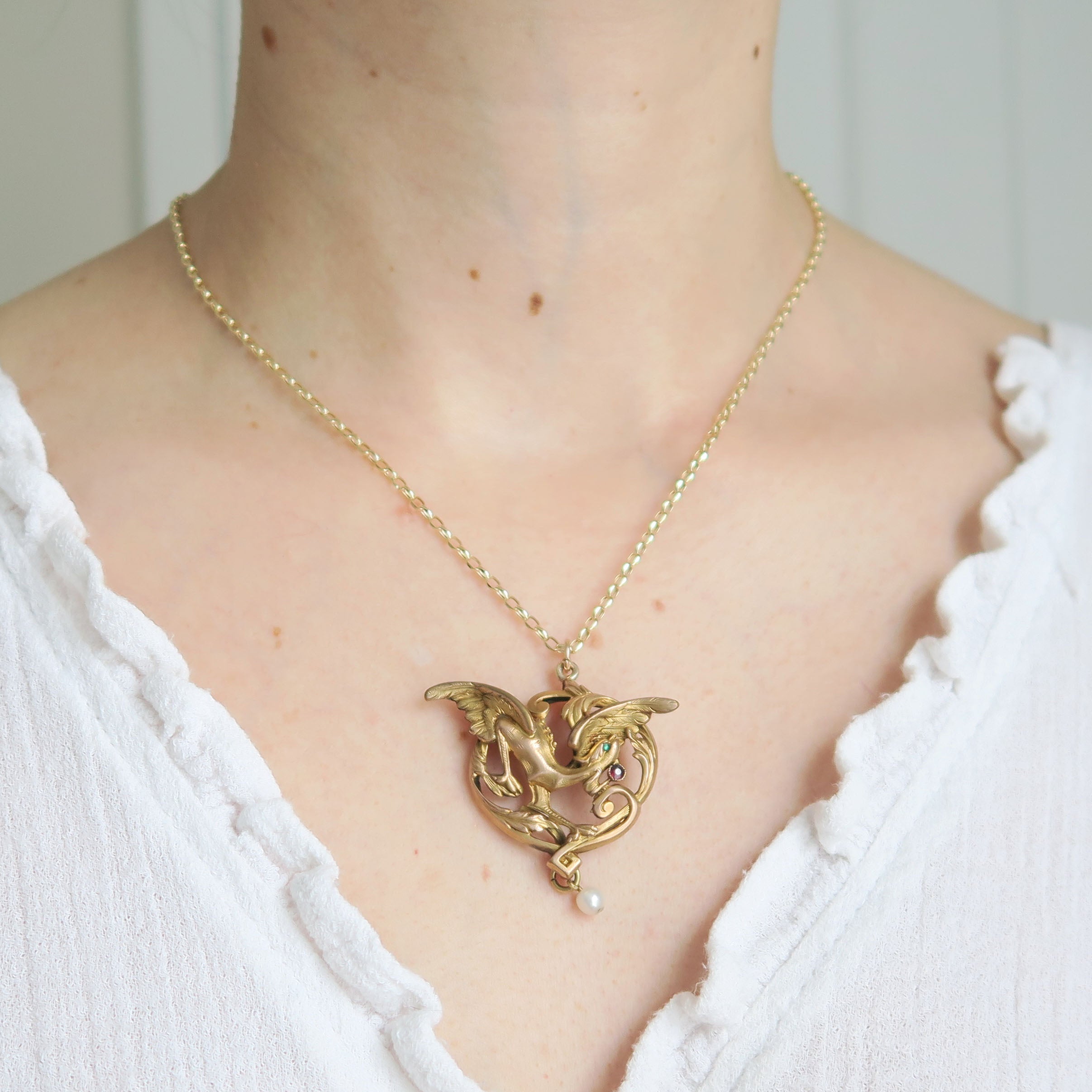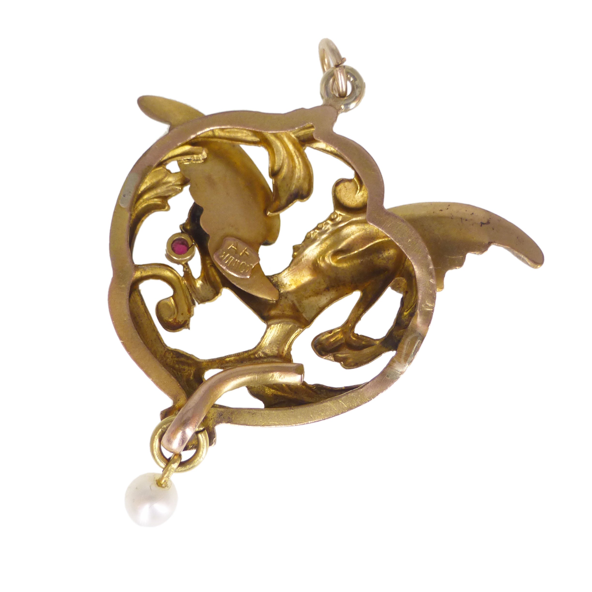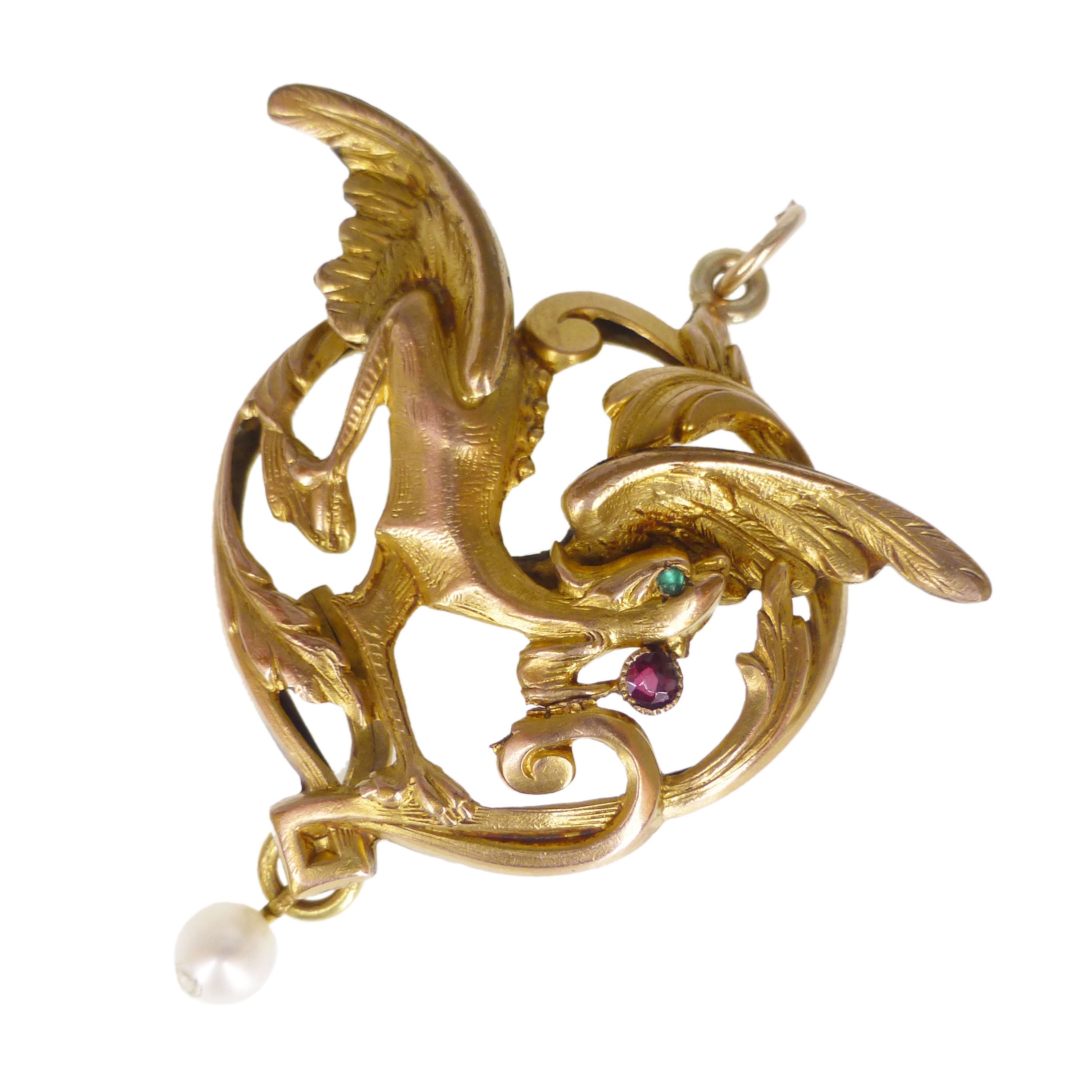 A wonderful Art Nouveau pendant that has been converted from a brooch. The gold plated pendant features a beautifully detailed mythical winged dragon studded with a green and red paste stone with a little faux pearl drop hanging from the centre.