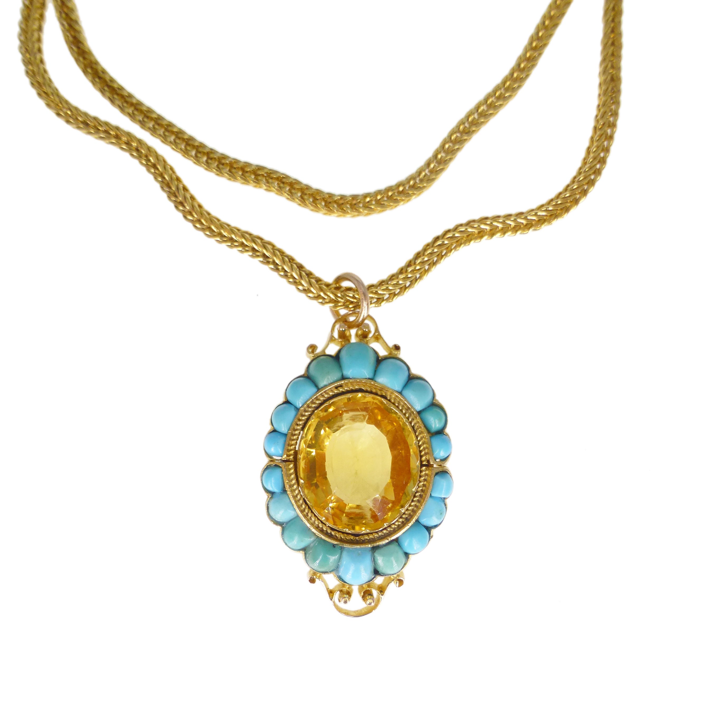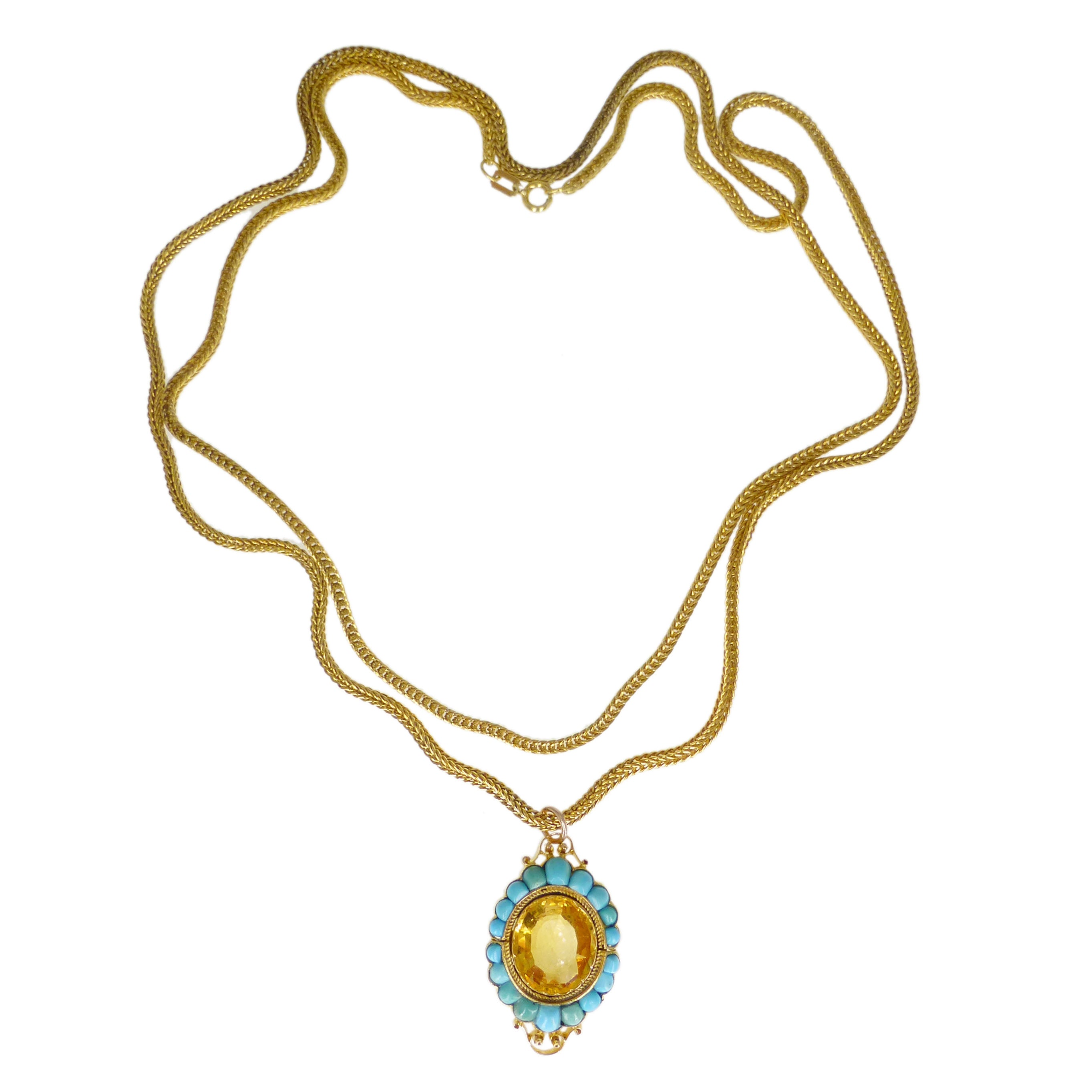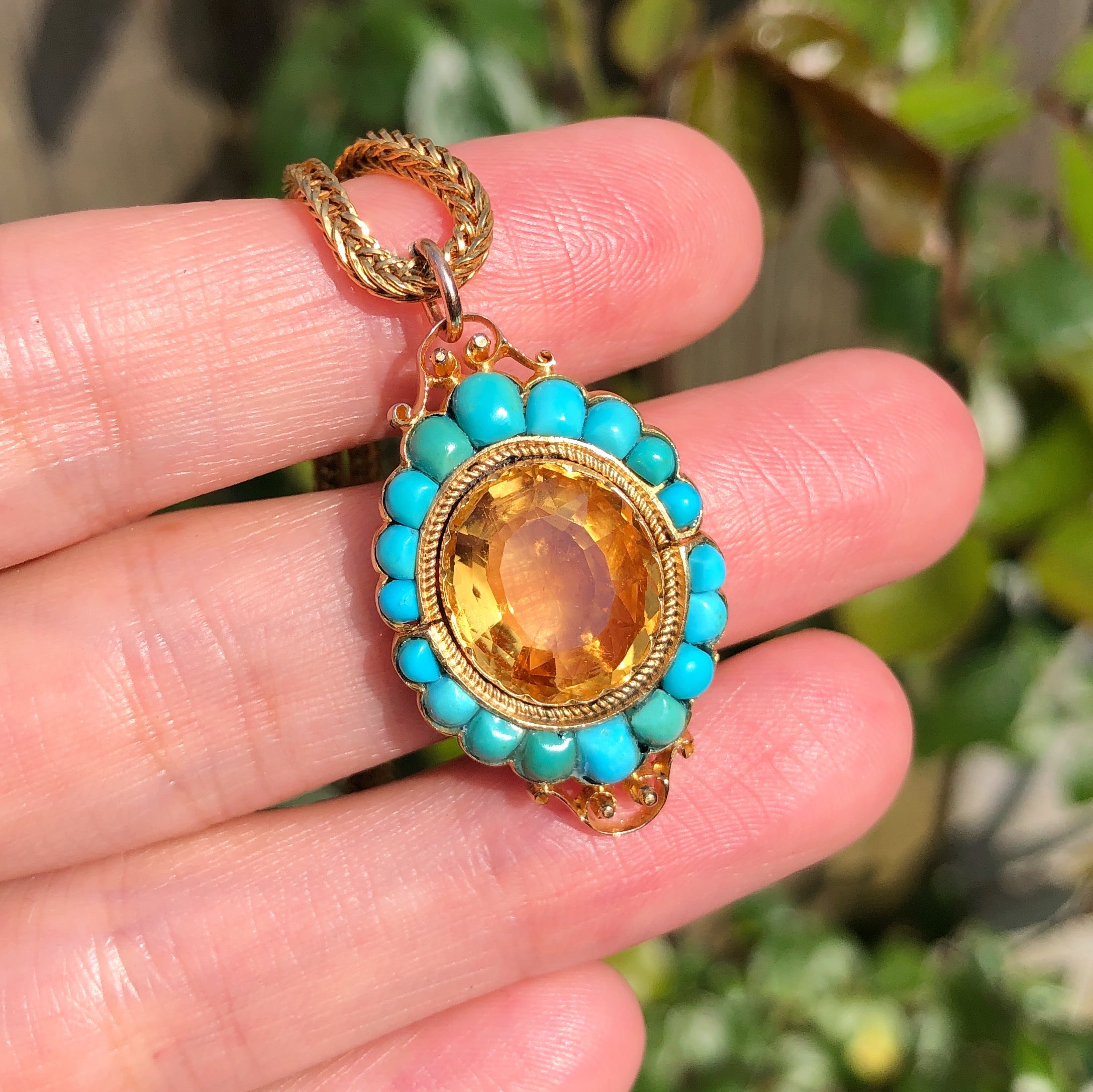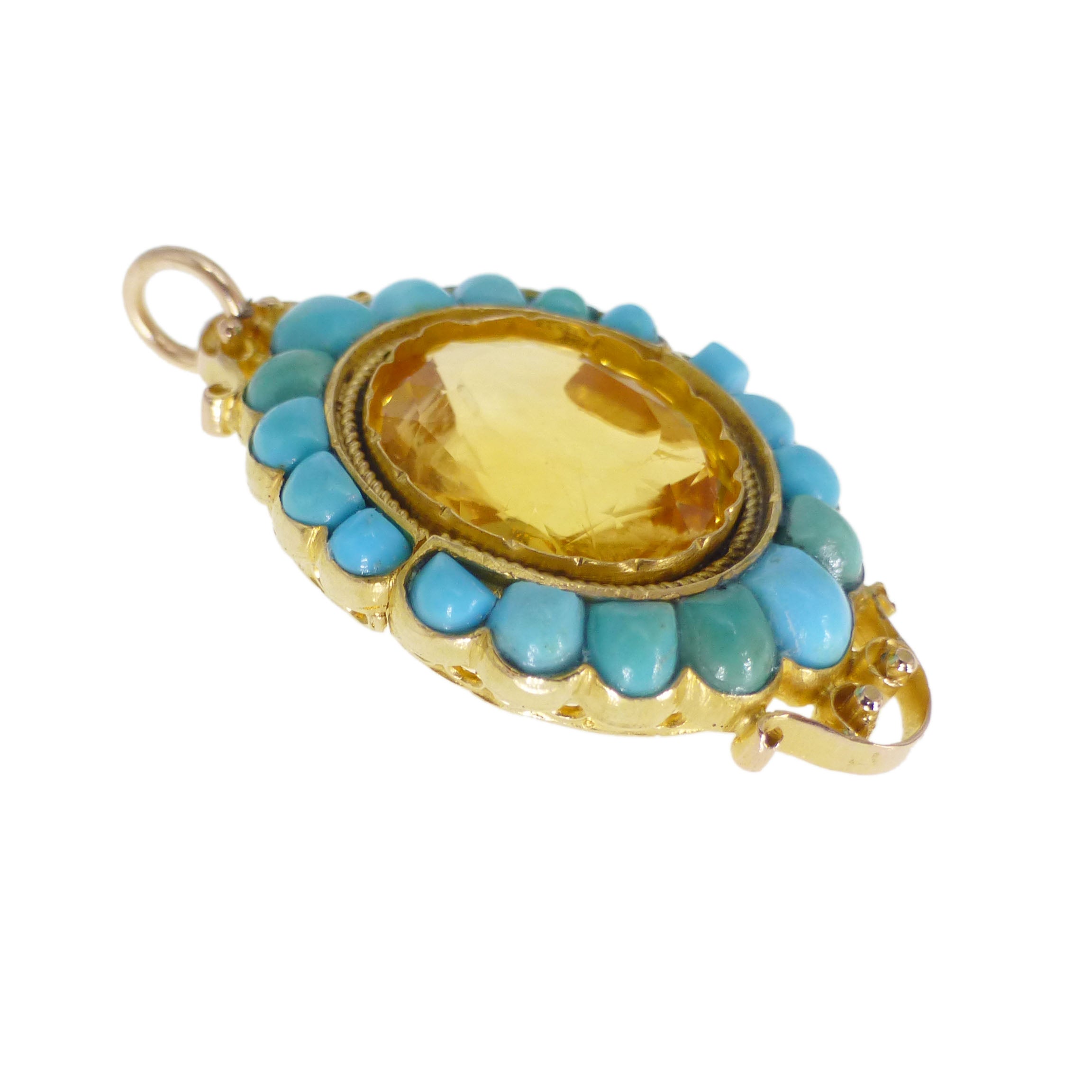 A beautiful antique high carat gold pendant featuring a large faceted citrine framed by carved turquoise stones. The piece is a bit of a mystery and was possibly part of a larger piece of jewellery at one point looking at the panels on the base of the piece.