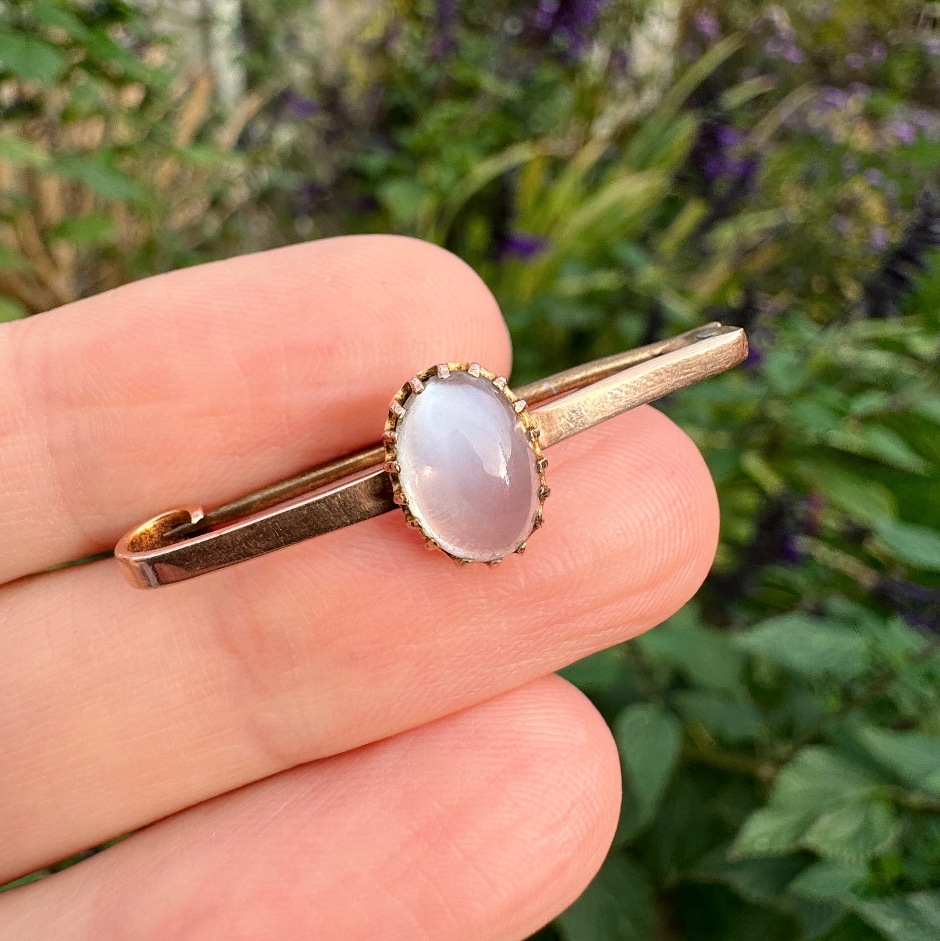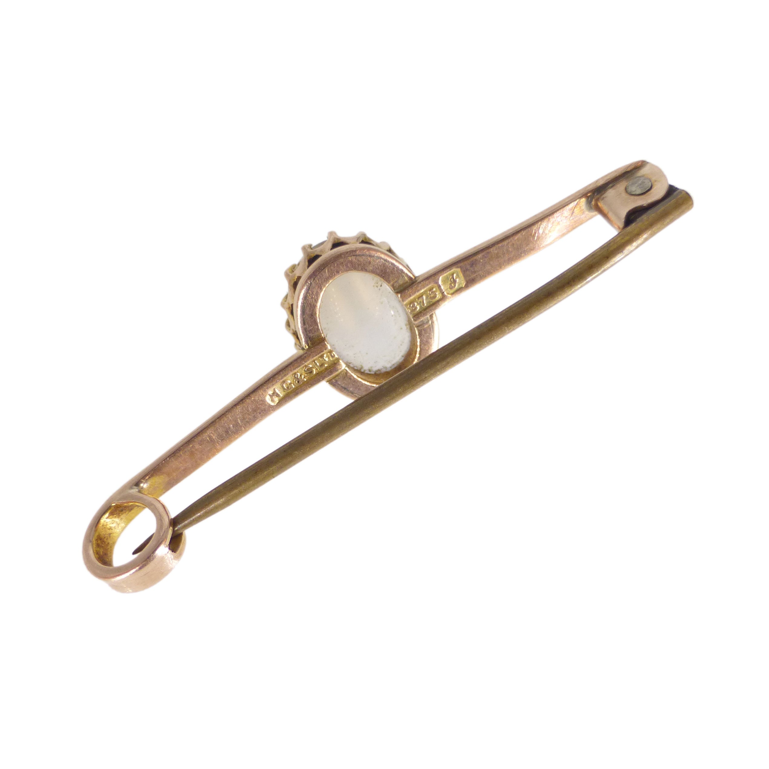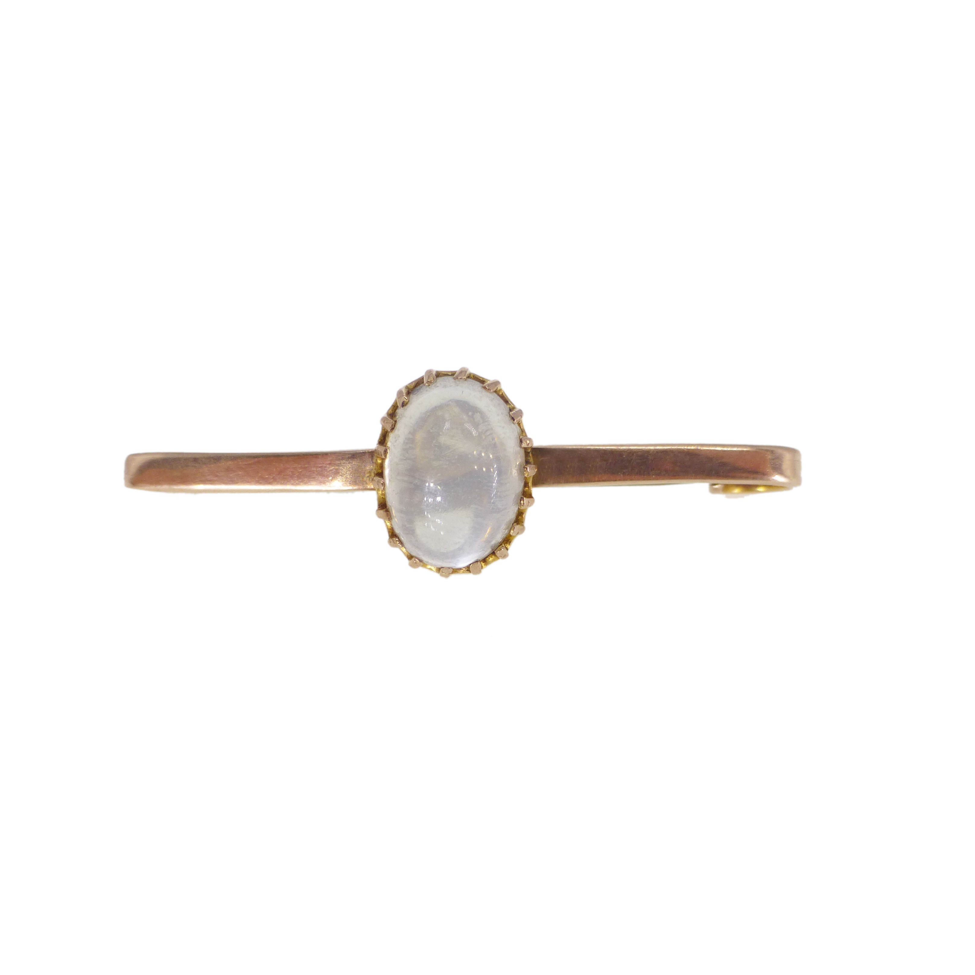 A lovely vintage 9ct gold bar brooch featuring an oval moonstone at its centre.