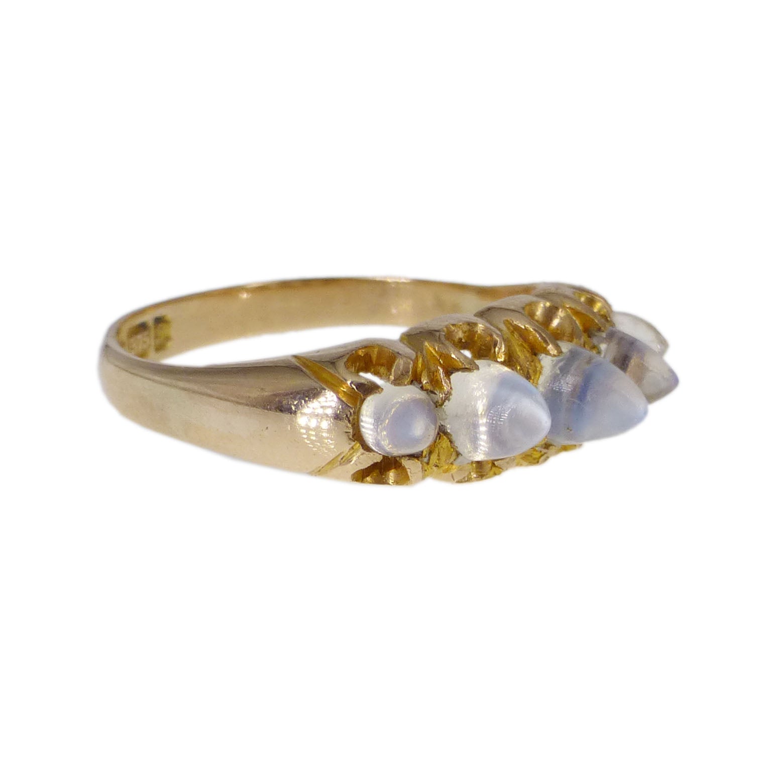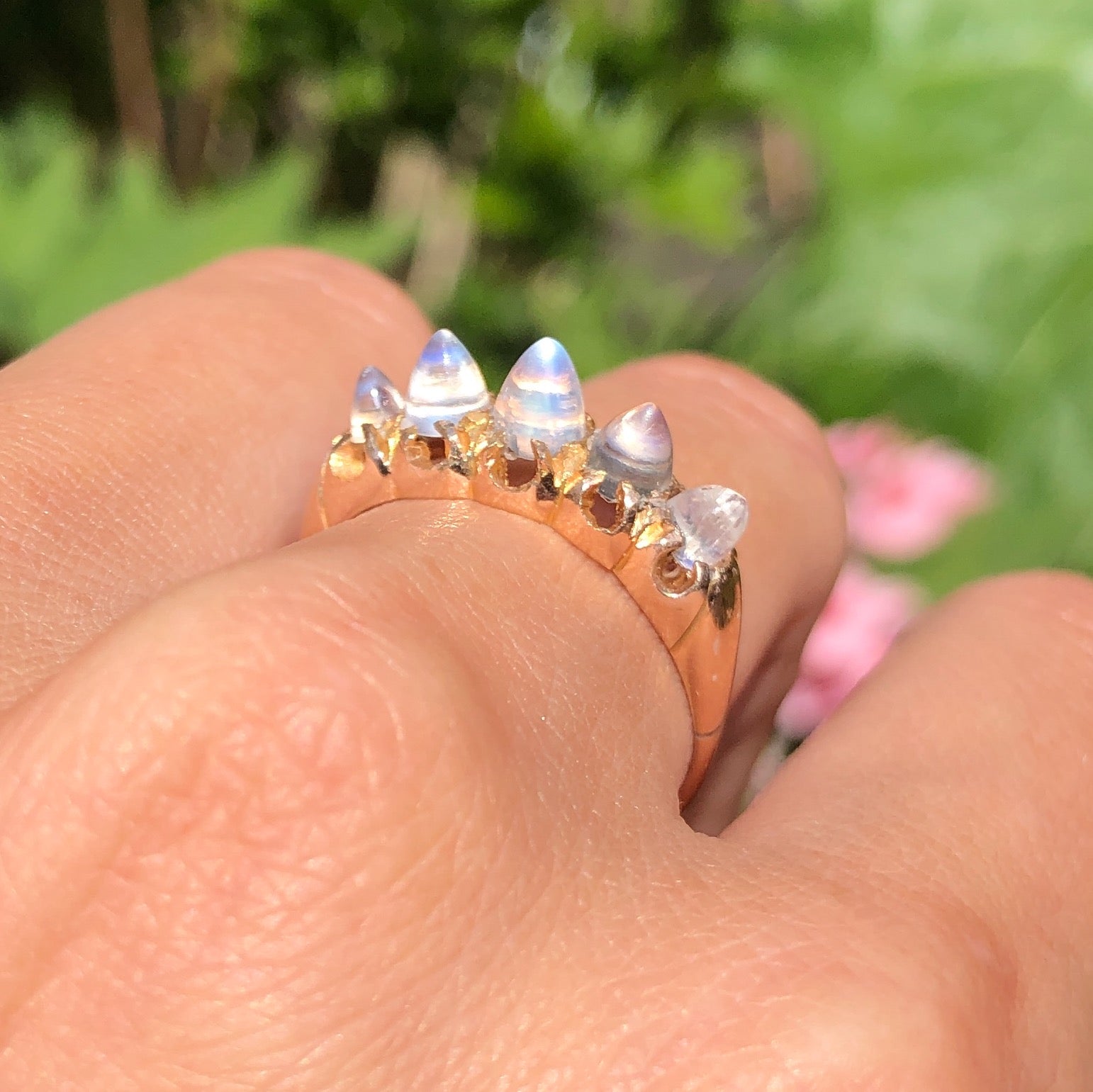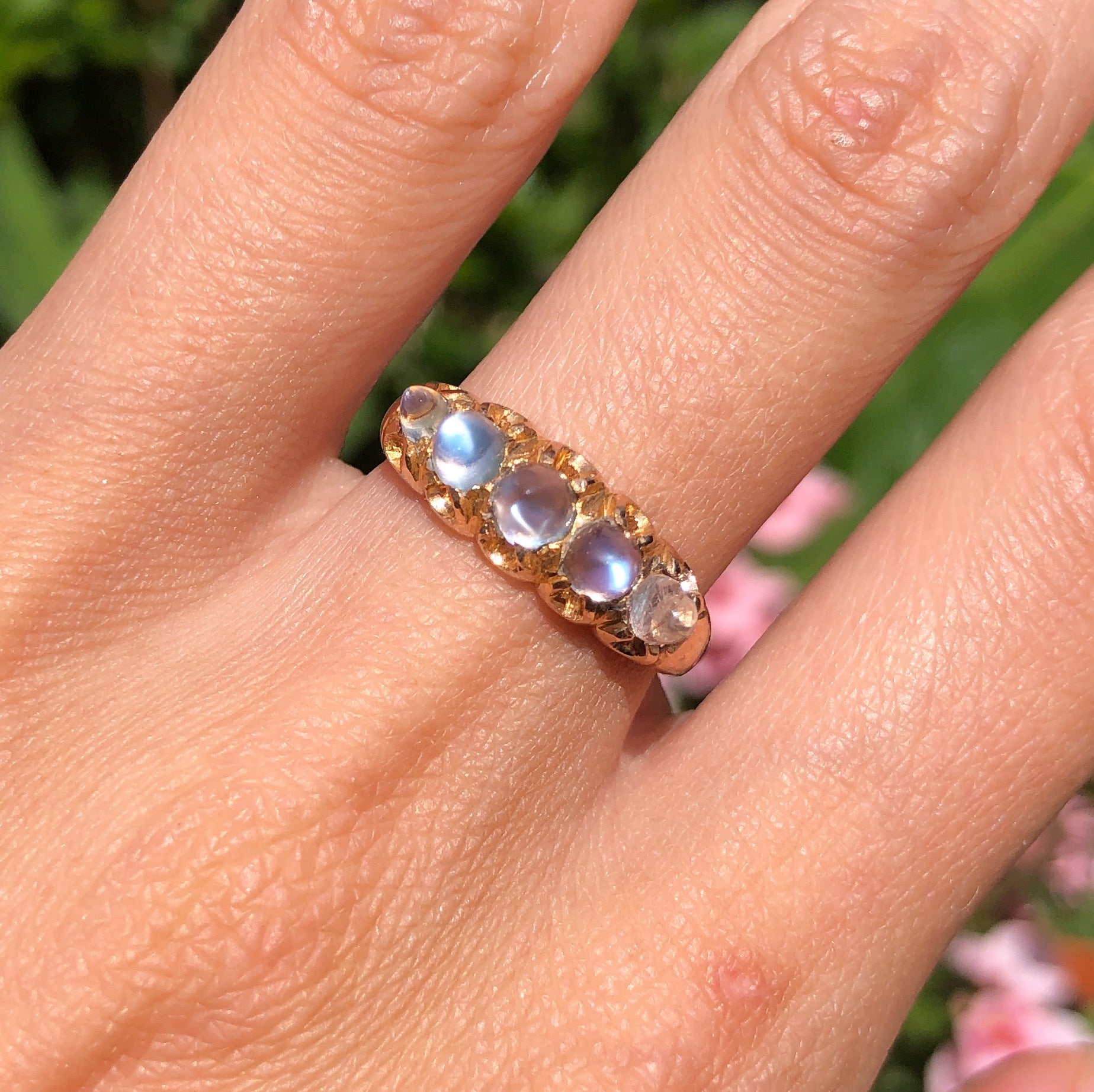 One of the moonstones on the outer corner differs slightly in colour and clarity and has most likely been replaced at some point. The ring remains in good antique condition overall.