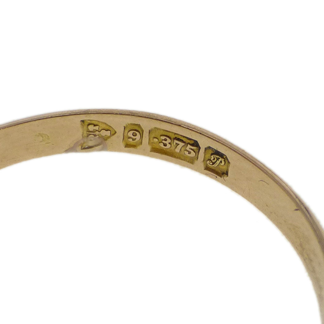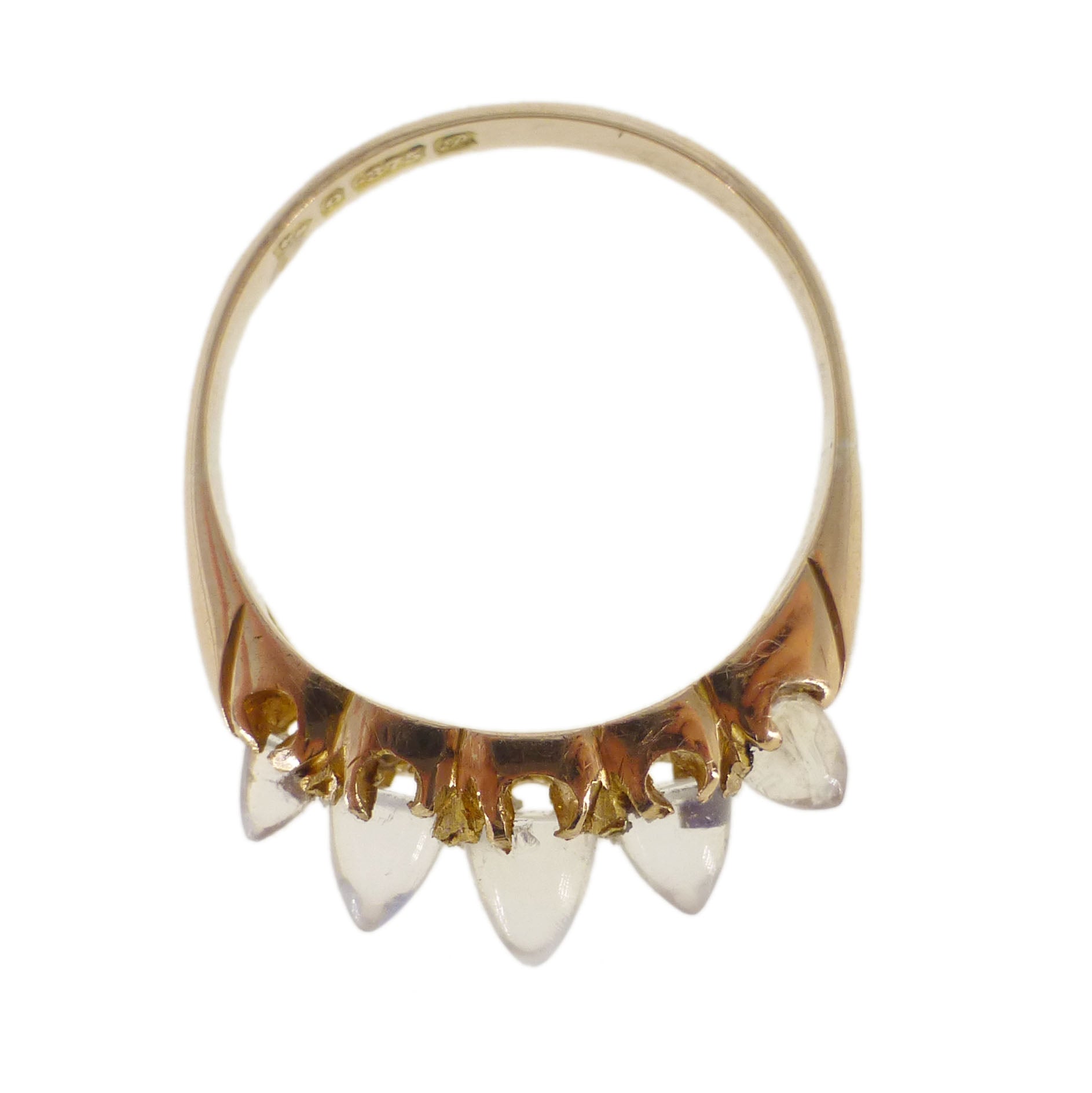 The 9ct gold band is set with five moonstones in an unusual bullet shape. The ring features a Chester assay mark along with full hallmarks on the inside of the ring band.