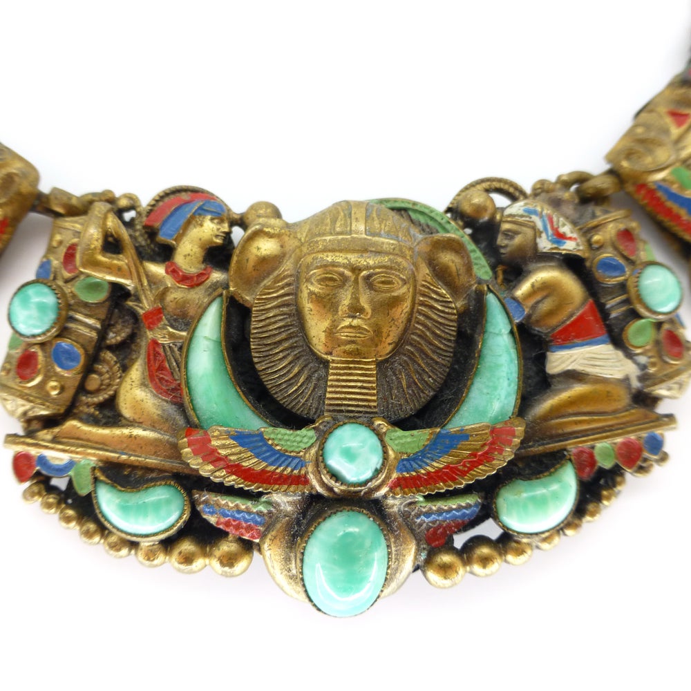 An exceptional piece of historic jewellery by the Neiger Brothers. The Egyptian revival necklace features gold metal panels set with pharaohs and Egyptian figures.