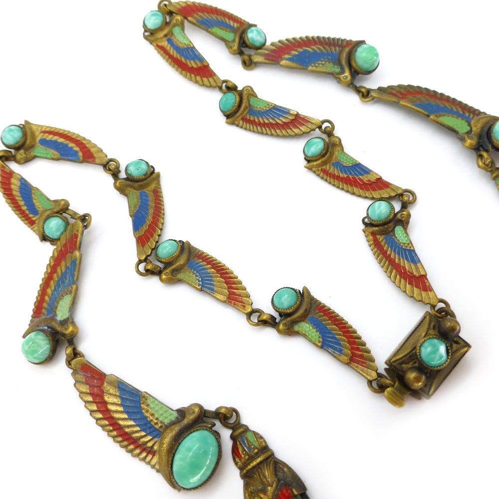 Antique Art Deco Neiger Egyptian Revival Pharaoh Peking Glass Winged Necklace