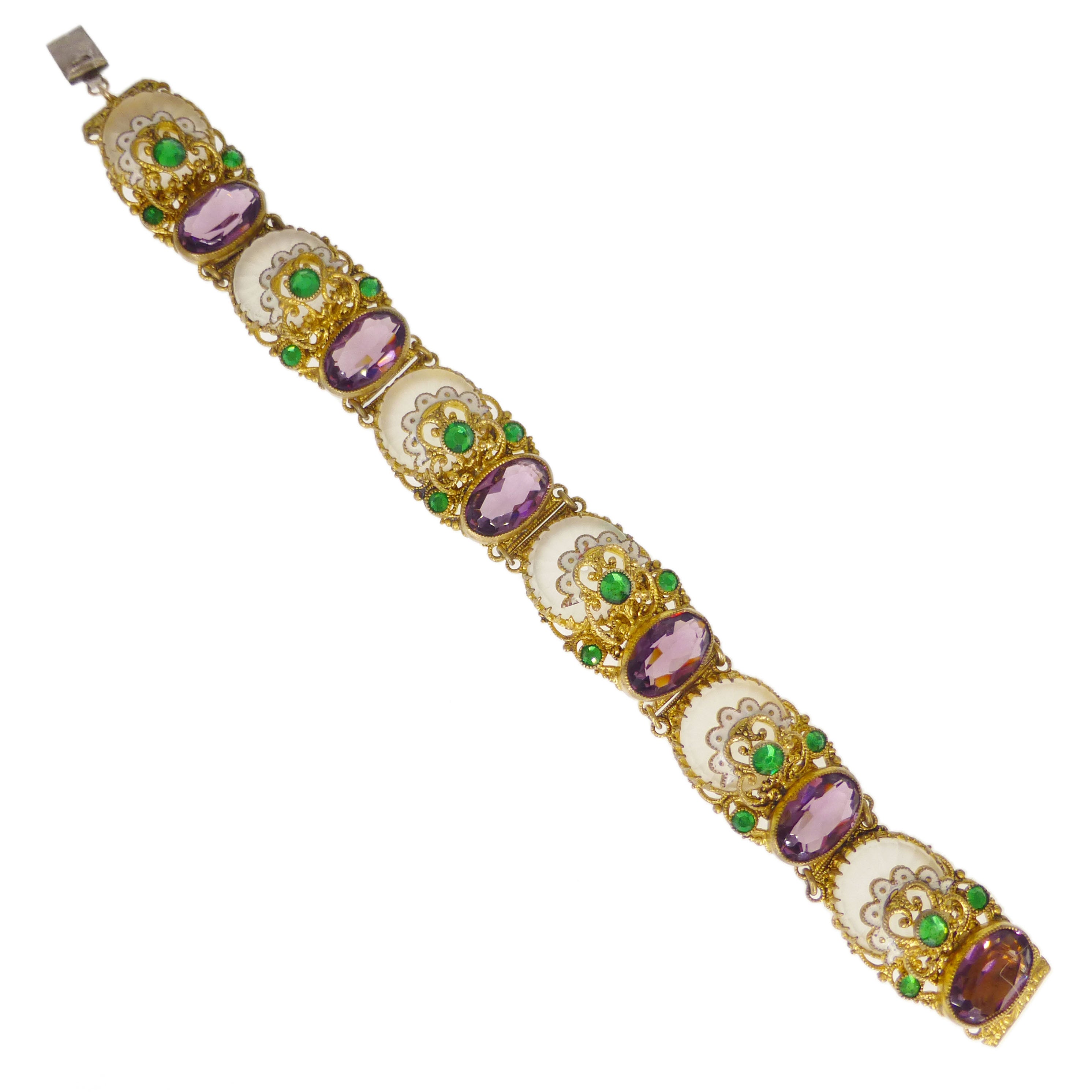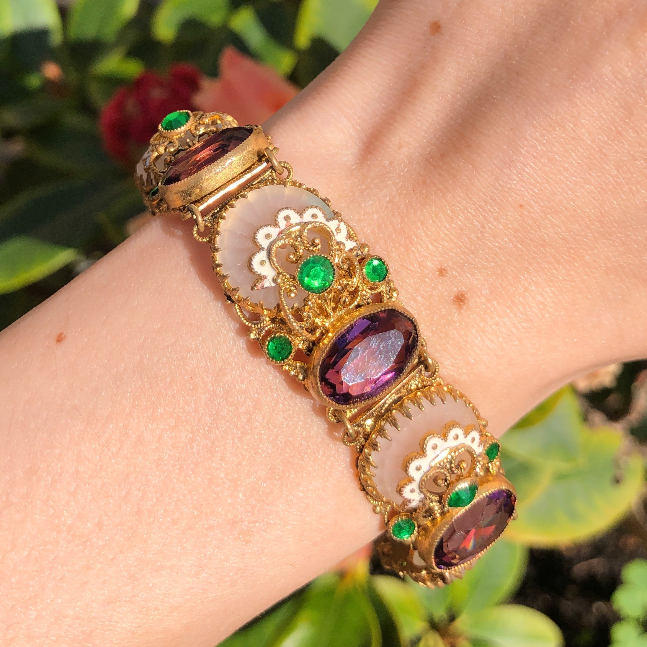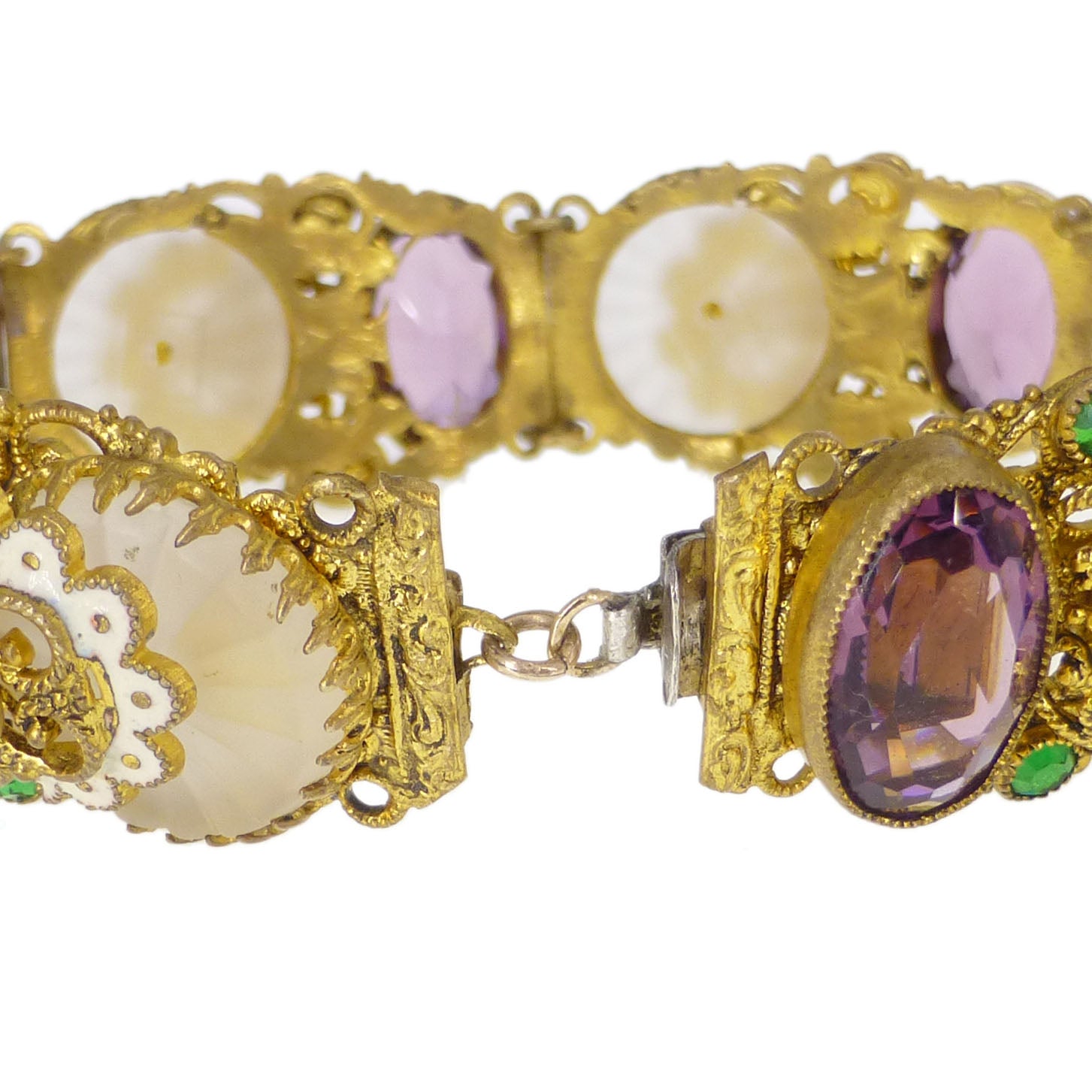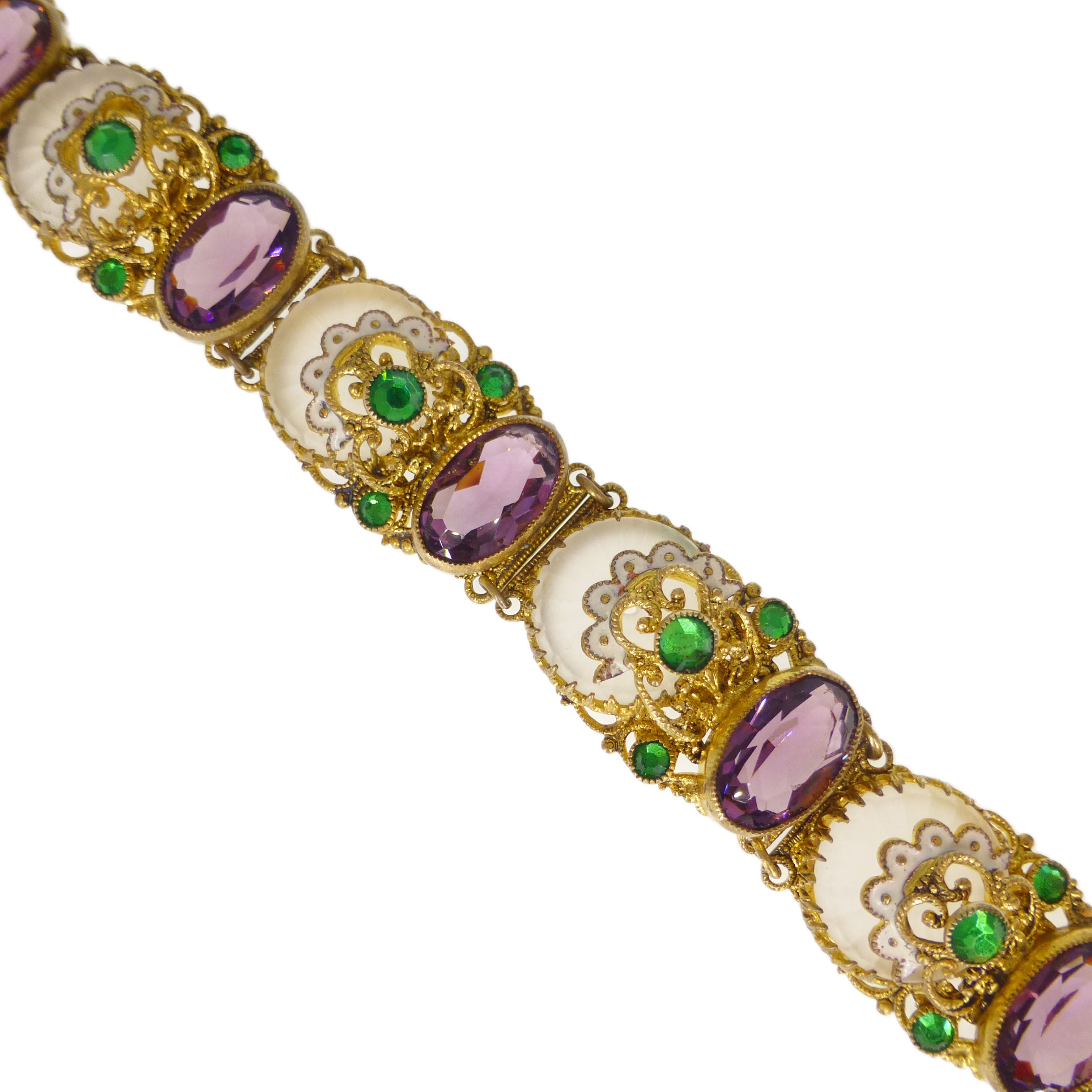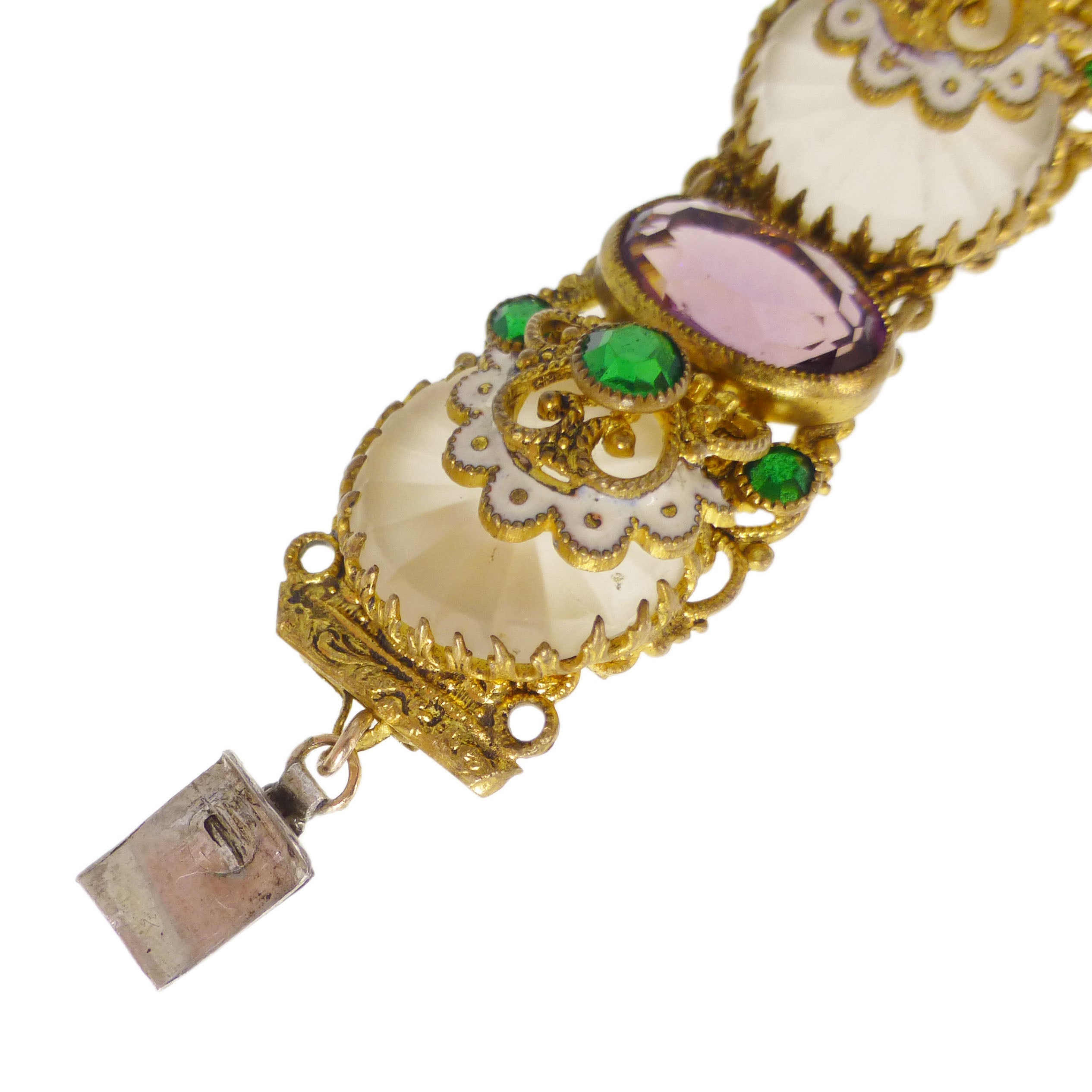 The bracelet features detailed filigree panels set with white camphor glass pieces with enamel detailing and purple and green rhinestones layered over each stone.
