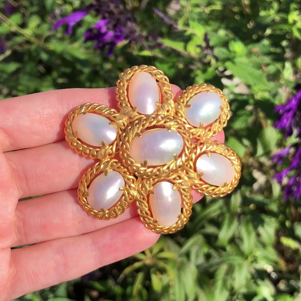 Vintage French Mother Of Pearl Gold Tone Brooch