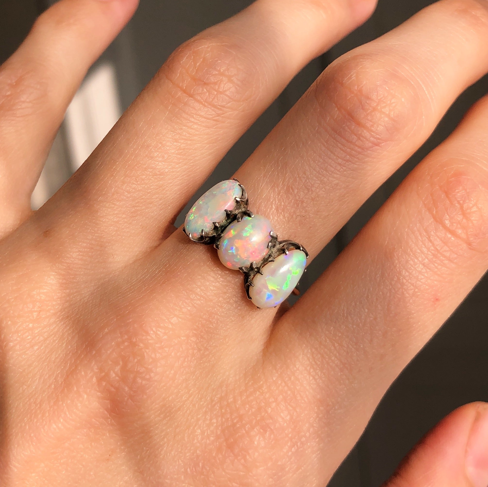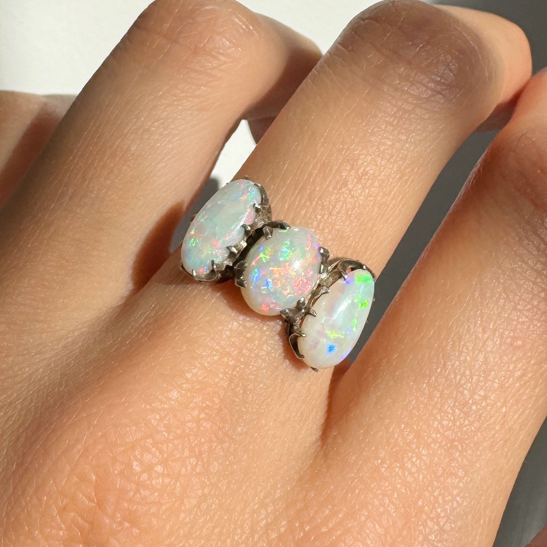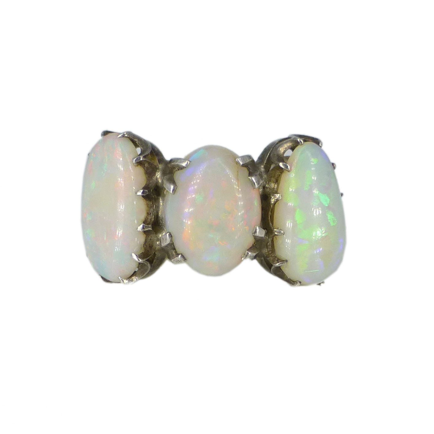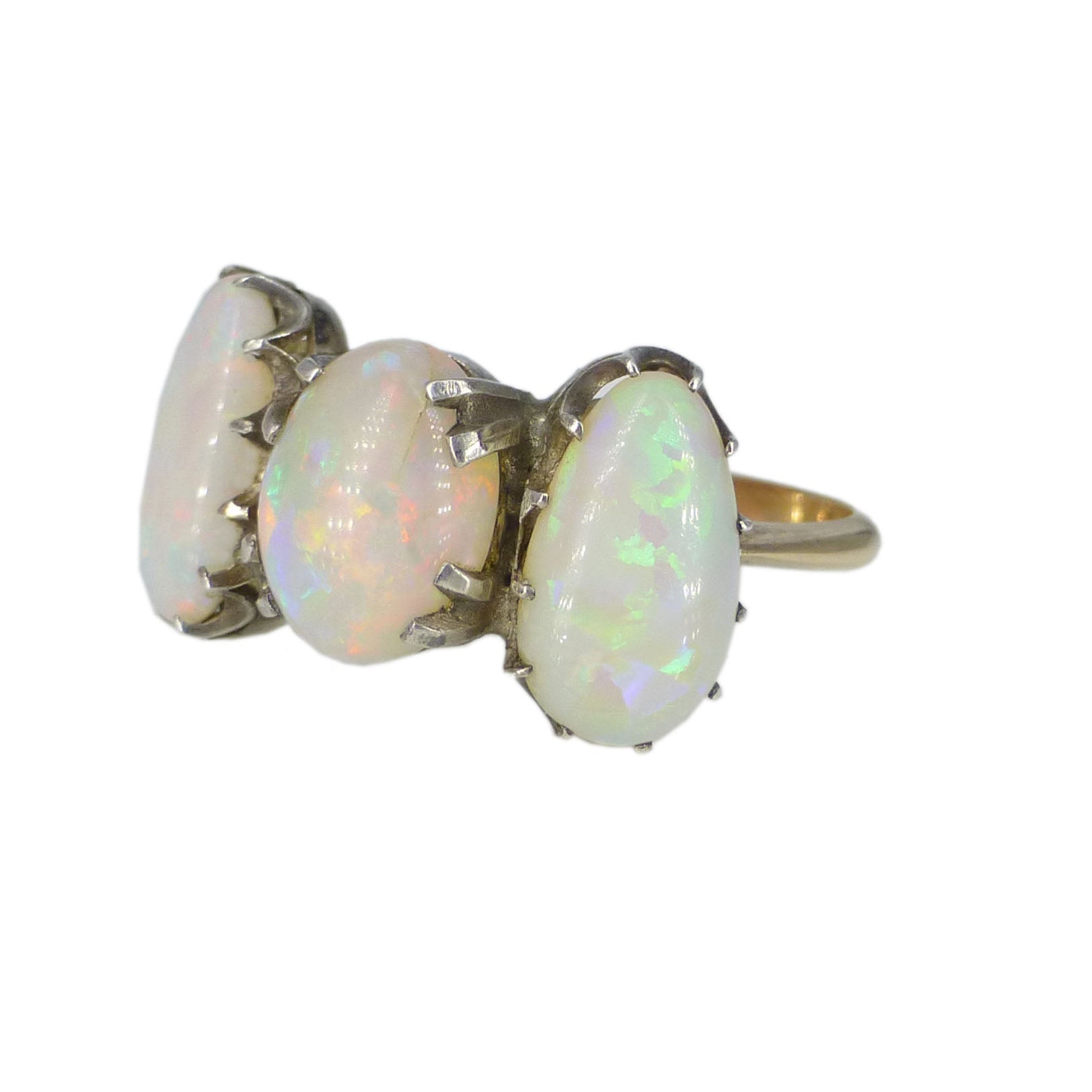 An exceptional antique trilogy ring dating to the early 20th Century. The ring is set with three large natural opal stones in a bow style formation. Each opal is prong set into an open backed silver frame attached to a 15ct gold band.