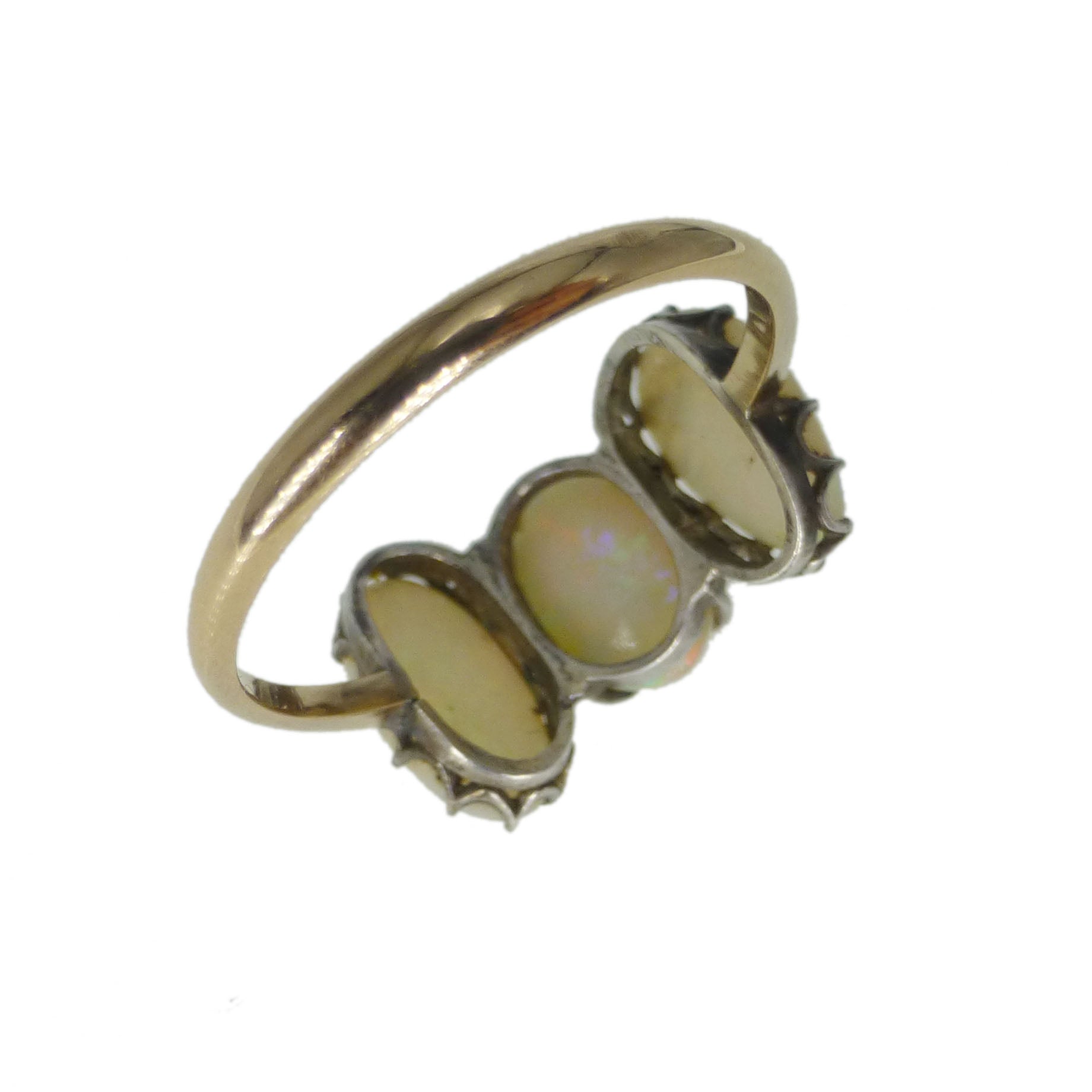 There is a tiny craze to the upper right corner of the central opal. The ring remains in good antique condition overall.