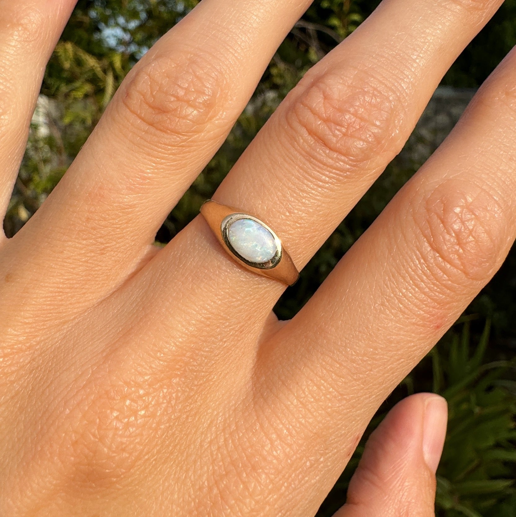 A lovely little 9 carat gold ring in a timeless design. The ring is set with an oval Australian opaline a receding gold band.
