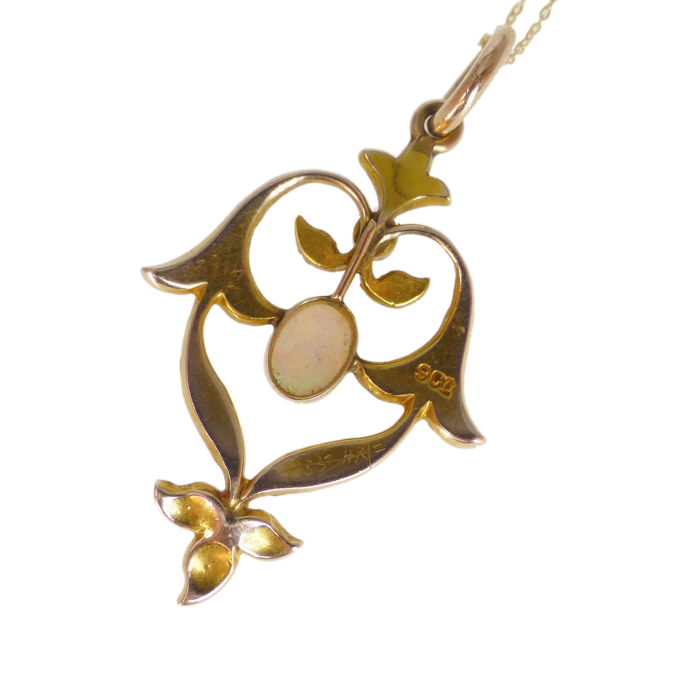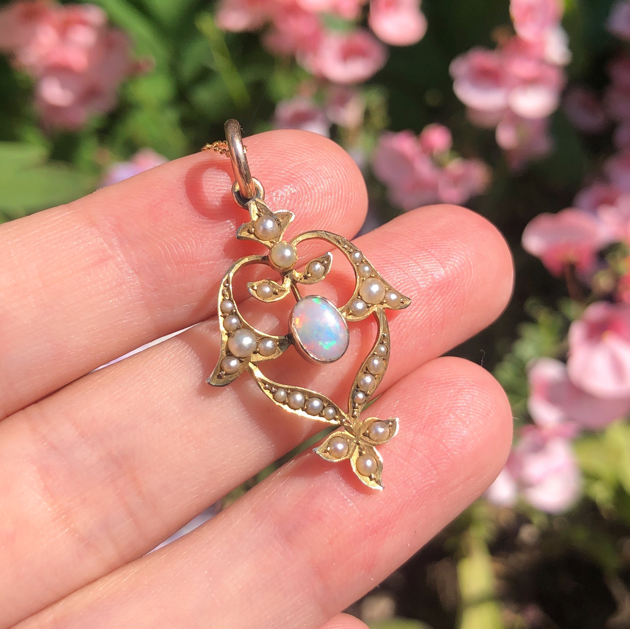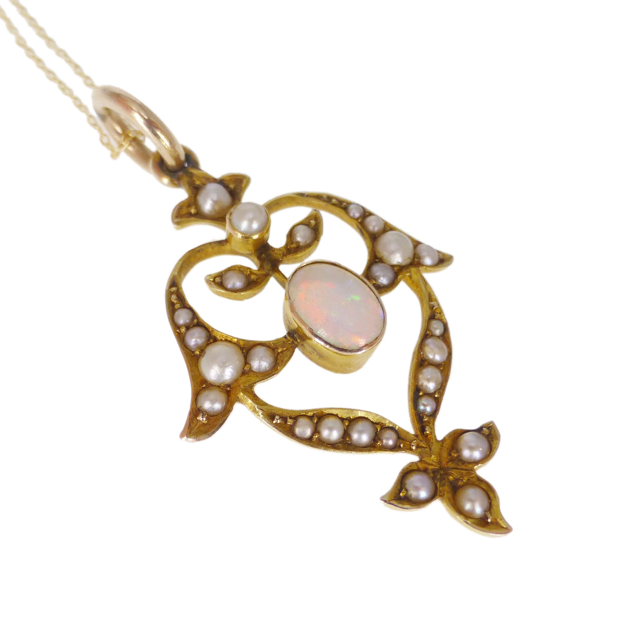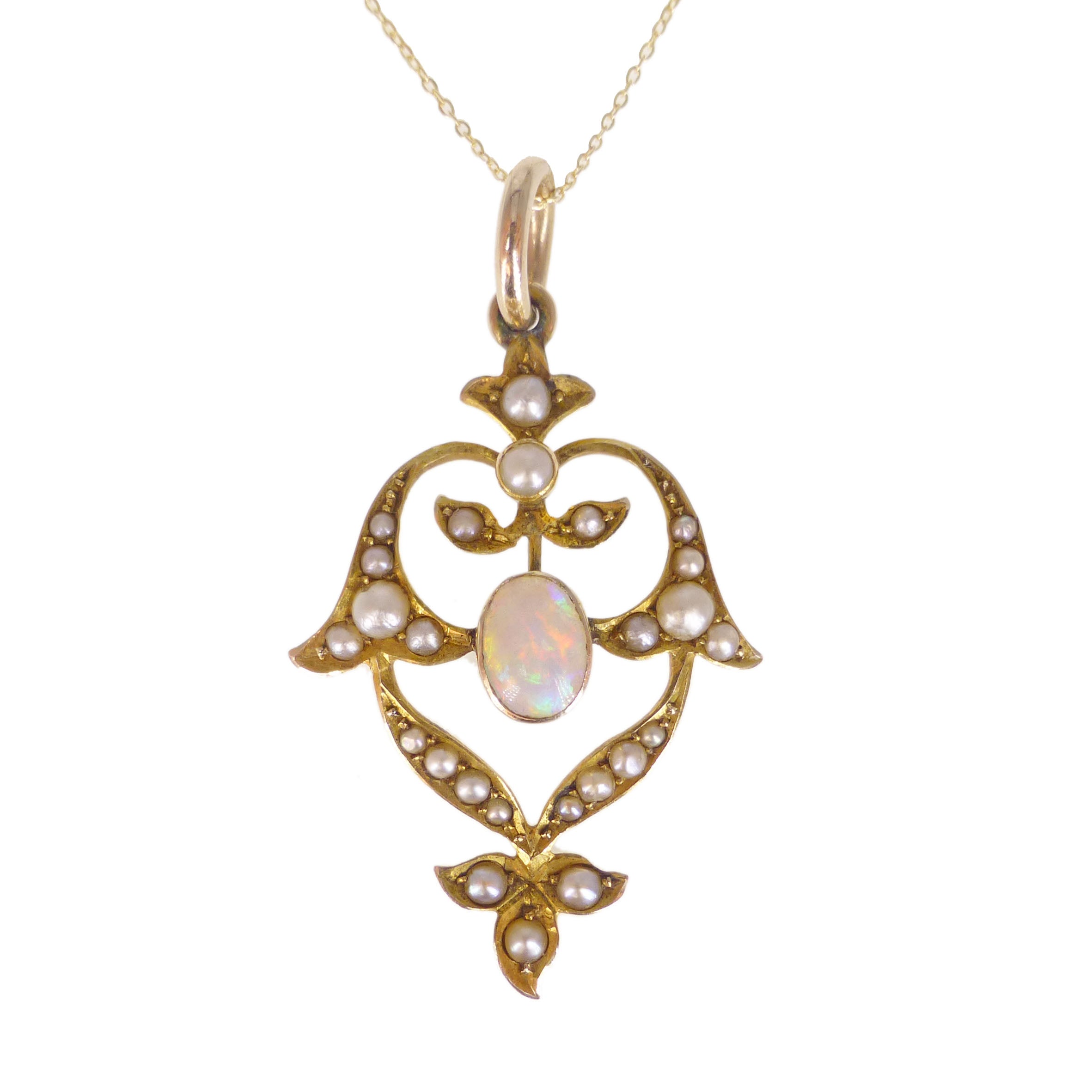 A lovely antique 9 carat gold pendant dating to the Art Nouveau period. The pendant is studded with split pearls with a colourful opal at its centre.