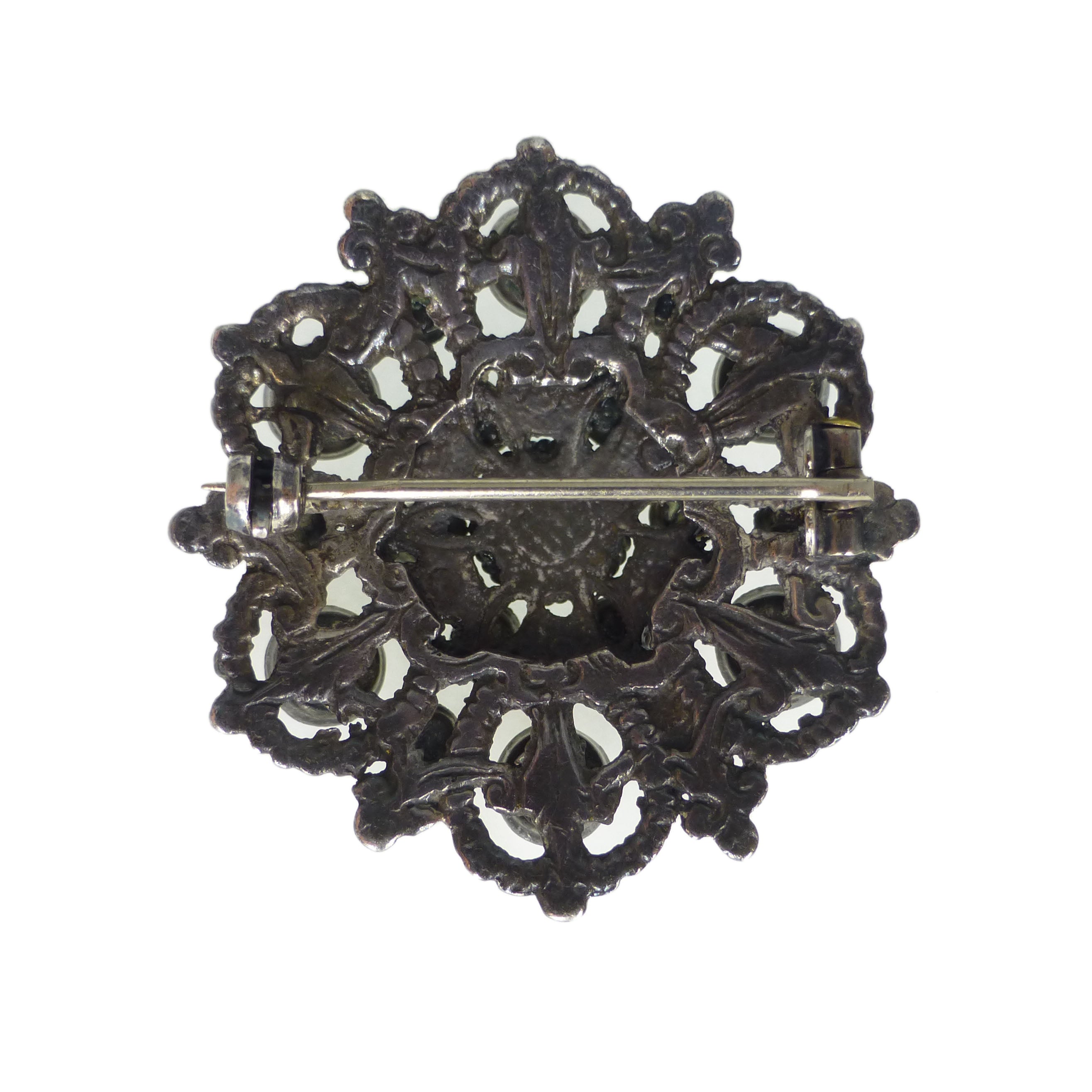 The brooch is not hallmarked but tests as continental silver and features a secure roll over clasp.