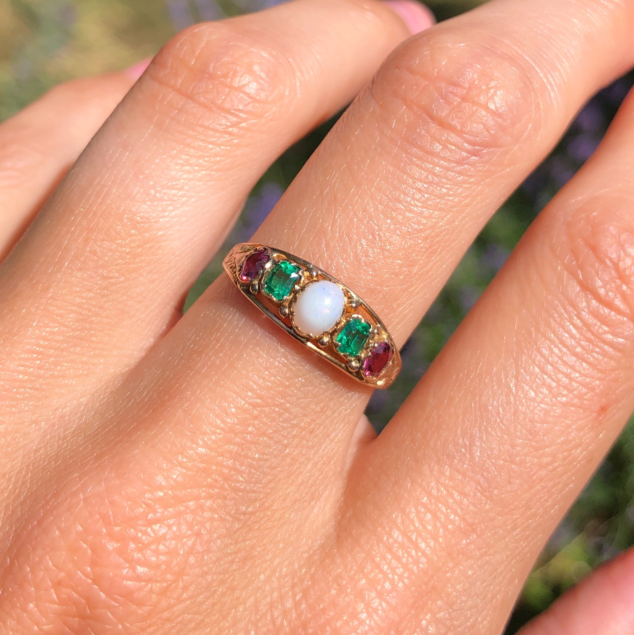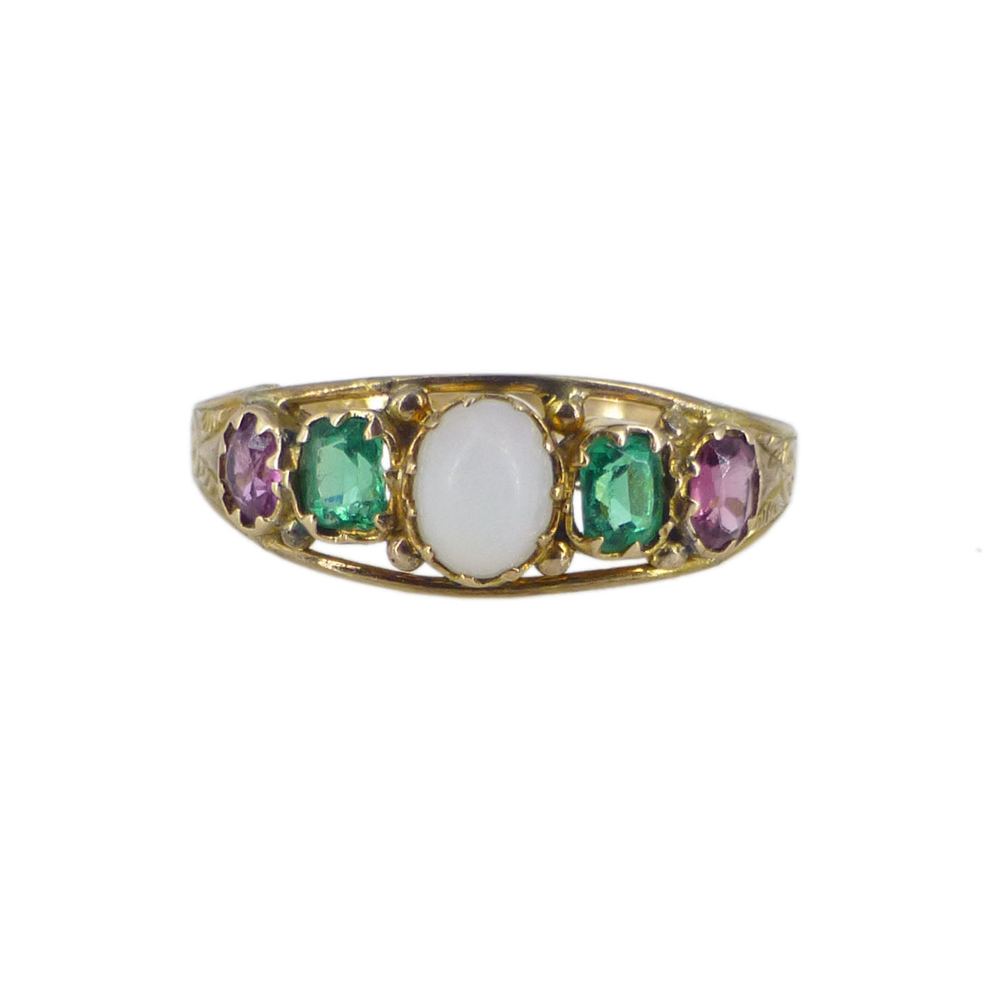 The ring features an ornate engraved band with a pale opal stone at its centre framed by two lovely emerald green glass stones and two little amethysts.
