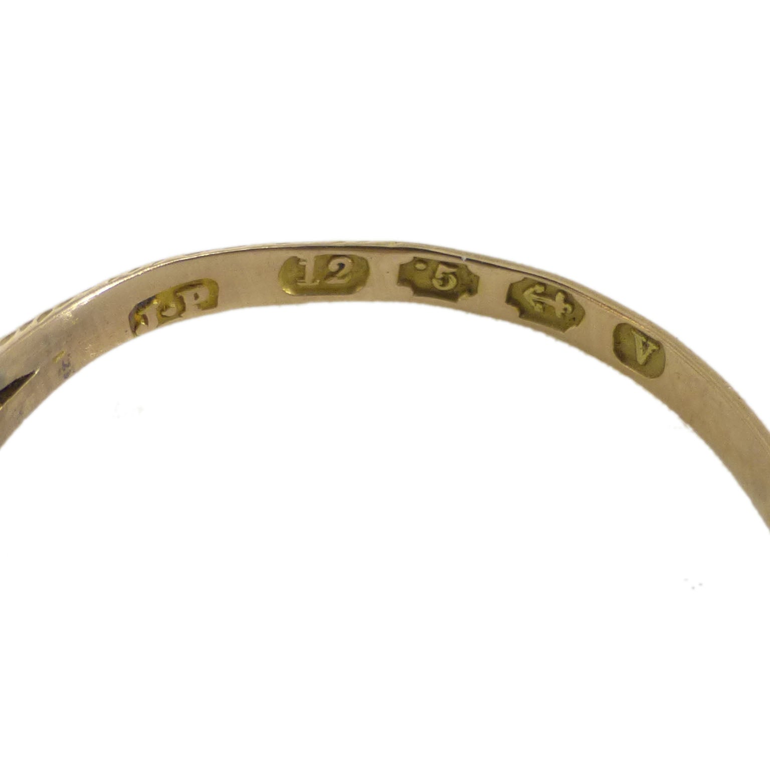 The ring is fully hallmarked on the inside band with a Birmingham assay mark, date letter 'V' and makers mark J.P.