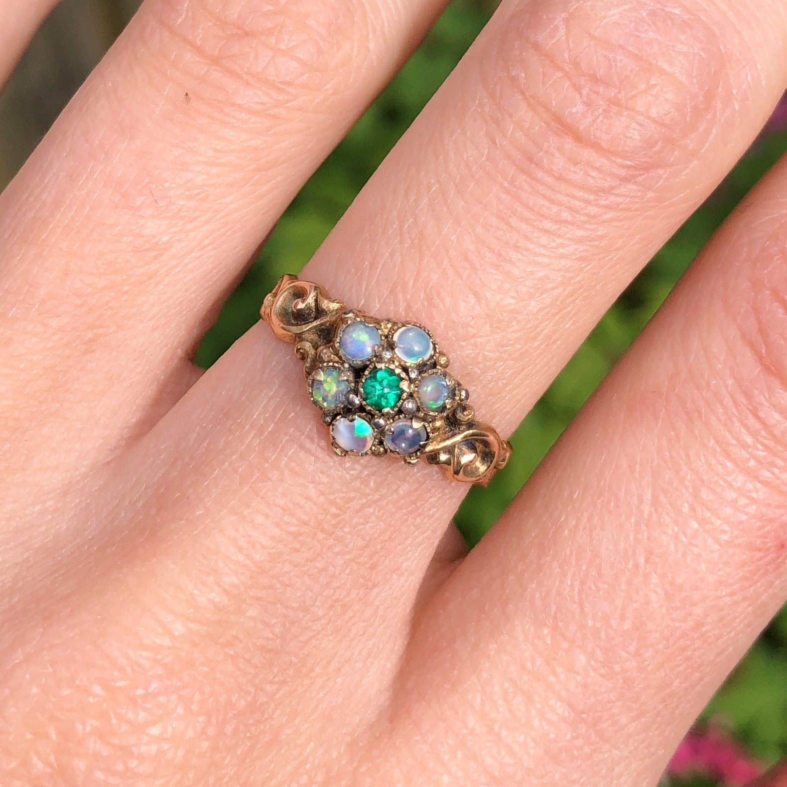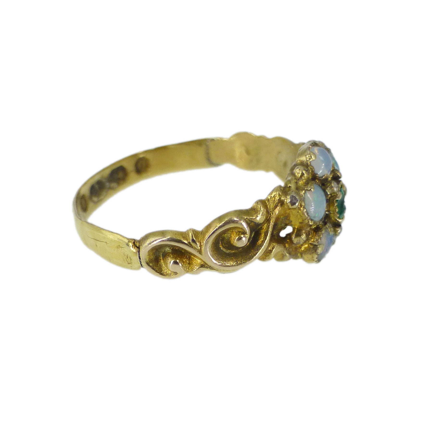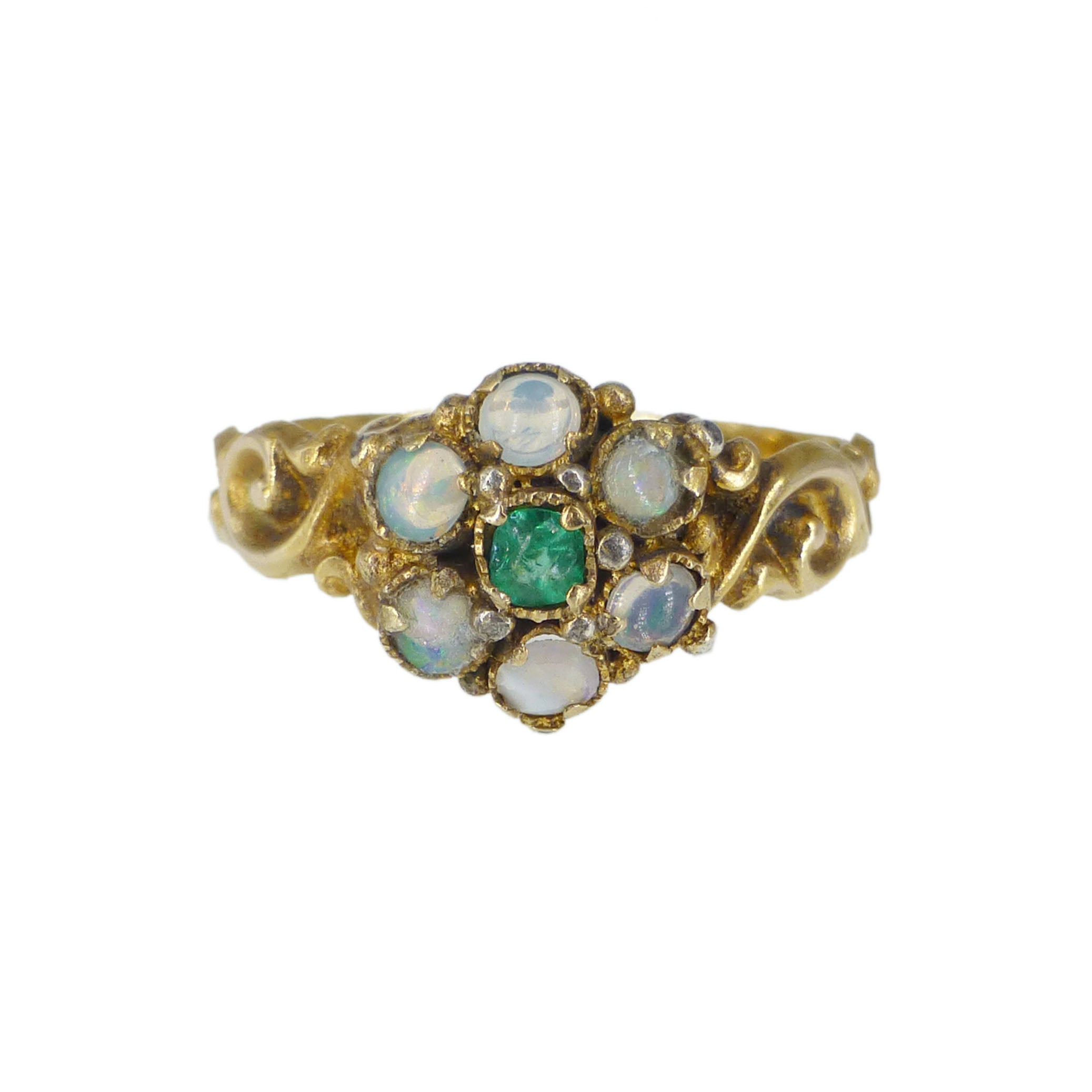 A wonderful antique english gold ring dating to 1865. The floral ring is set with little iridescent opals with a green glass stone its centre.