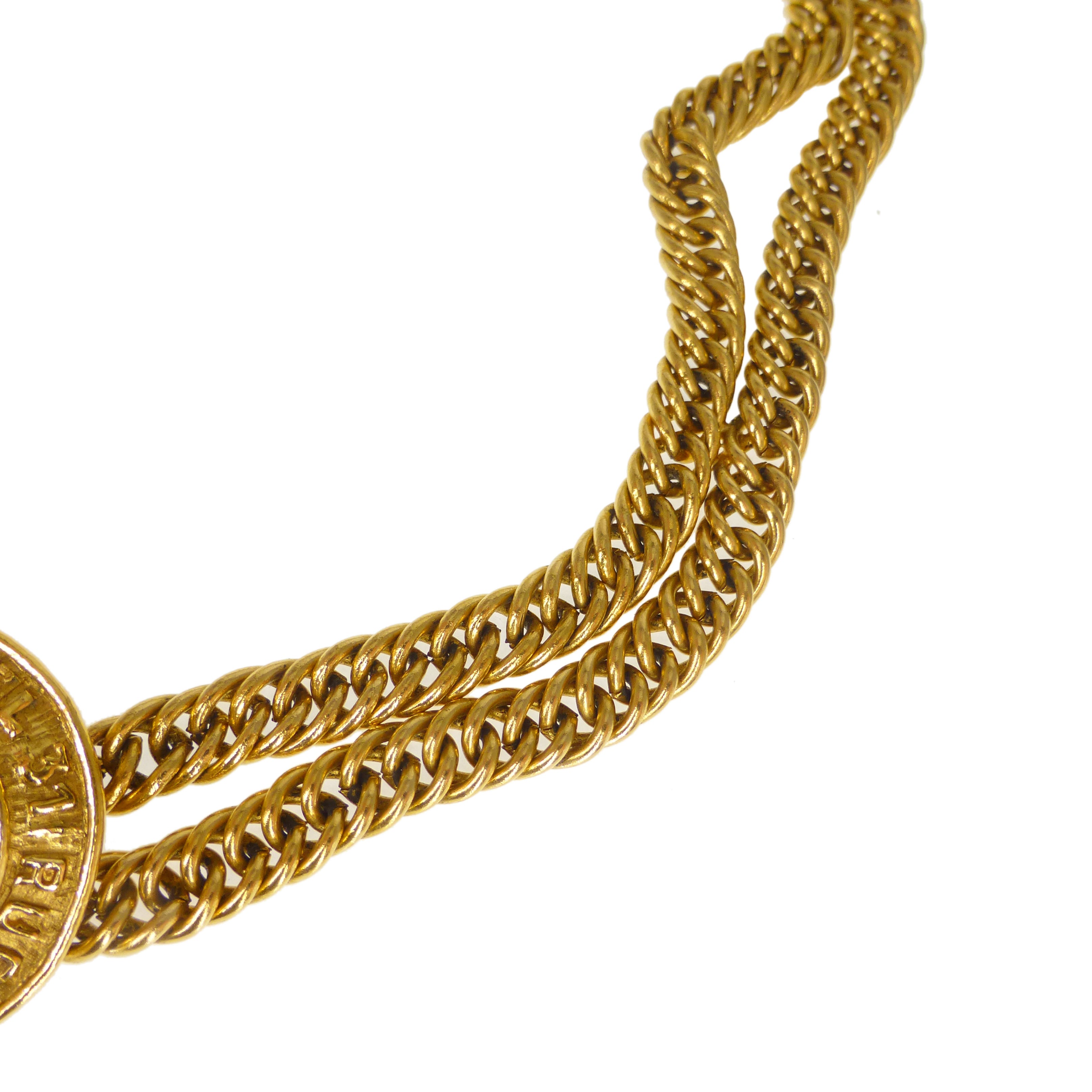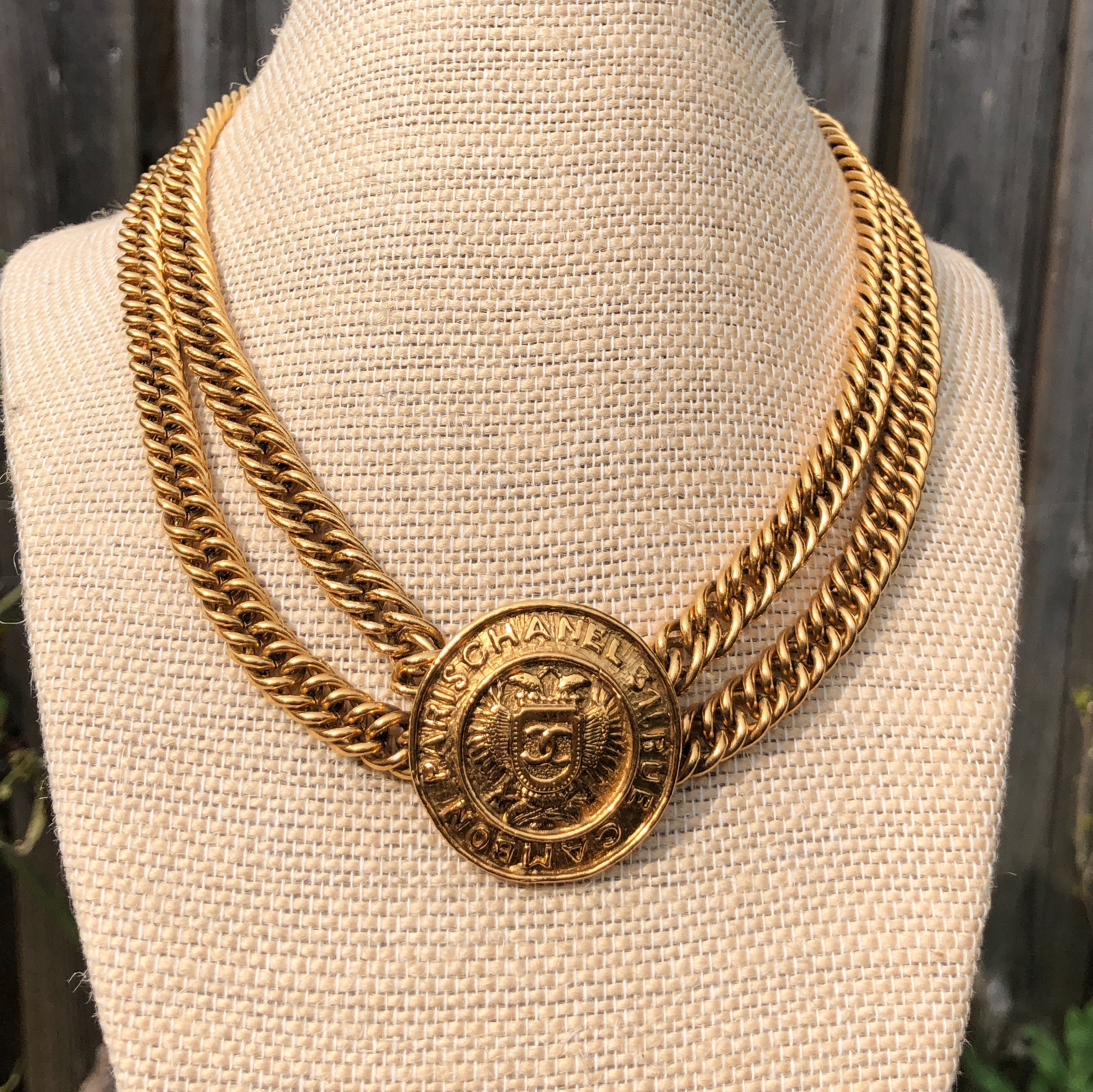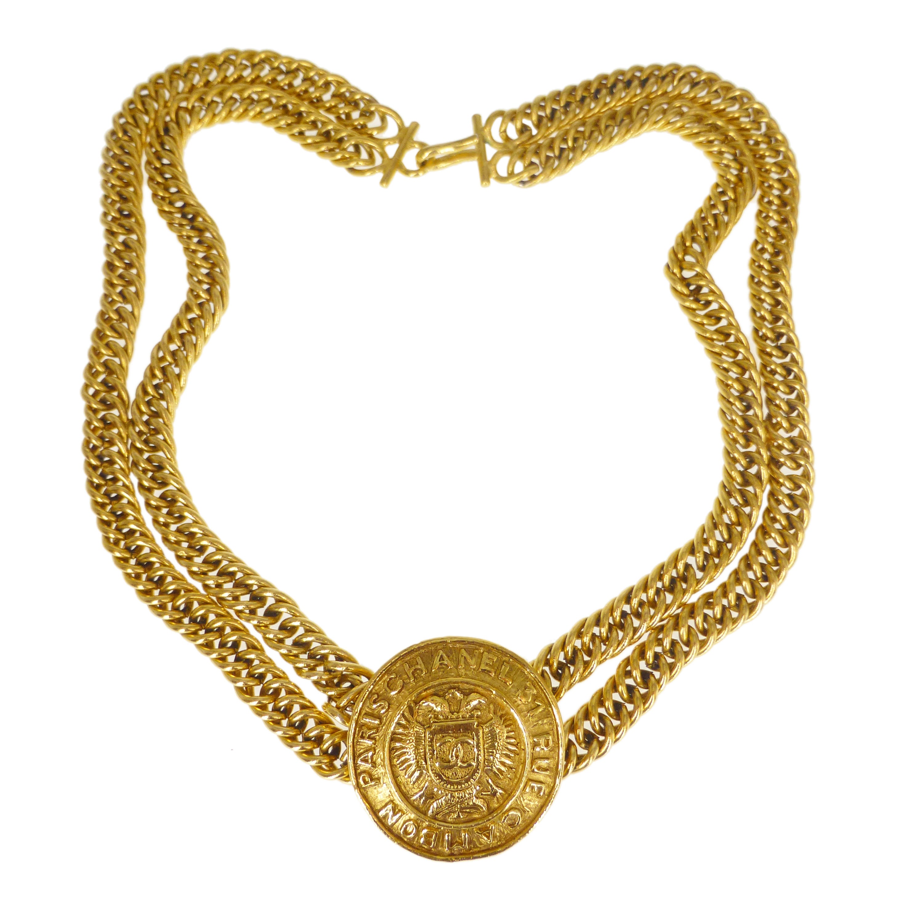 A beautiful vintage necklace by Chanel featuring gold plated double chain with a detailed medallion at its centre. The medallion is engraved 'Paris Chanel 31 Rue Cambon' and features a secure hook clasp.