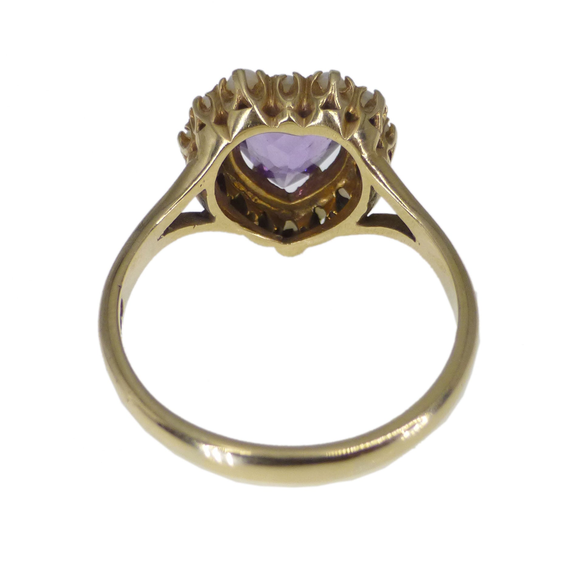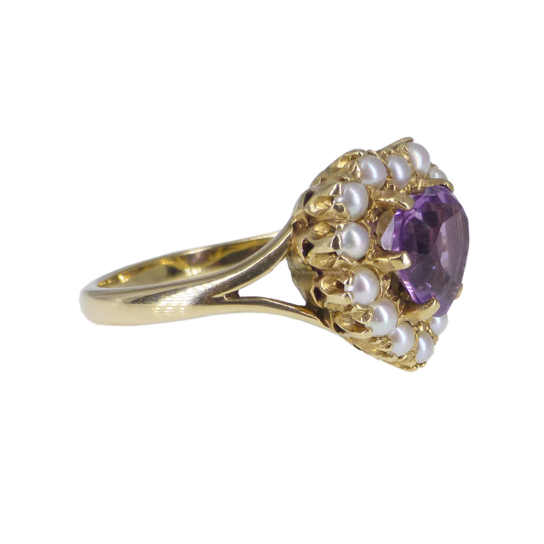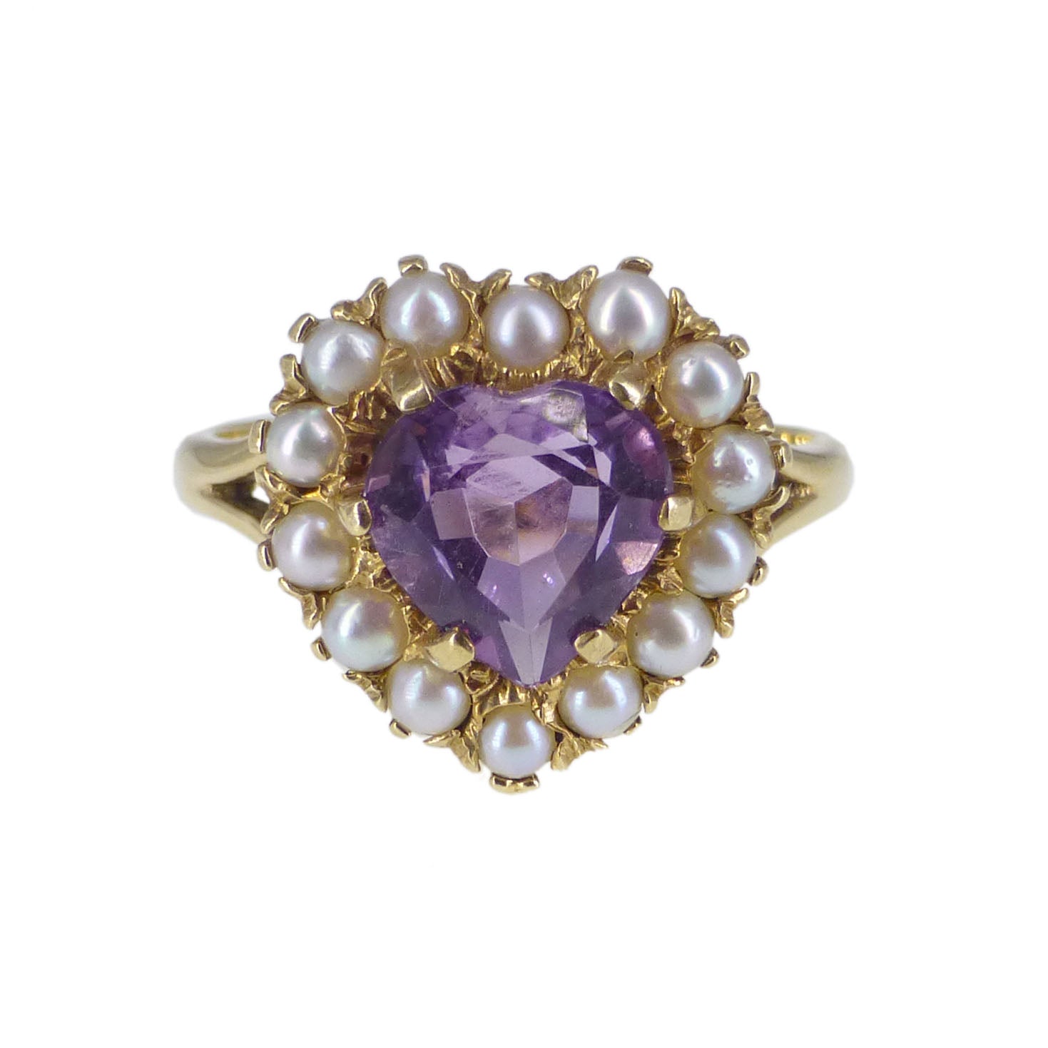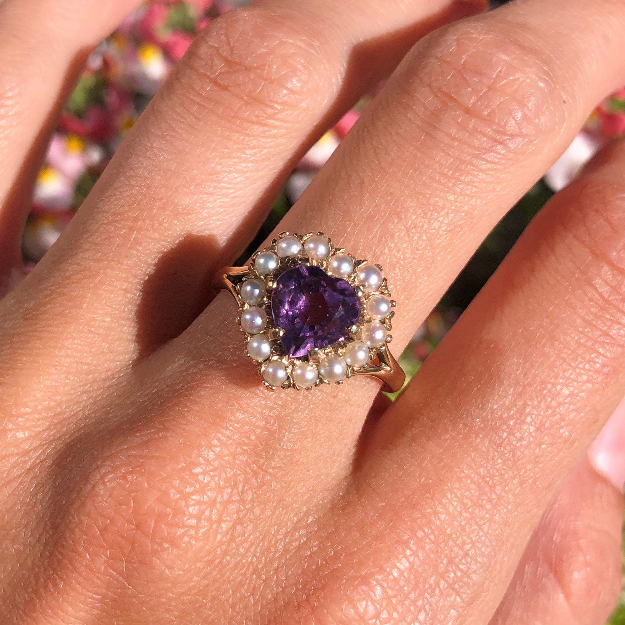 The most beautifully crafted vintage 9ct gold ring featuring a carved amethyst heart framed by pearls.