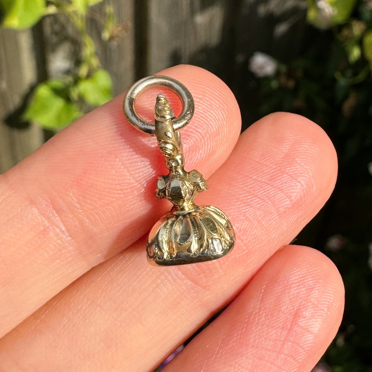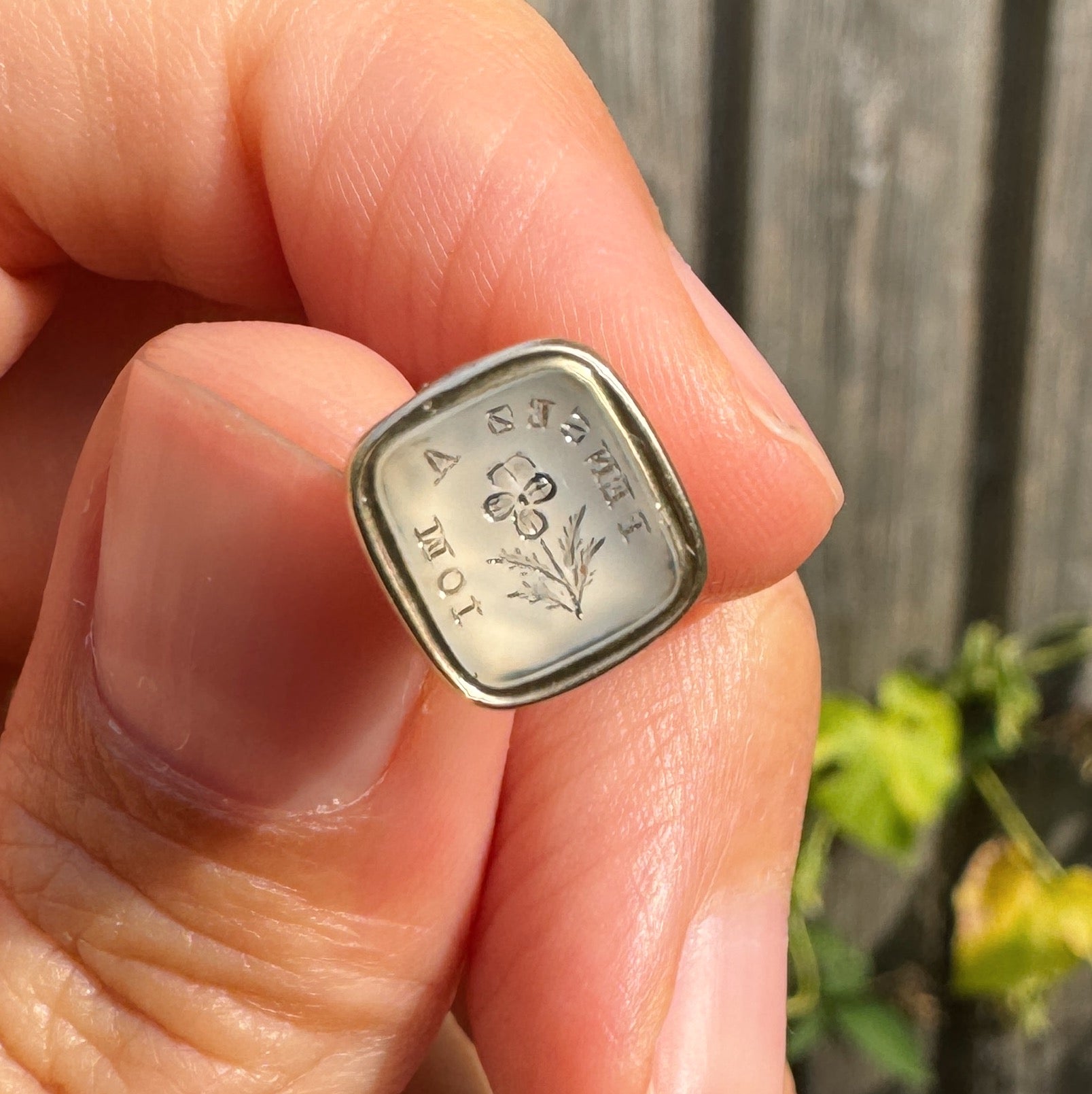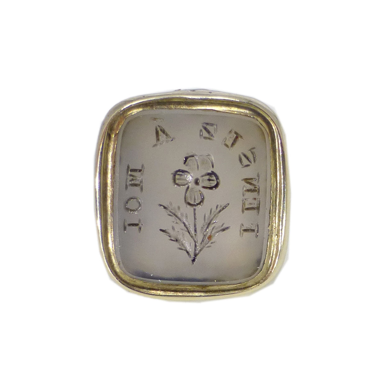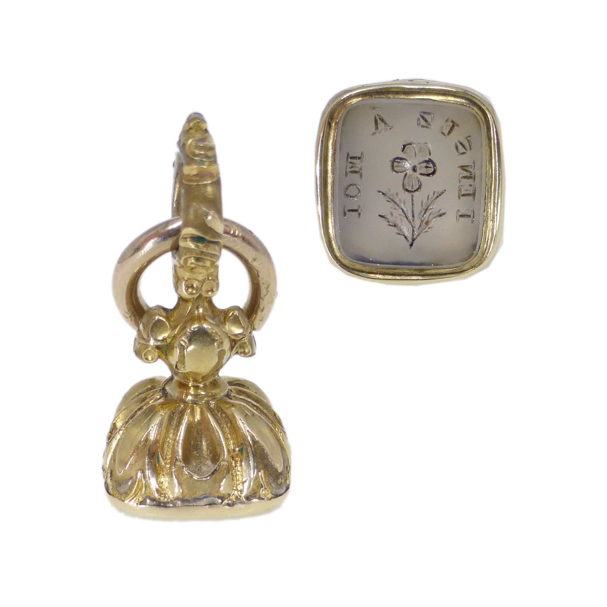 A dainty antique gold plated fob featuring a carved intaglio of a pansy with the phrase 'Pensez A Moi' (think of me).