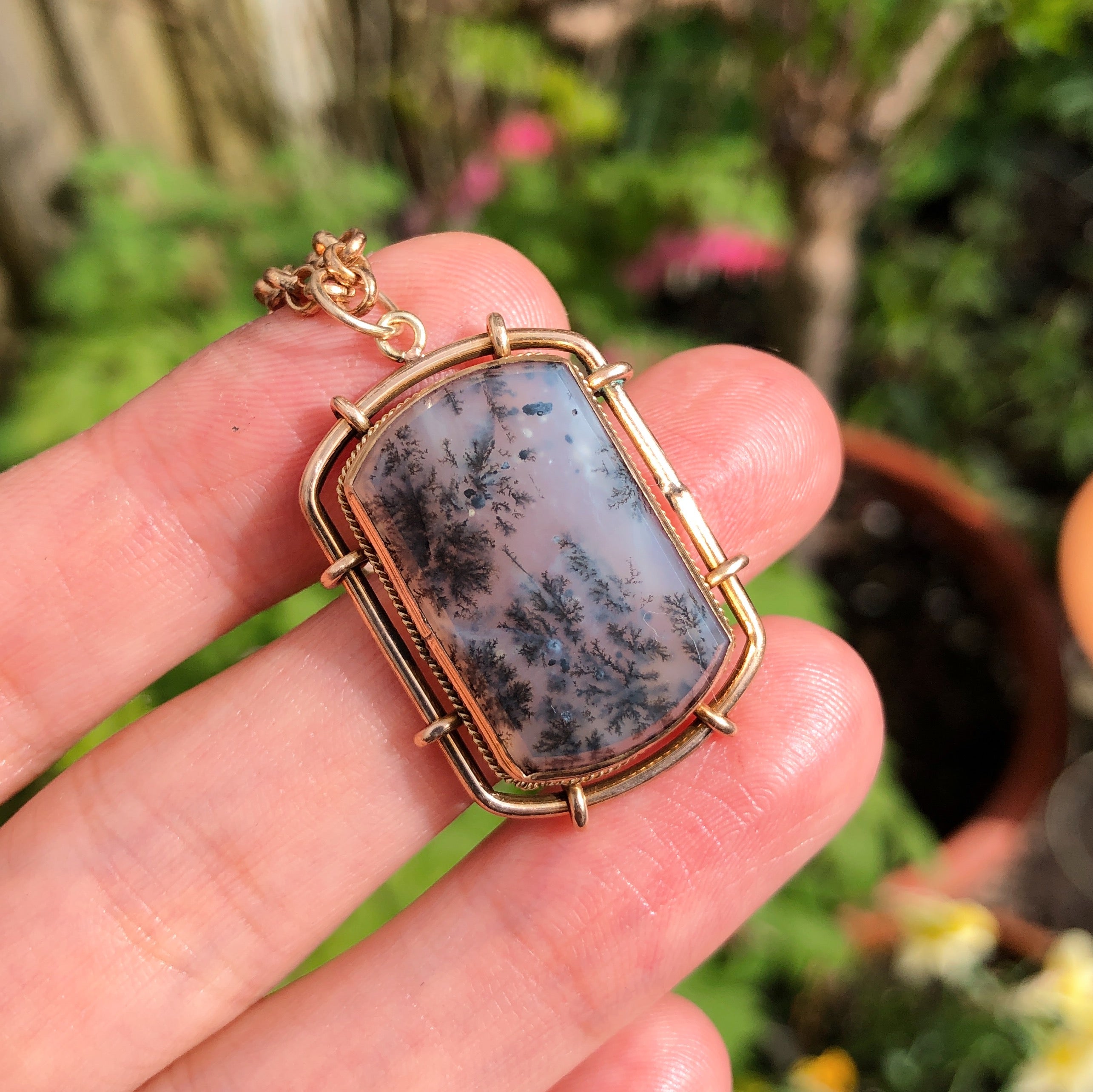 A wonderful antique rolled gold pendant that has been converted from an old Victorian stud. The pendant is set with the most beautiful dendritic agate stone in an ornate layered frame.