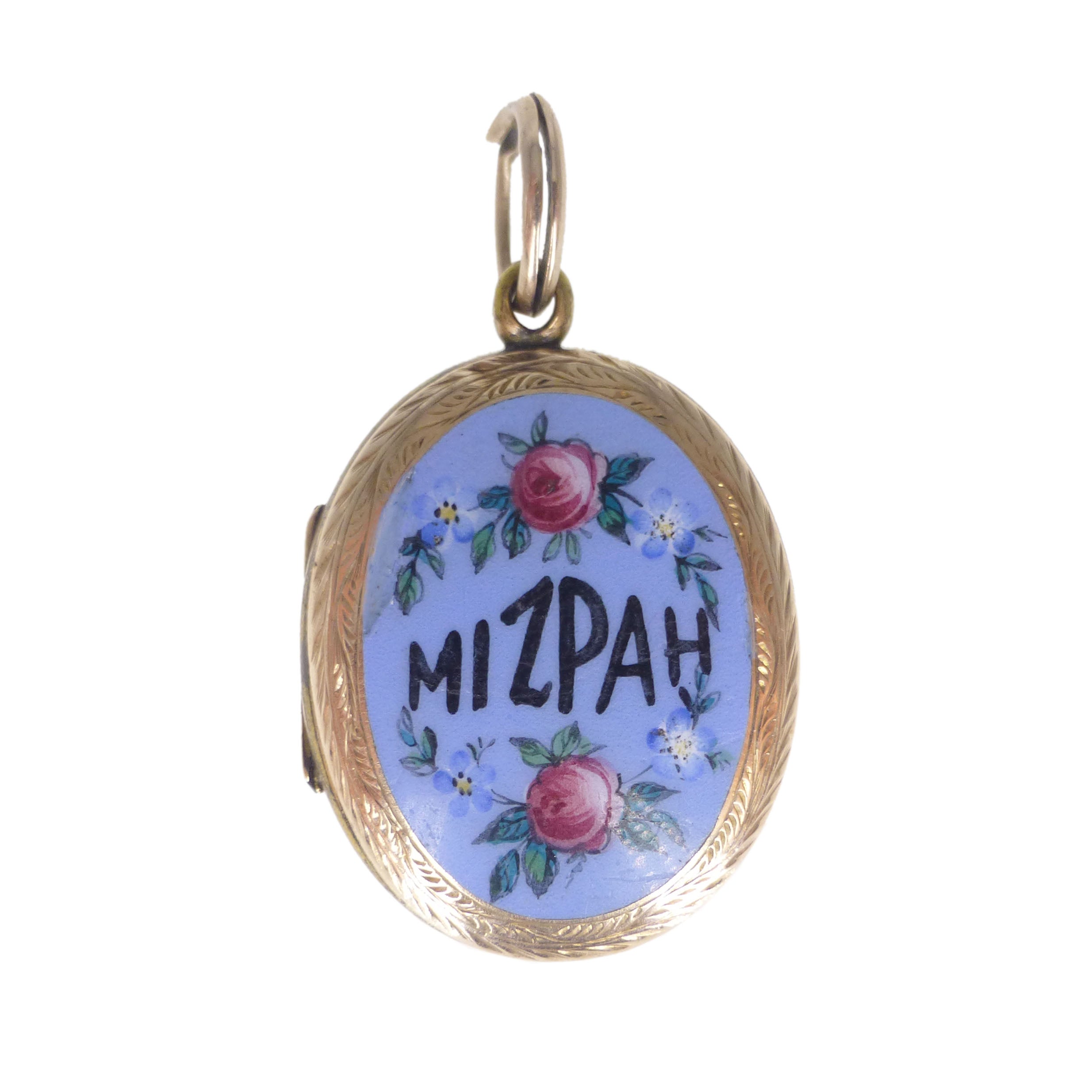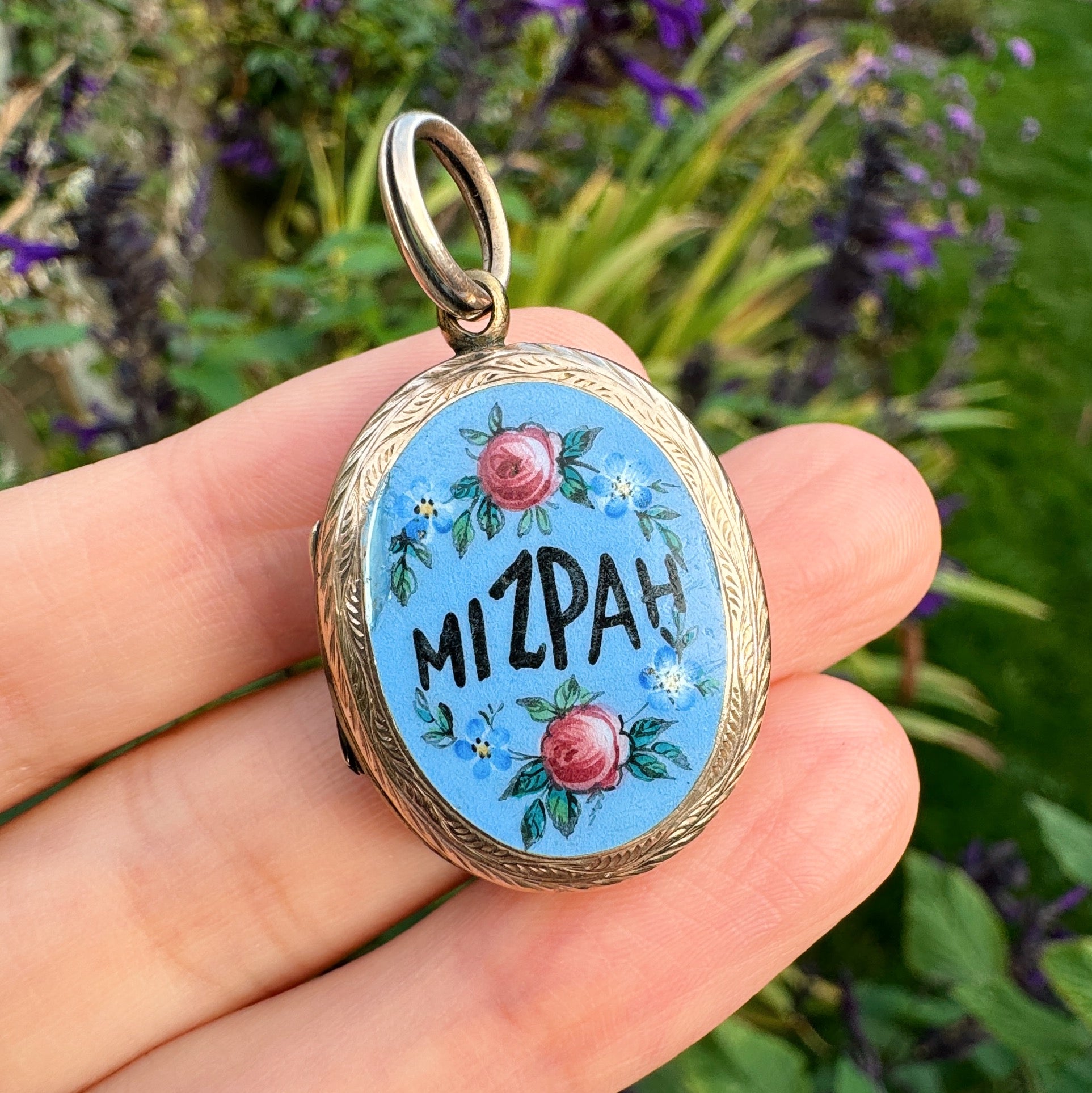 The enamel panel reads 'Mizpah', a Hebrew phrase that means watch tower which was loosely interpreted during the Victorian era to the popular phrase 'May God Watch Over You'. The word is framed by floral detailing on a vibrant blue background.