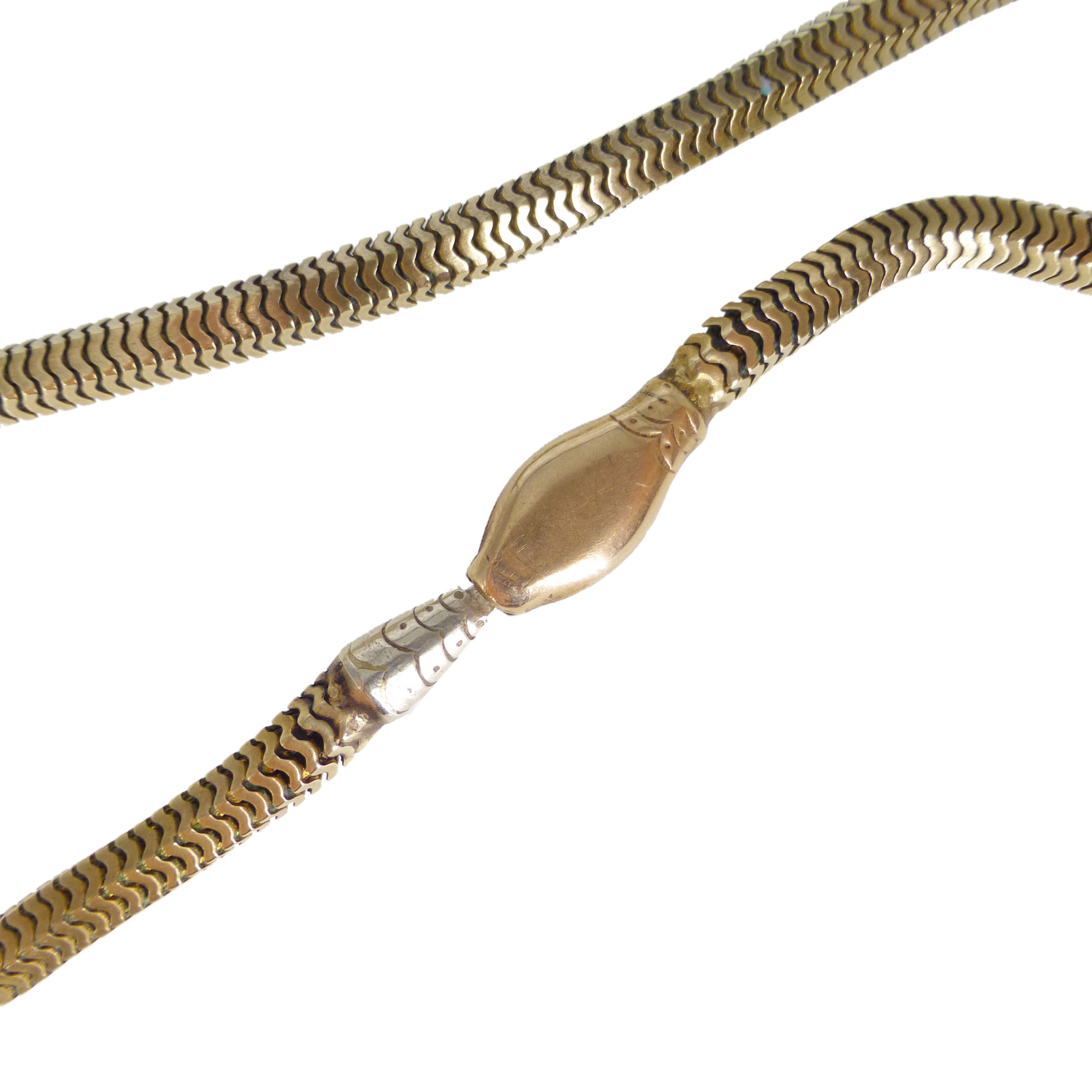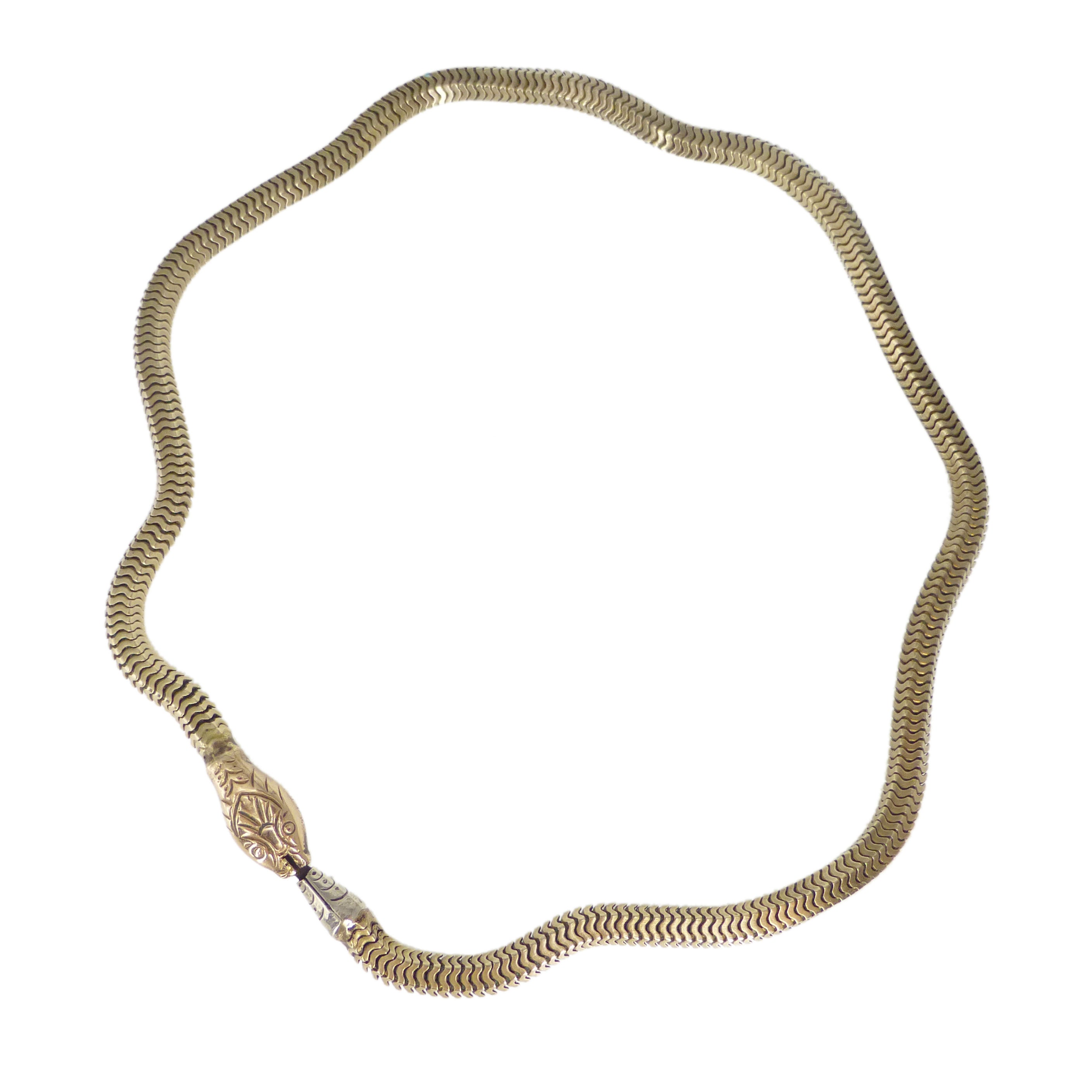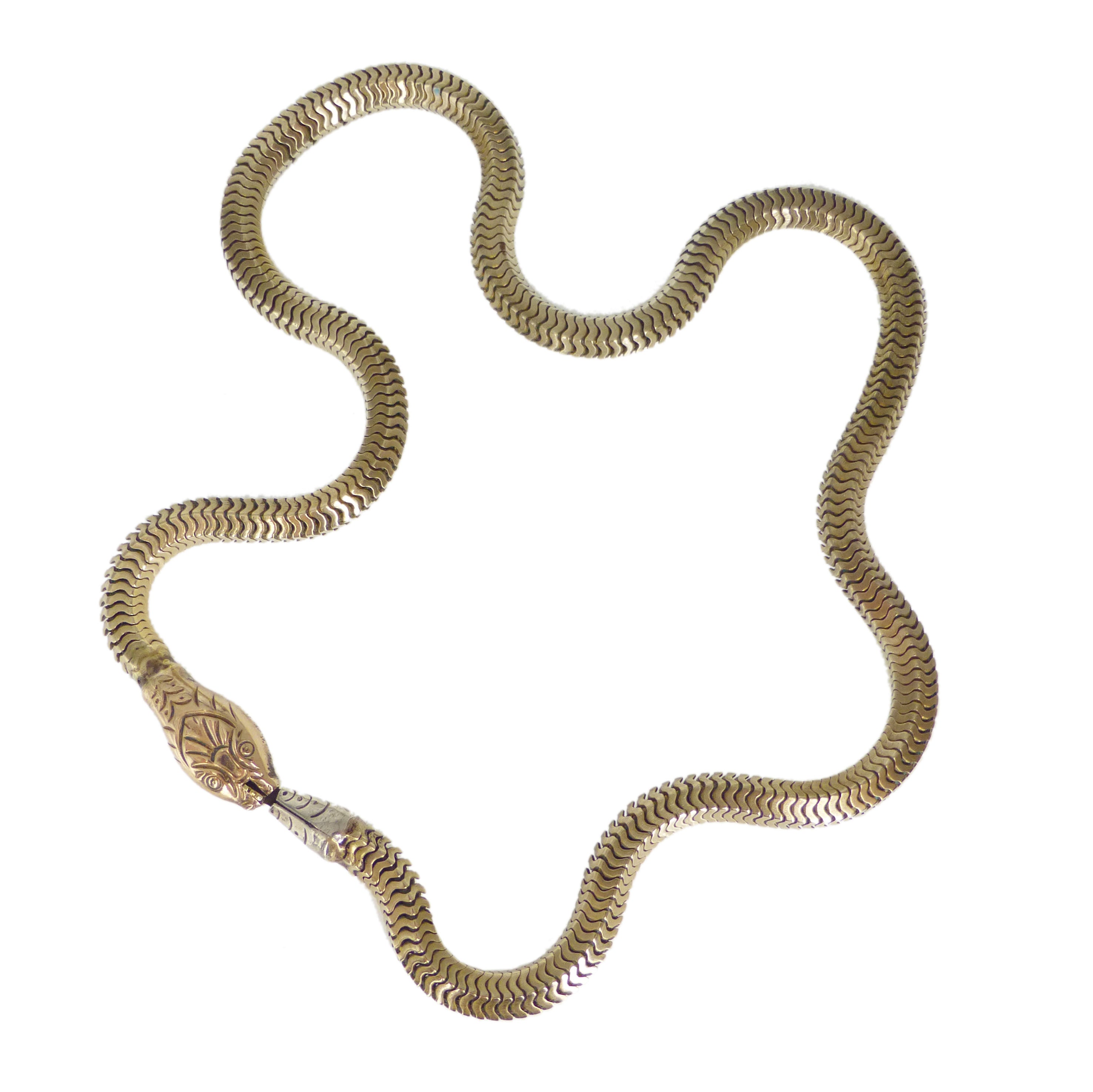 A beautiful antique gold tone metal necklace featuring a great snake head and tail clasp. The necklace dates to the late Victorian period.