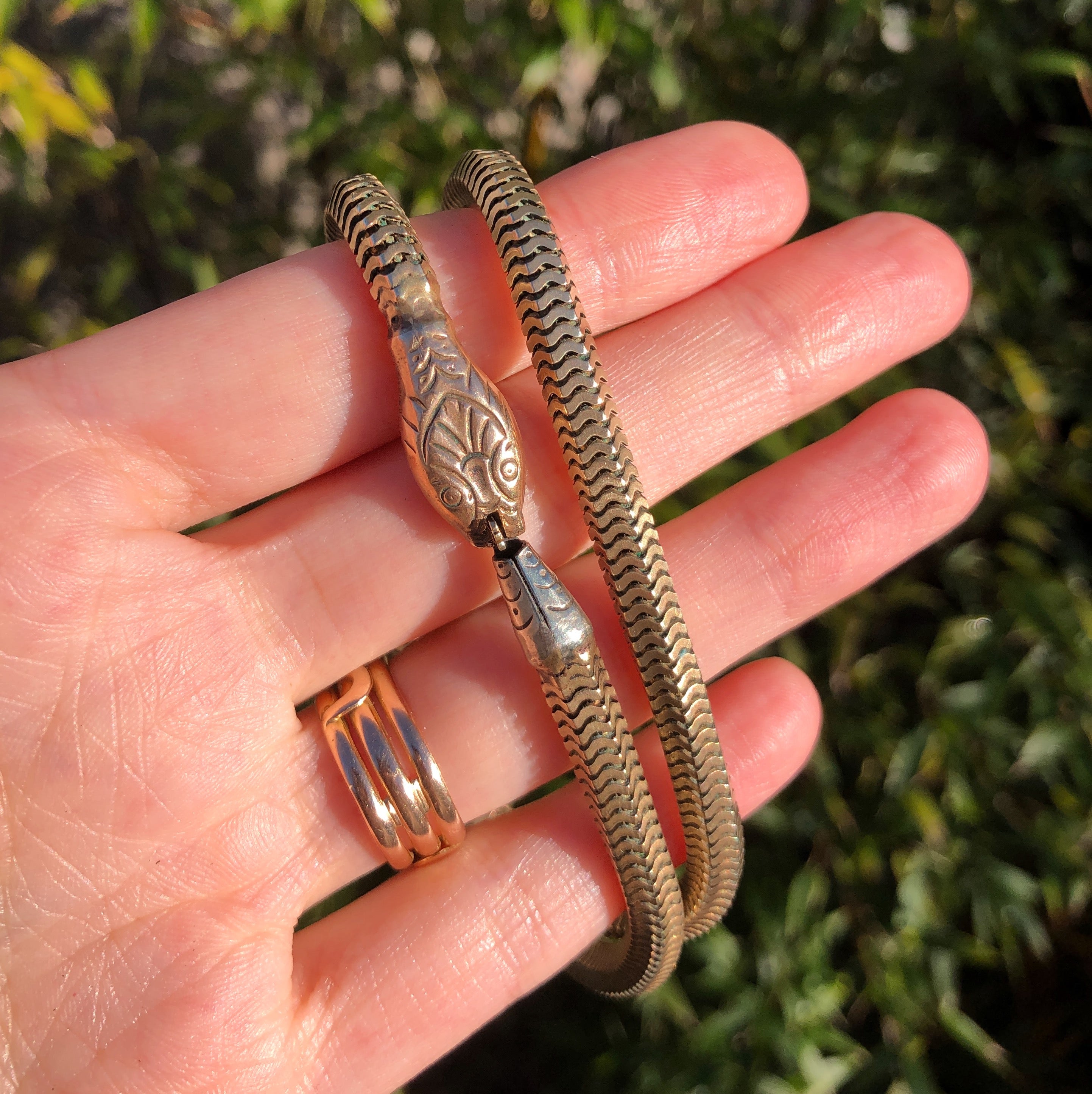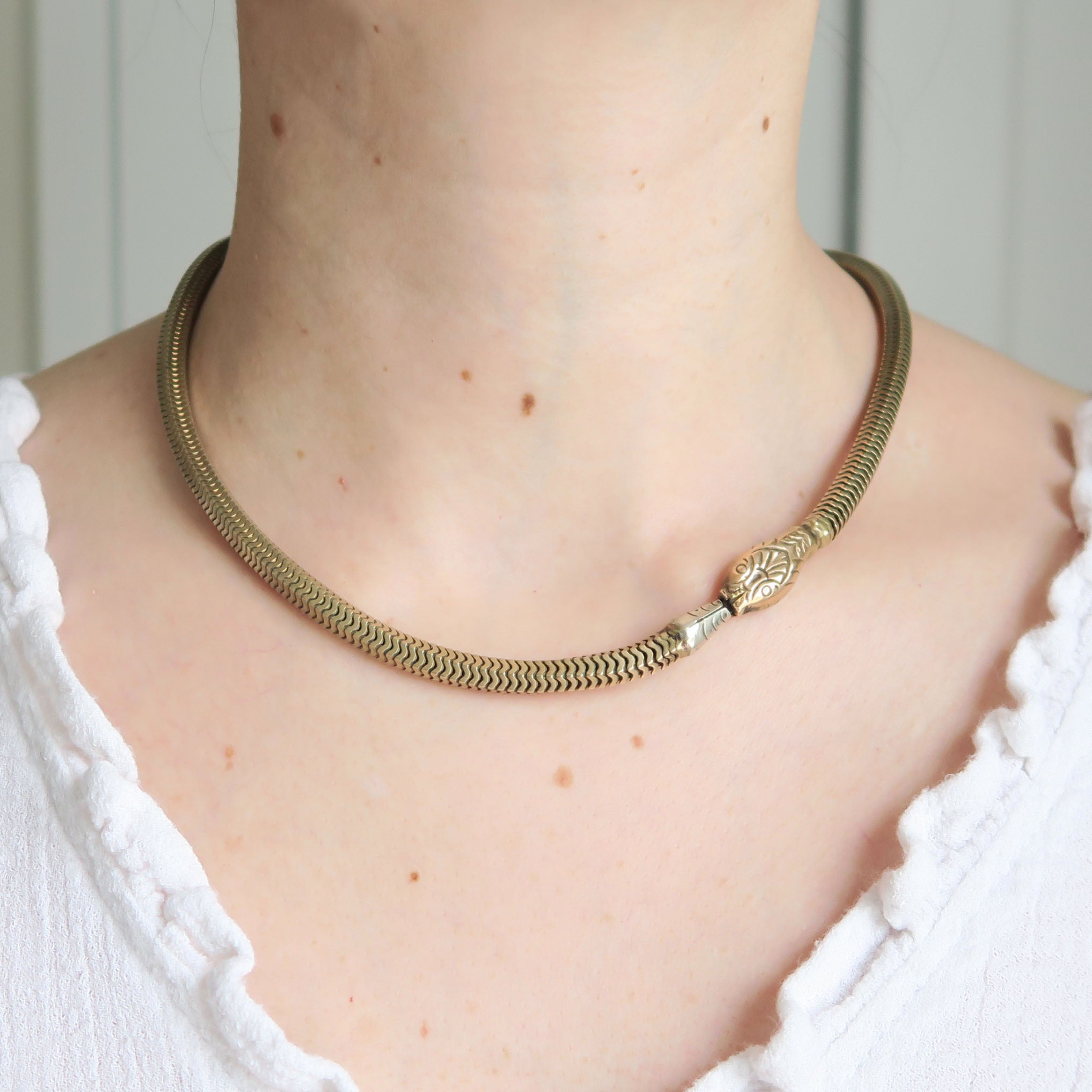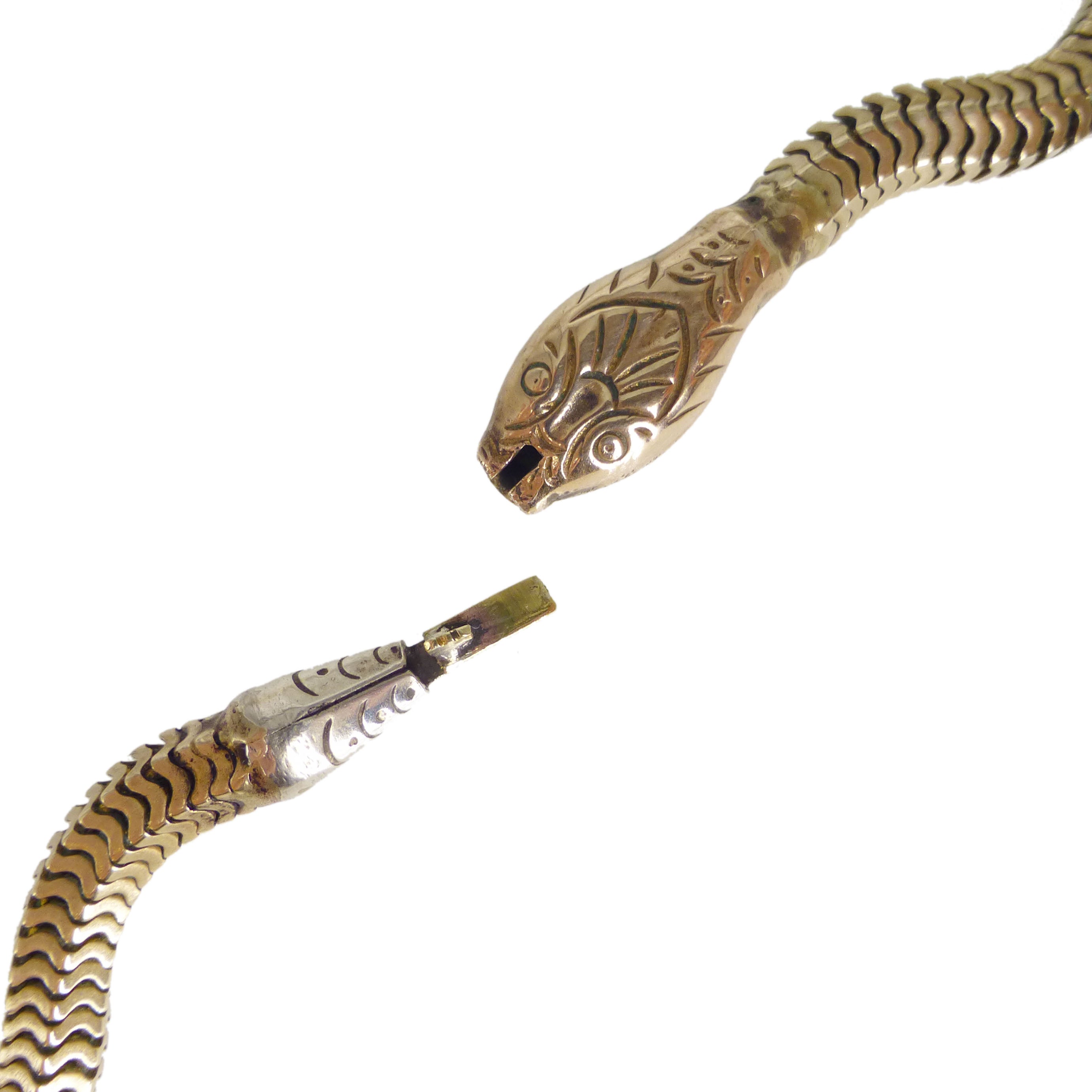 A beautiful antique gold tone metal necklace featuring a great snake head and tail clasp. The necklace dates to the late Victorian period.