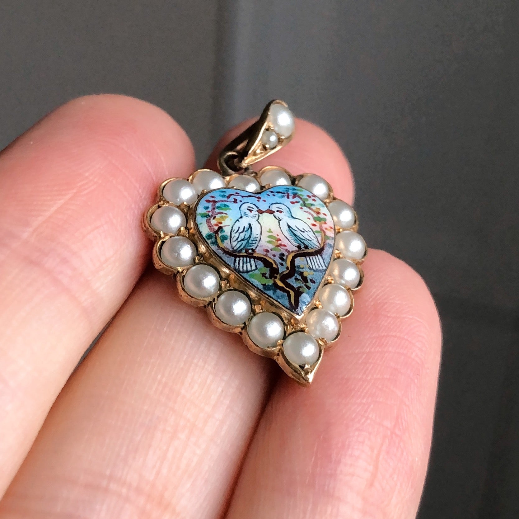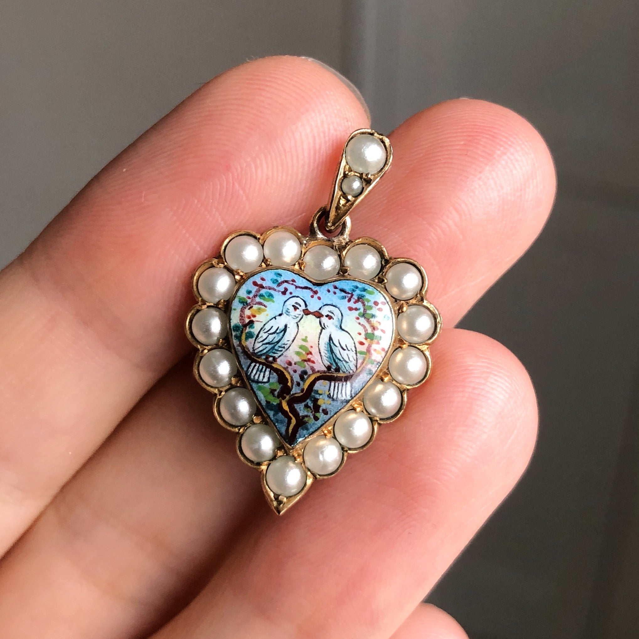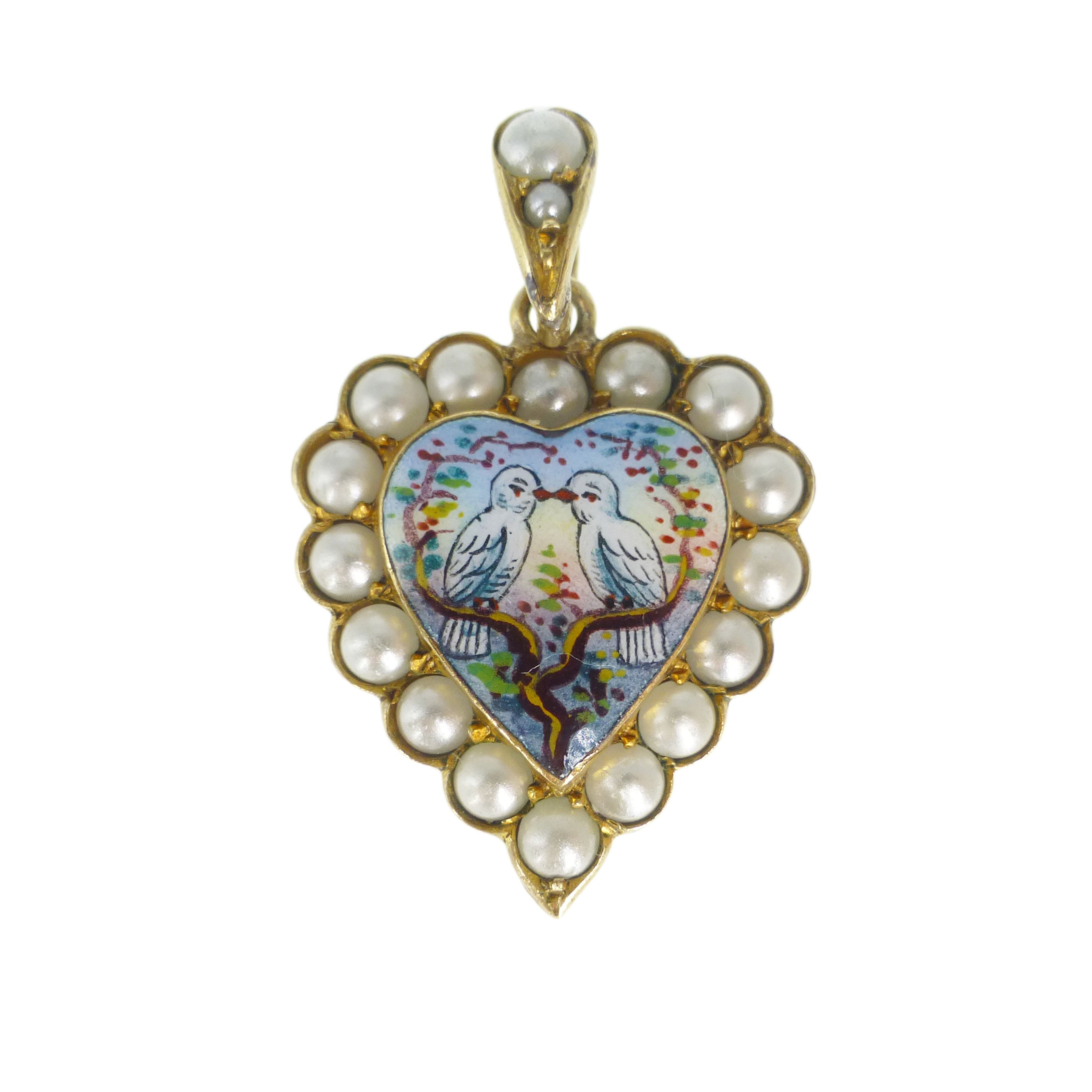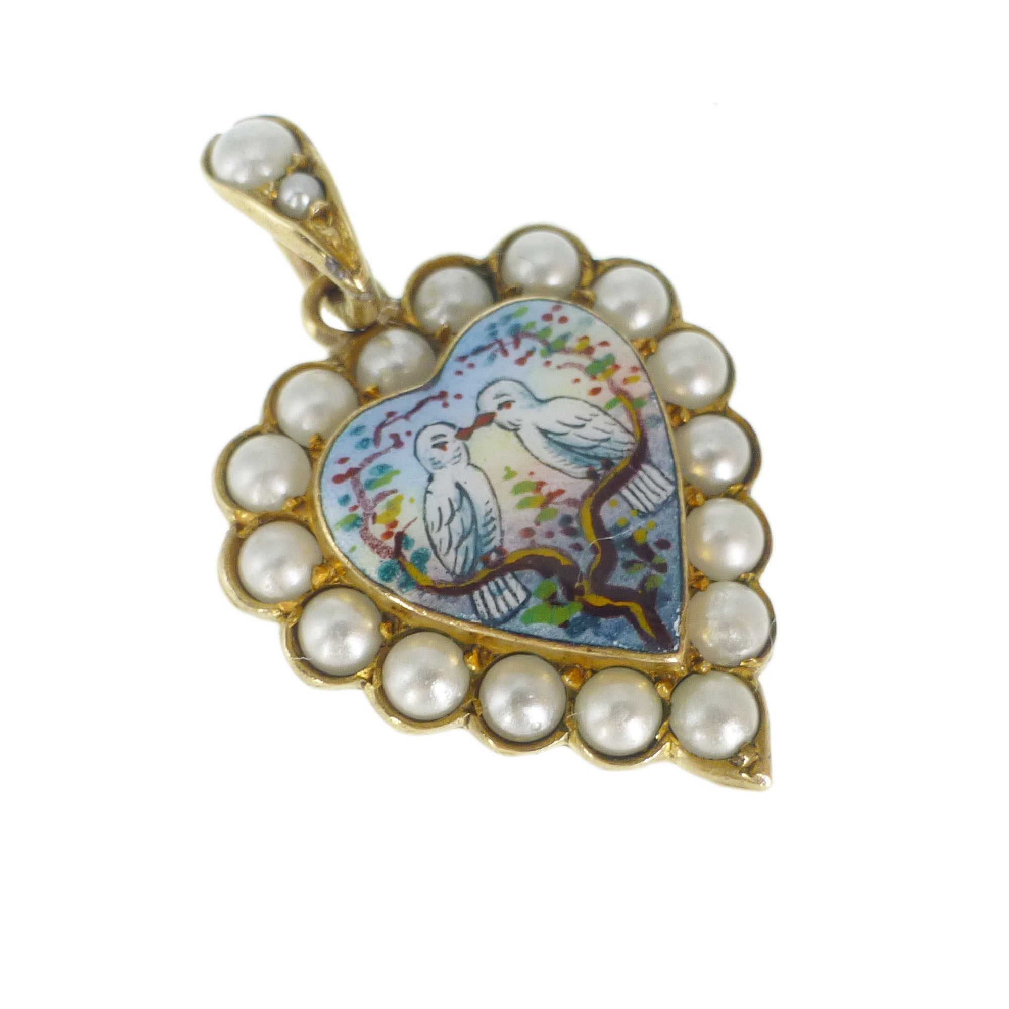 The sweetest gold plated heart pendant featuring a detailed enamel panel depicting two billing doves perched on a branch. The panel is framed by split faux pearls with a matching hooked top.