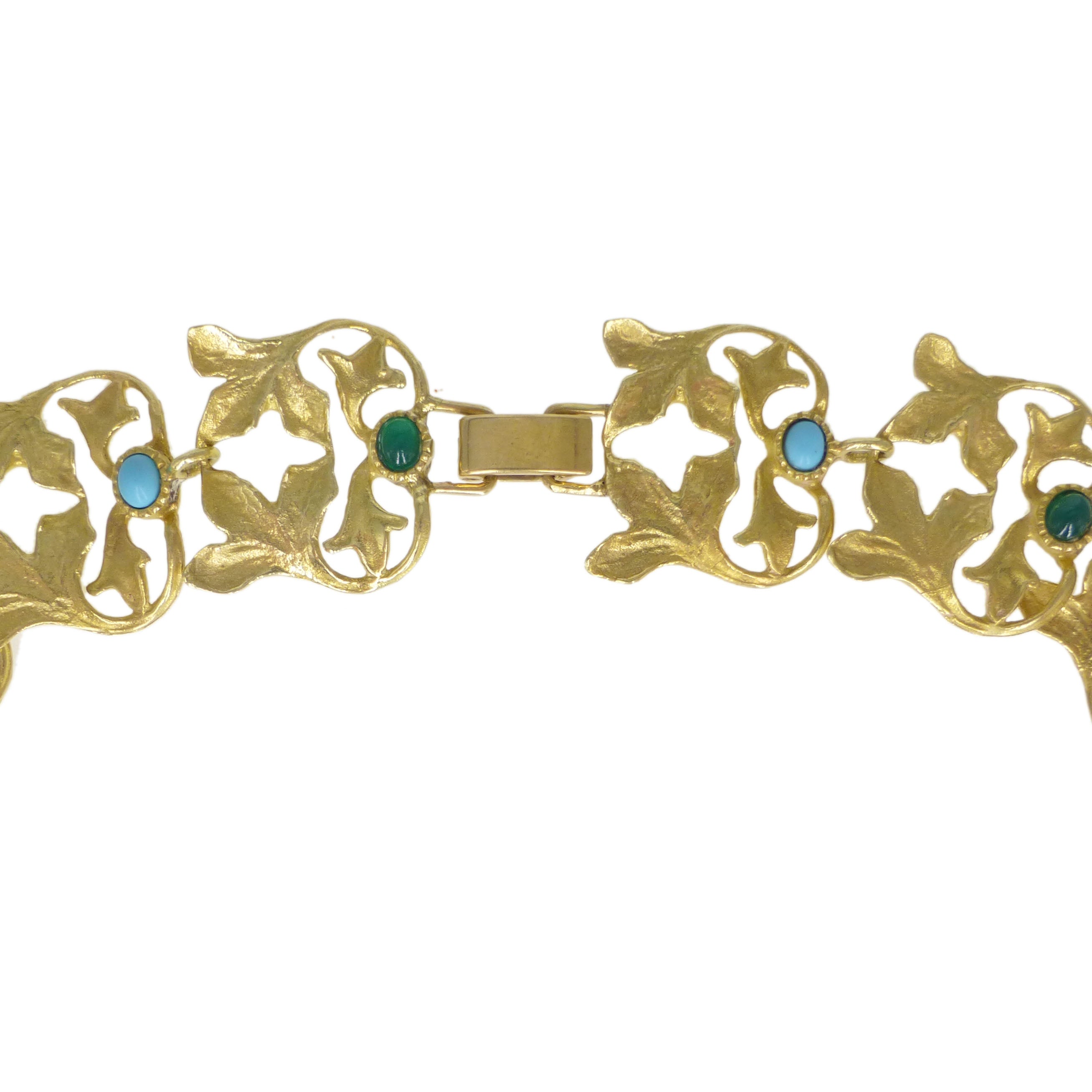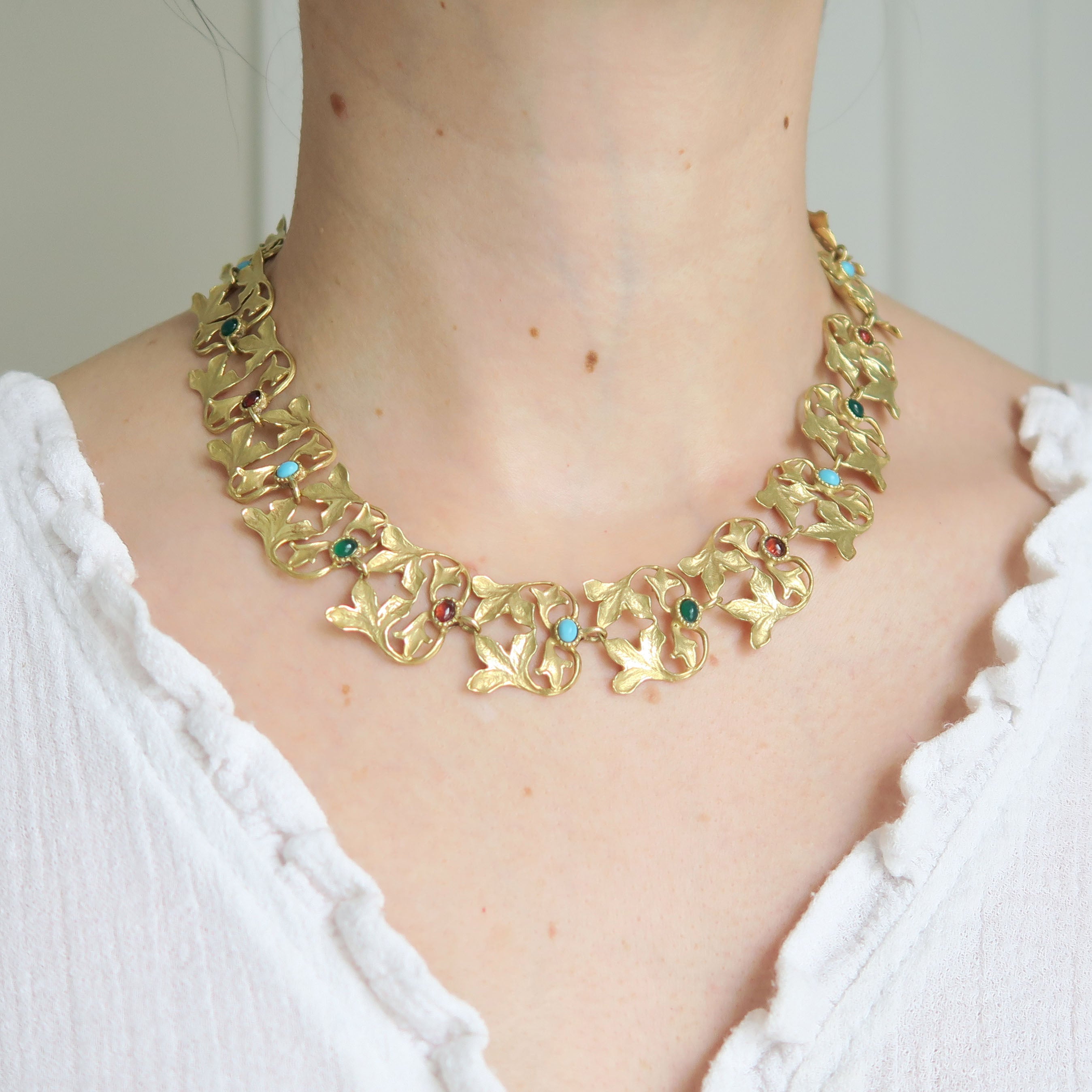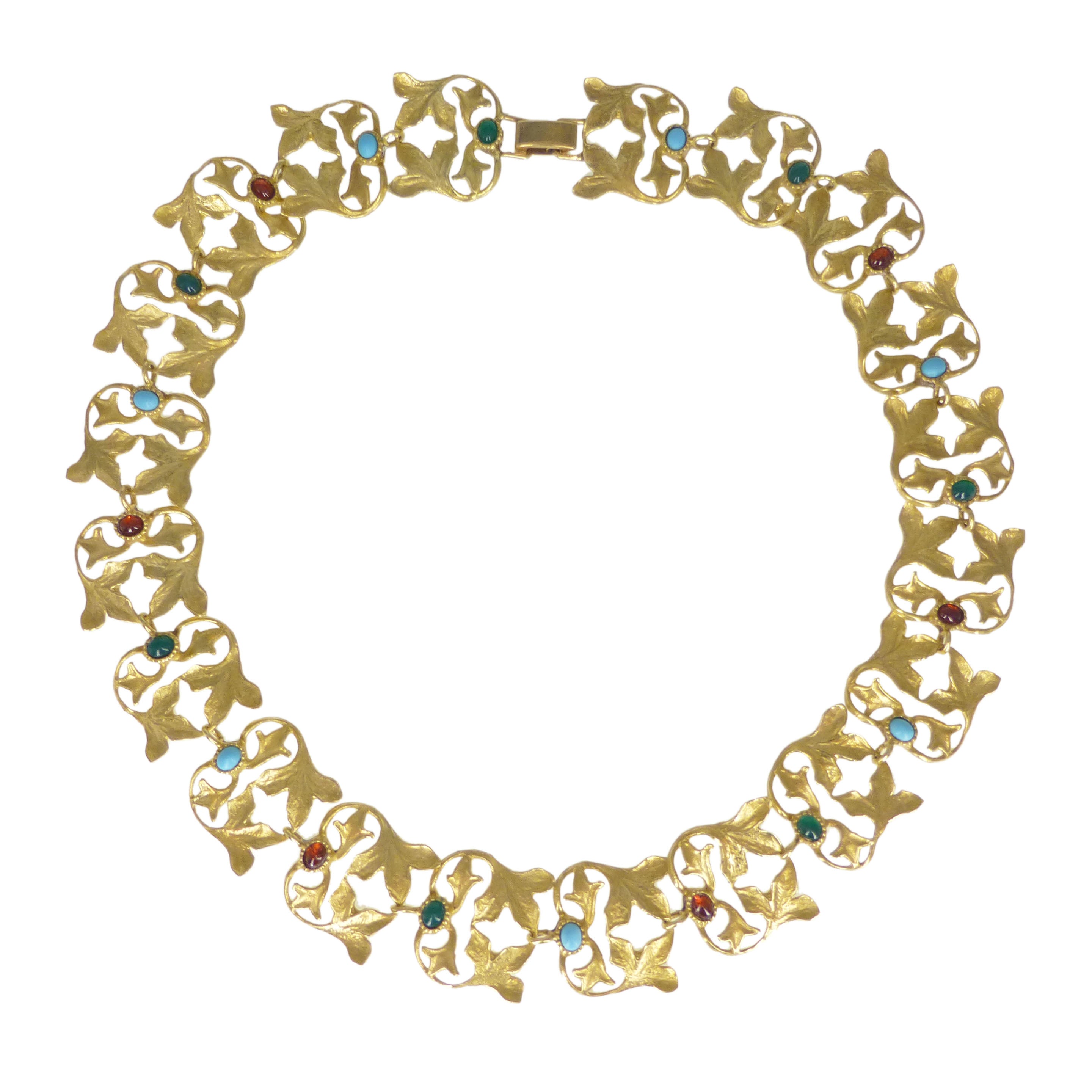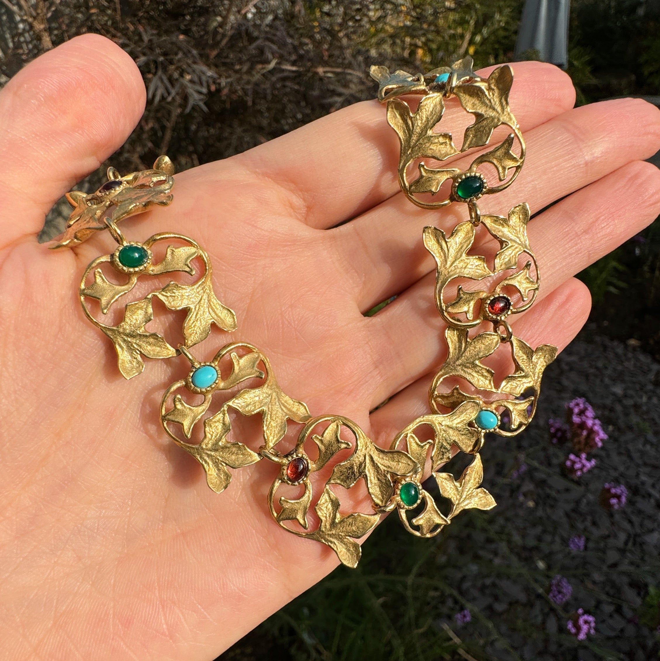 The necklace features intricate ivy leaf panels each set with green, red and blue glass cabochons.