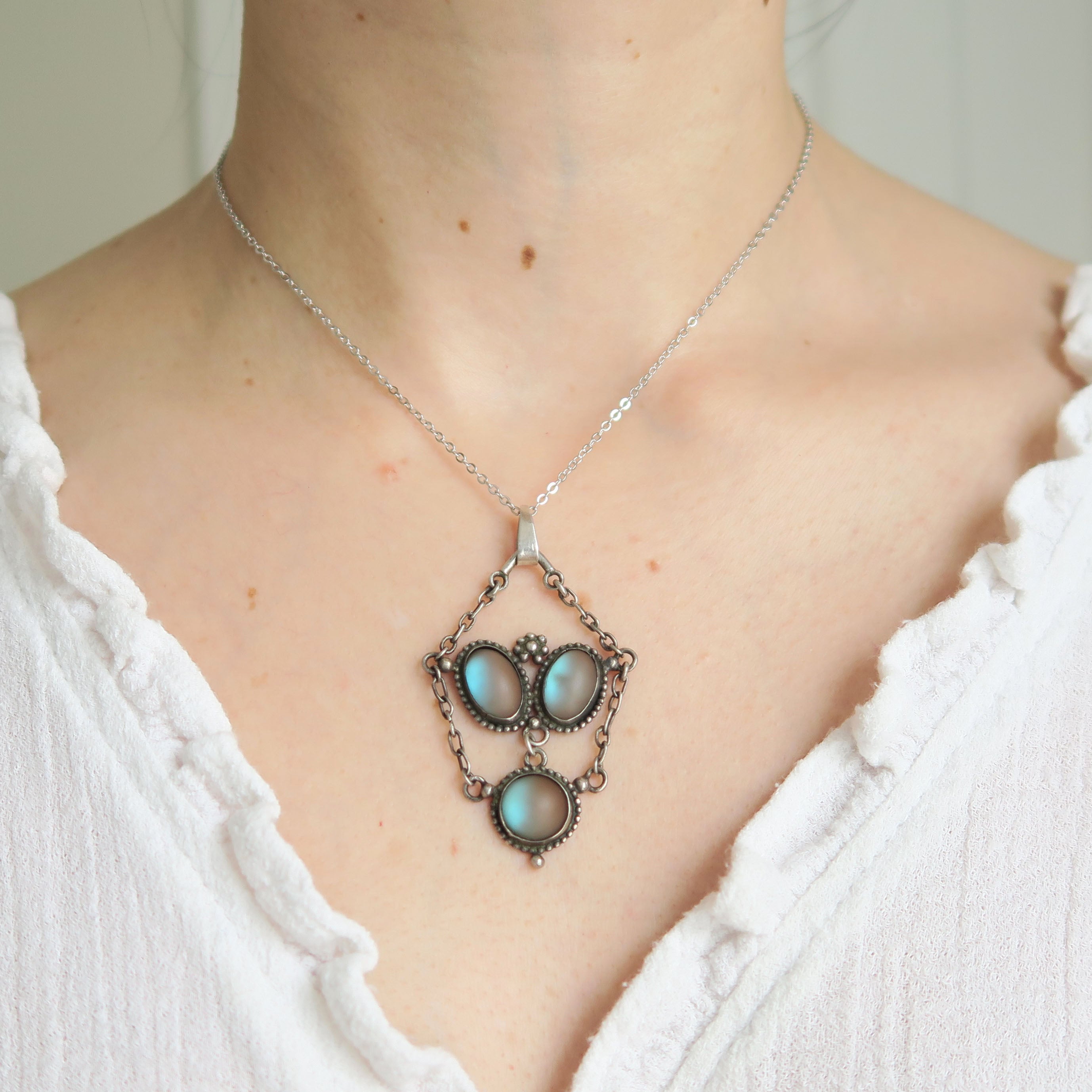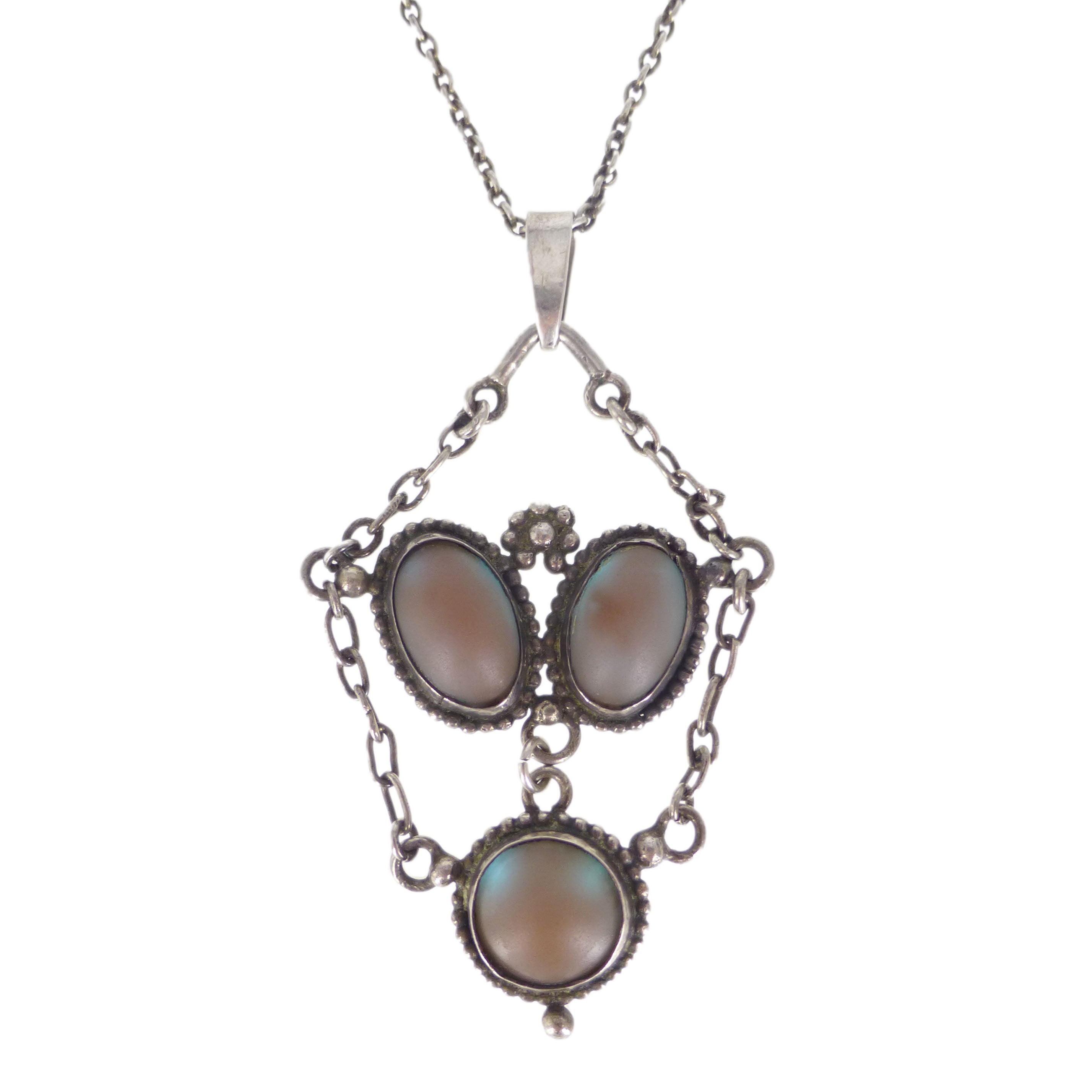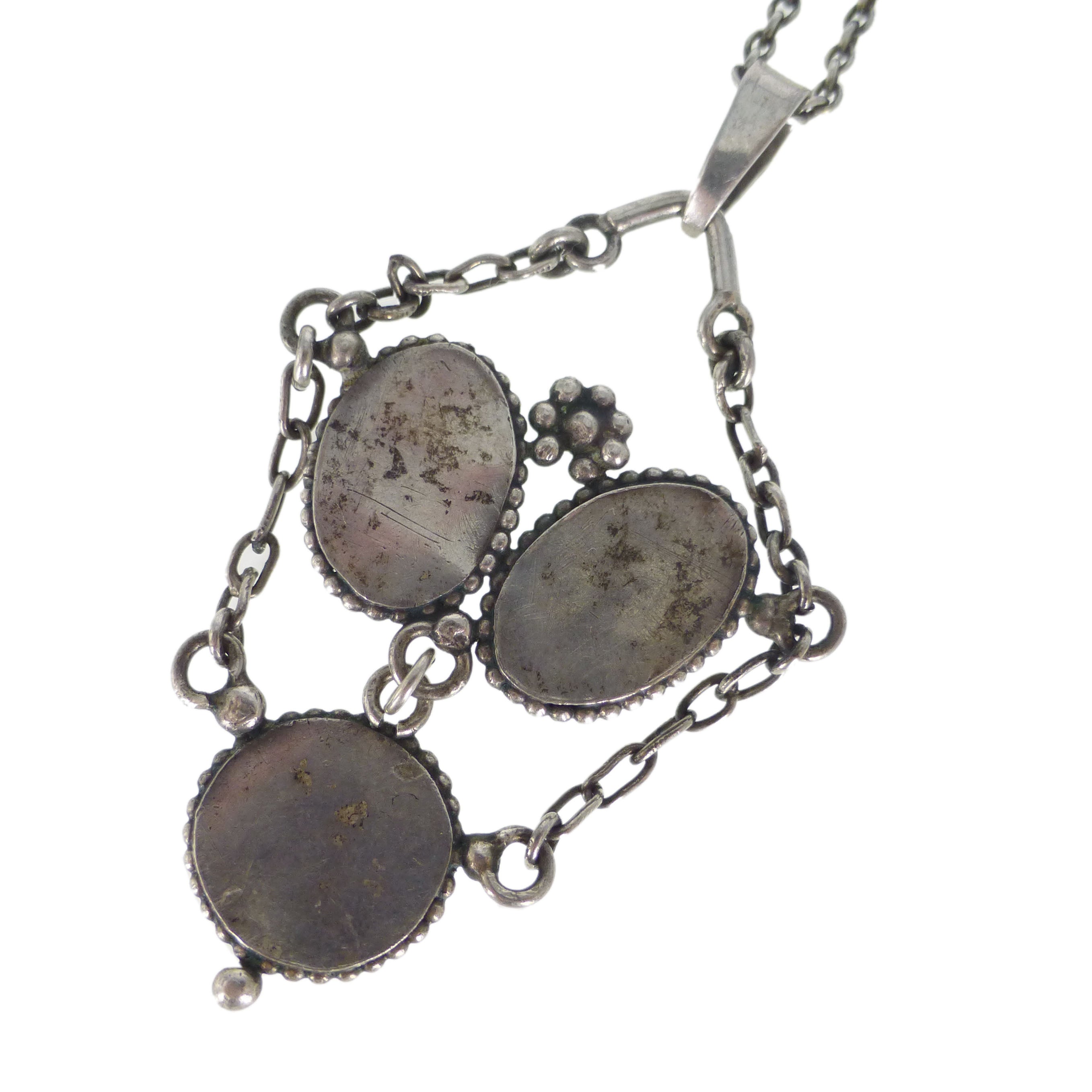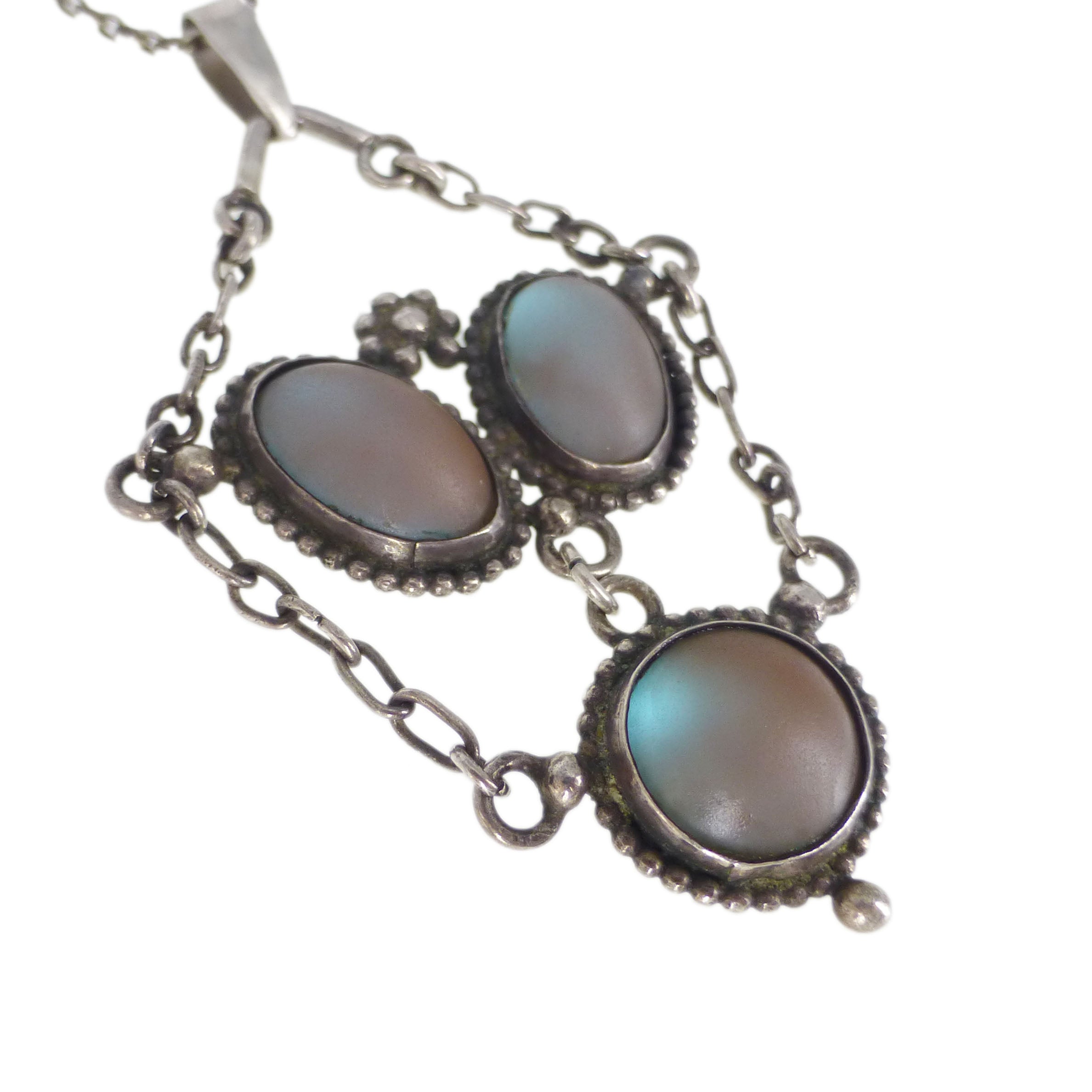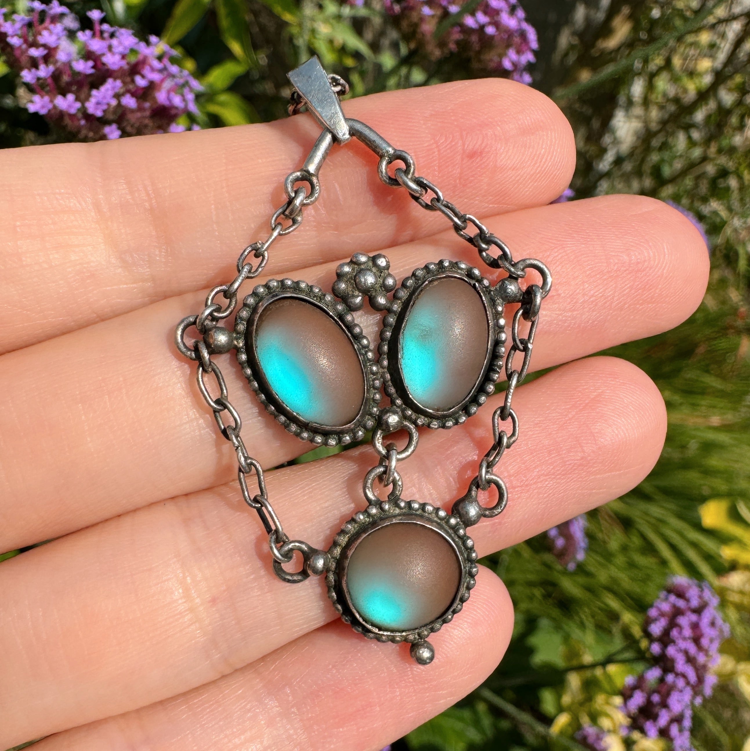 A beautiful antique Art Nouveau inspired silver pendant set with colourful matte saphiret glass stones. The pendant comes on an antique silver chain with a secure bolt ring clasp.