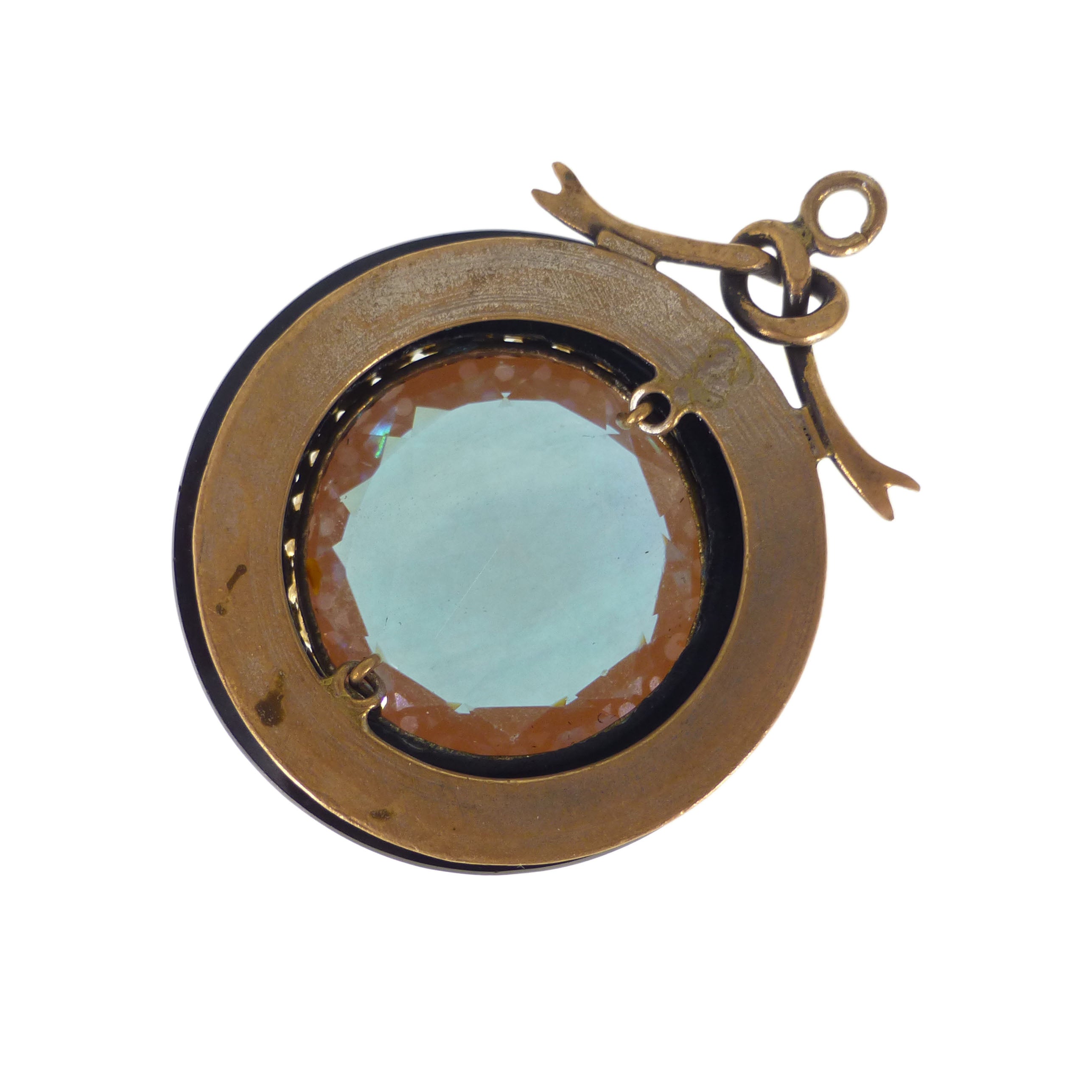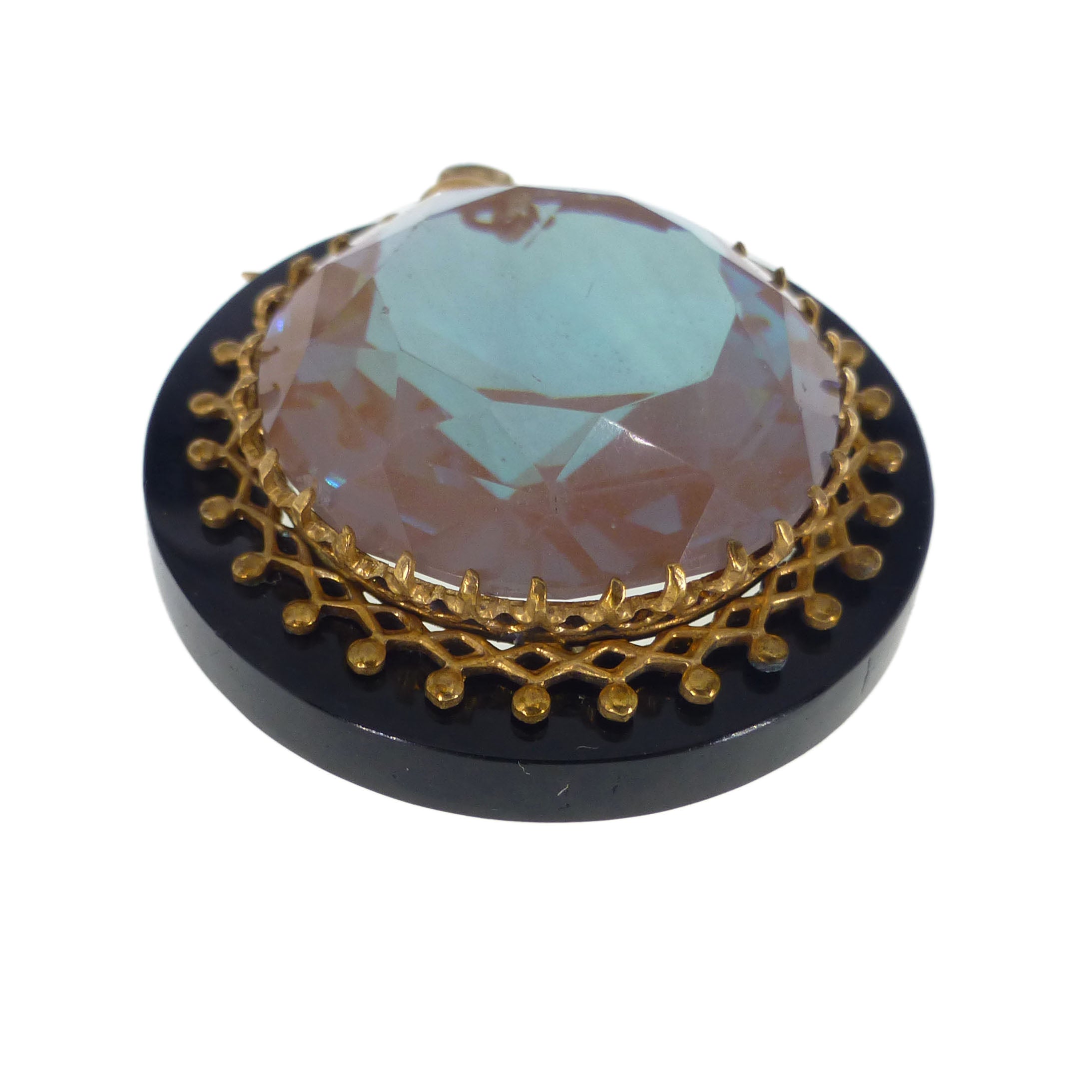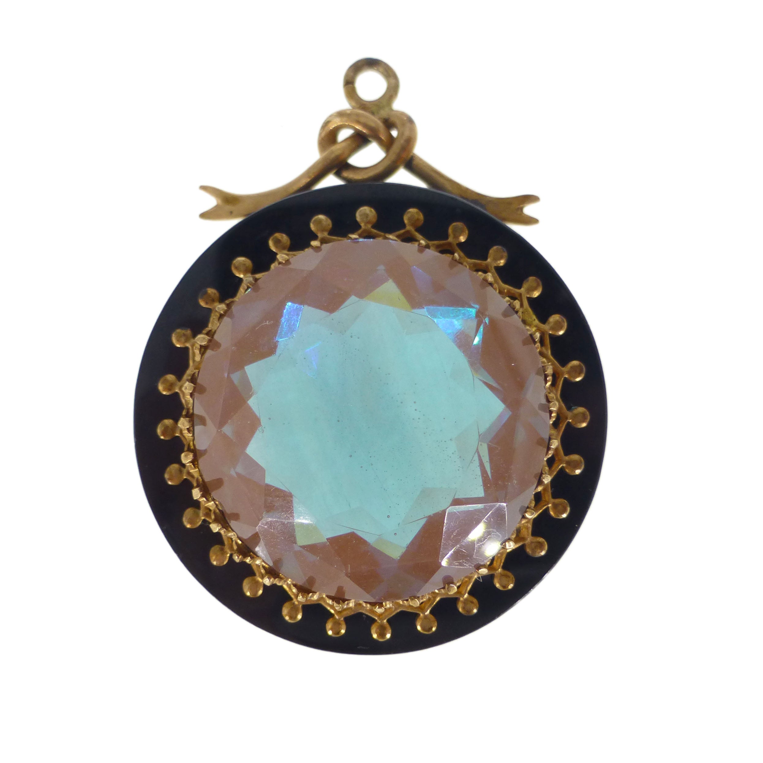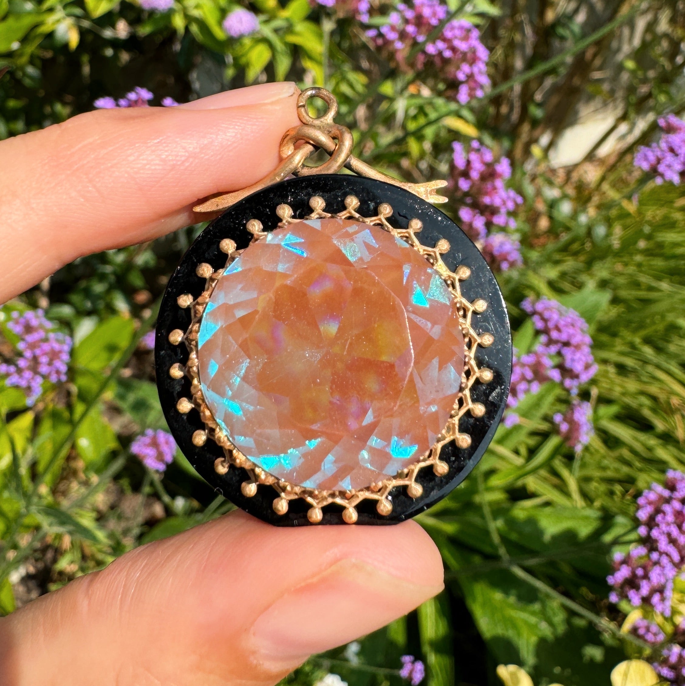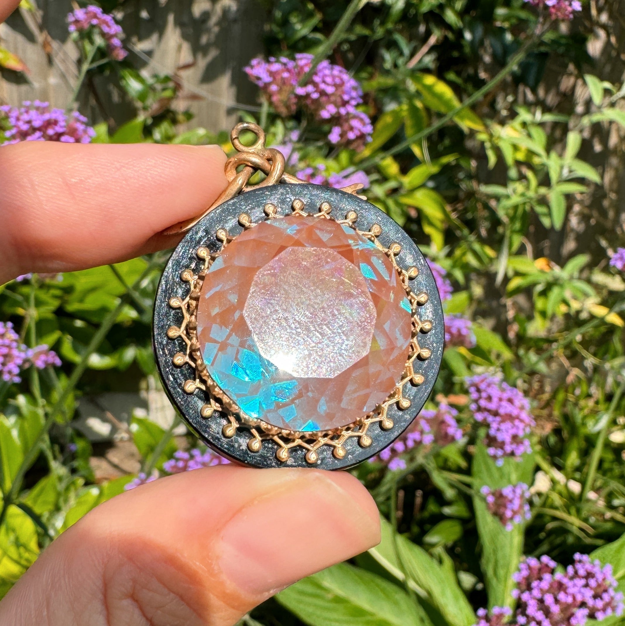 An exceptional antique pendant set with a large circular saphiret glass stone that is beautifully faceted and packed full of colour.