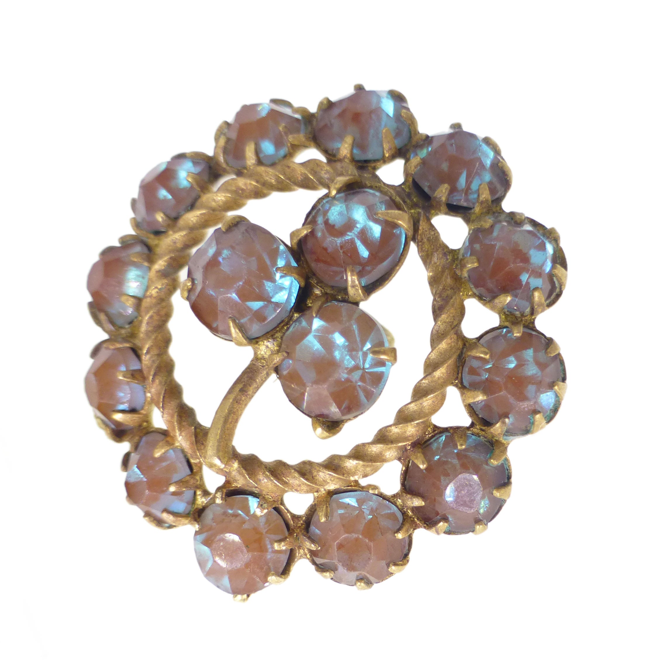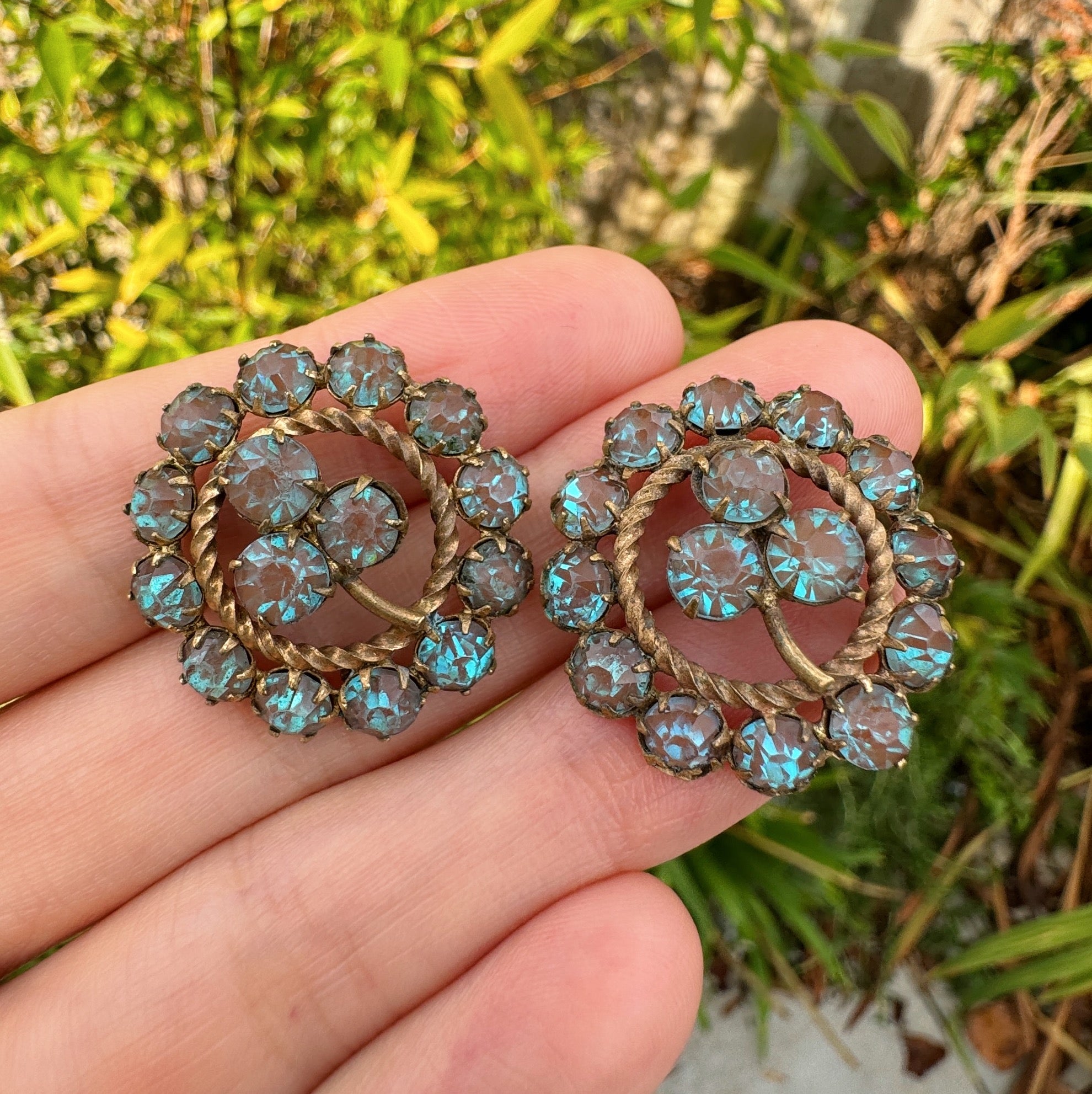The saphiret stones are foil backed and set into a gold base metal frame. The buttons each feature a large hooked back.