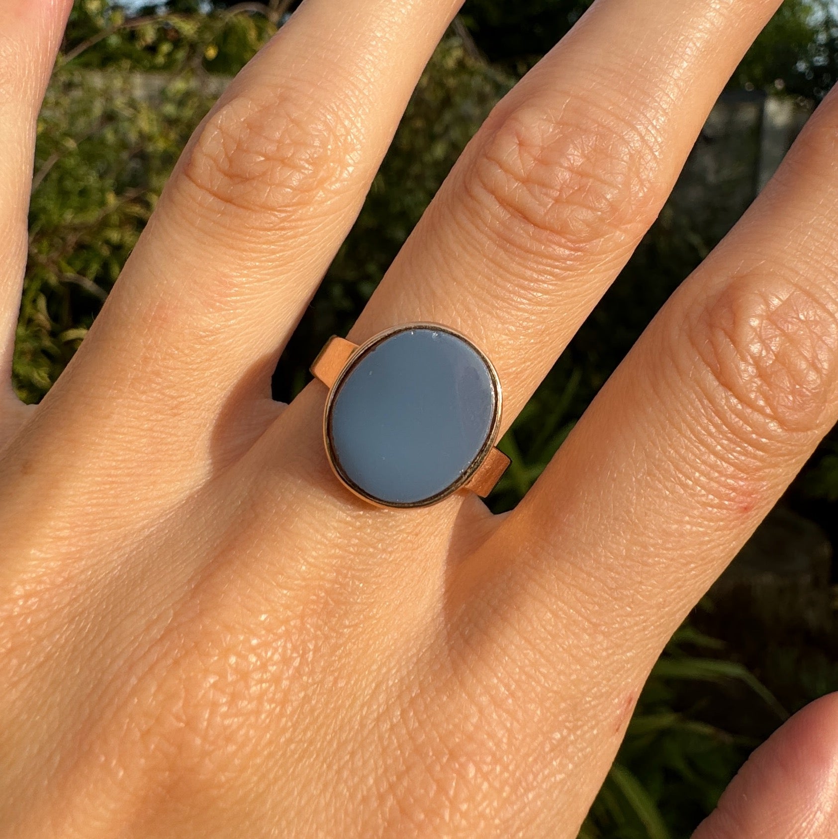 There is a tiny nibble to the edge of the stone. The ring remains in good antique condition overall.