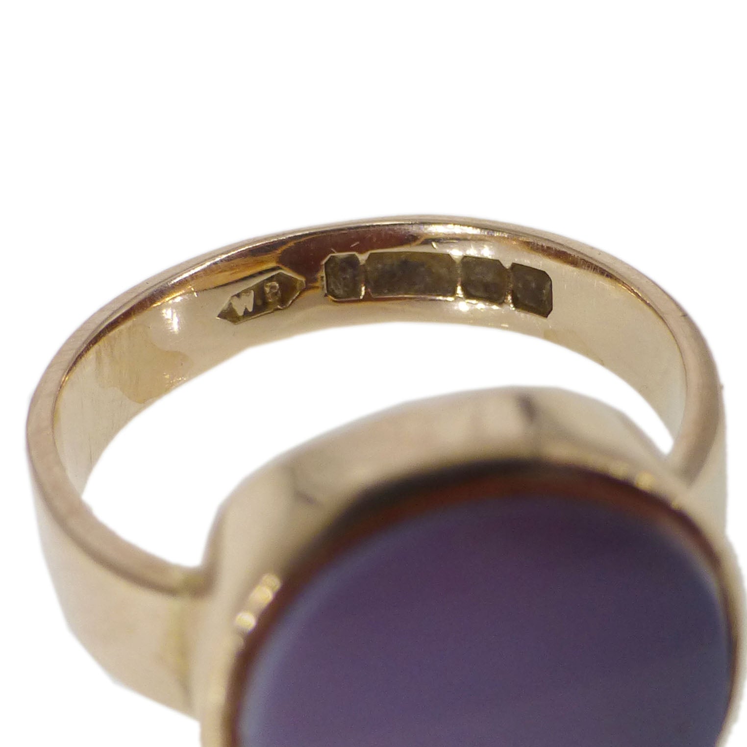 A beautiful, chunky 9ct gold solitaire ring set with a round sardonyx stone. The ring is fully hallmarked on the inside band.