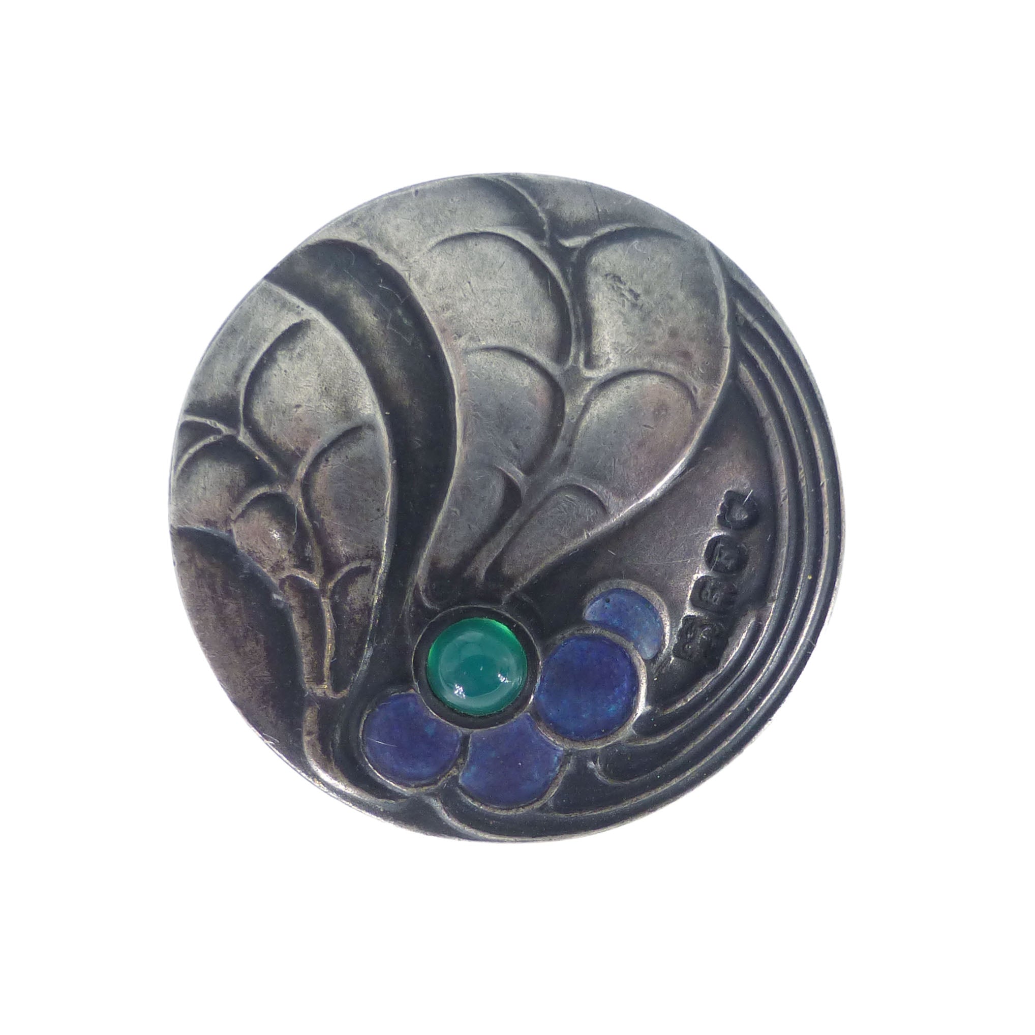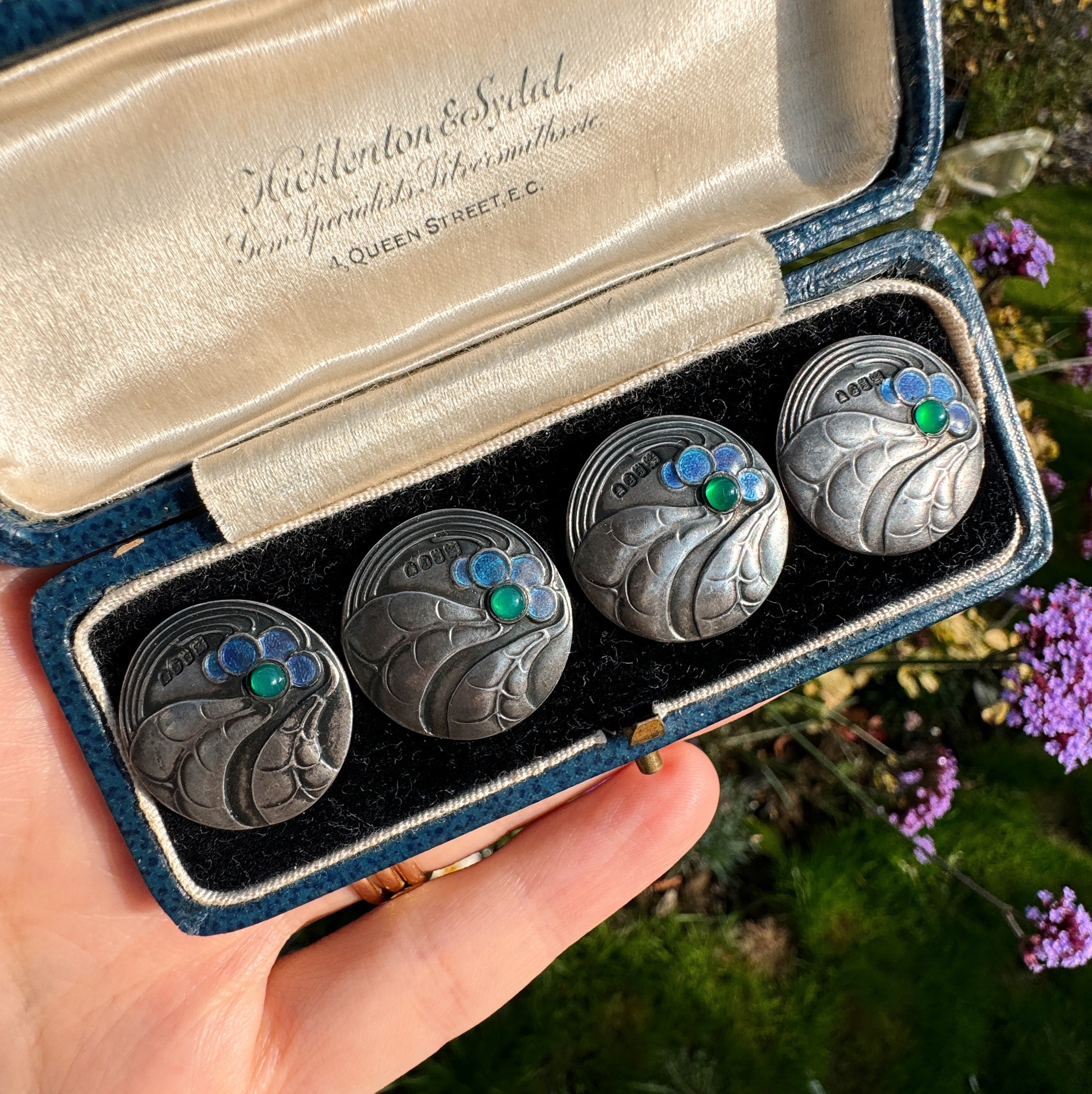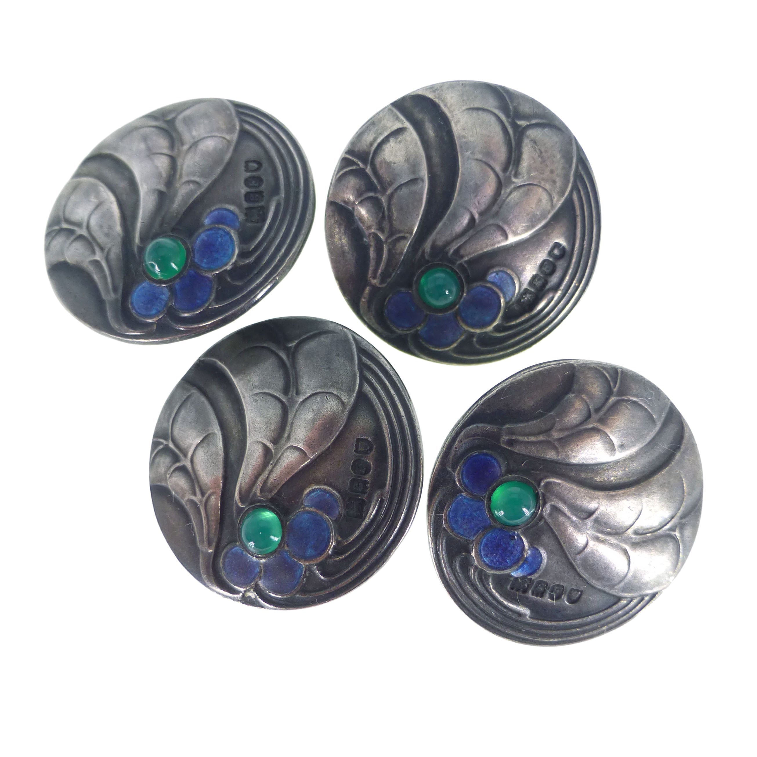 A beautiful set of antique silver buttons designed by Theodor Fahrner for Murrle Bennett. Each button is set with a chrysoprase stone framed by blue enamel detailing layered over a swirled engraved base.