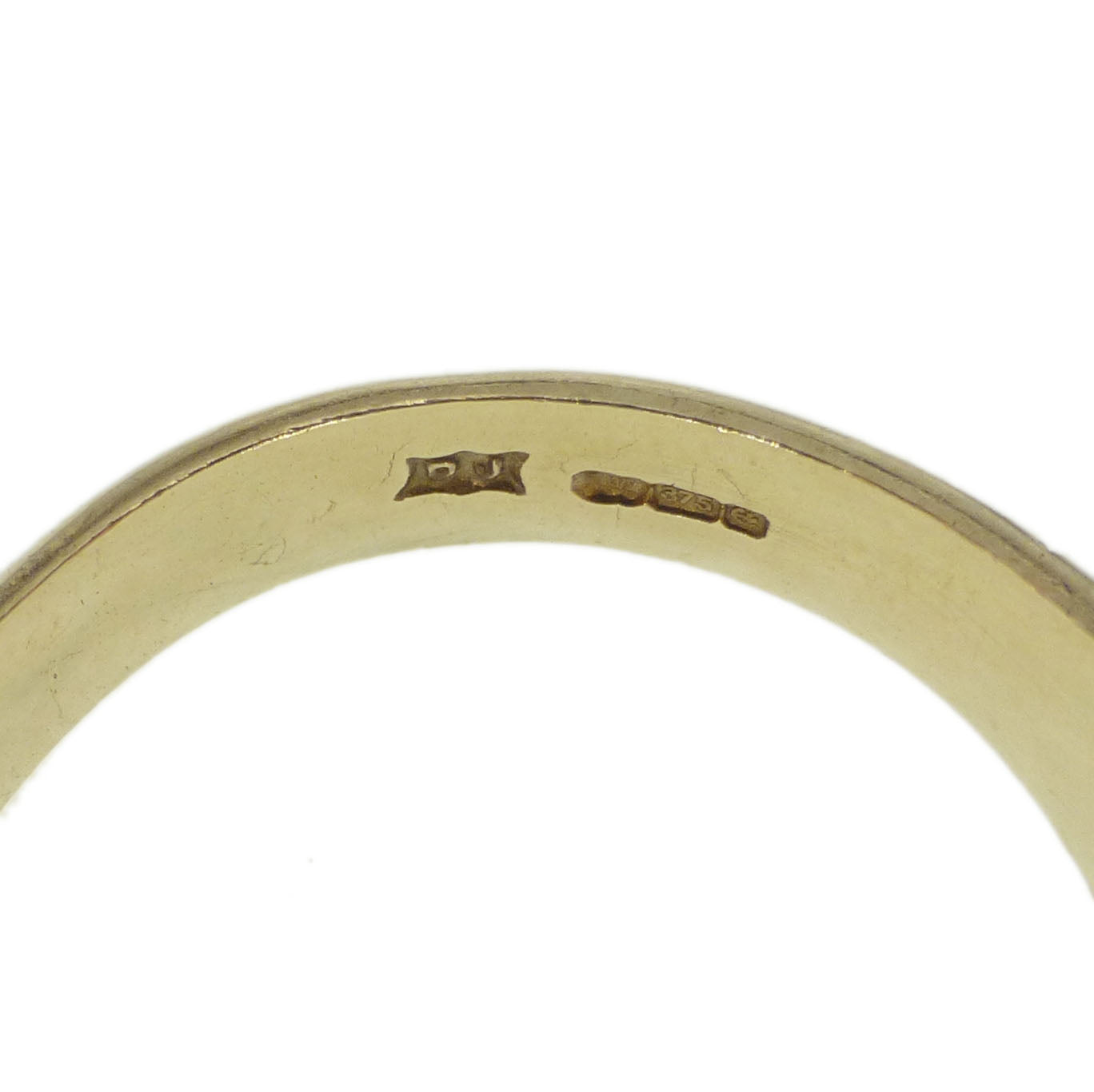 The ring is hallmarked with the makers mark 'OJ' and assay mark for Birmingham. There is no date letter but it has a little bit of age to it and is most likely a 70s piece.