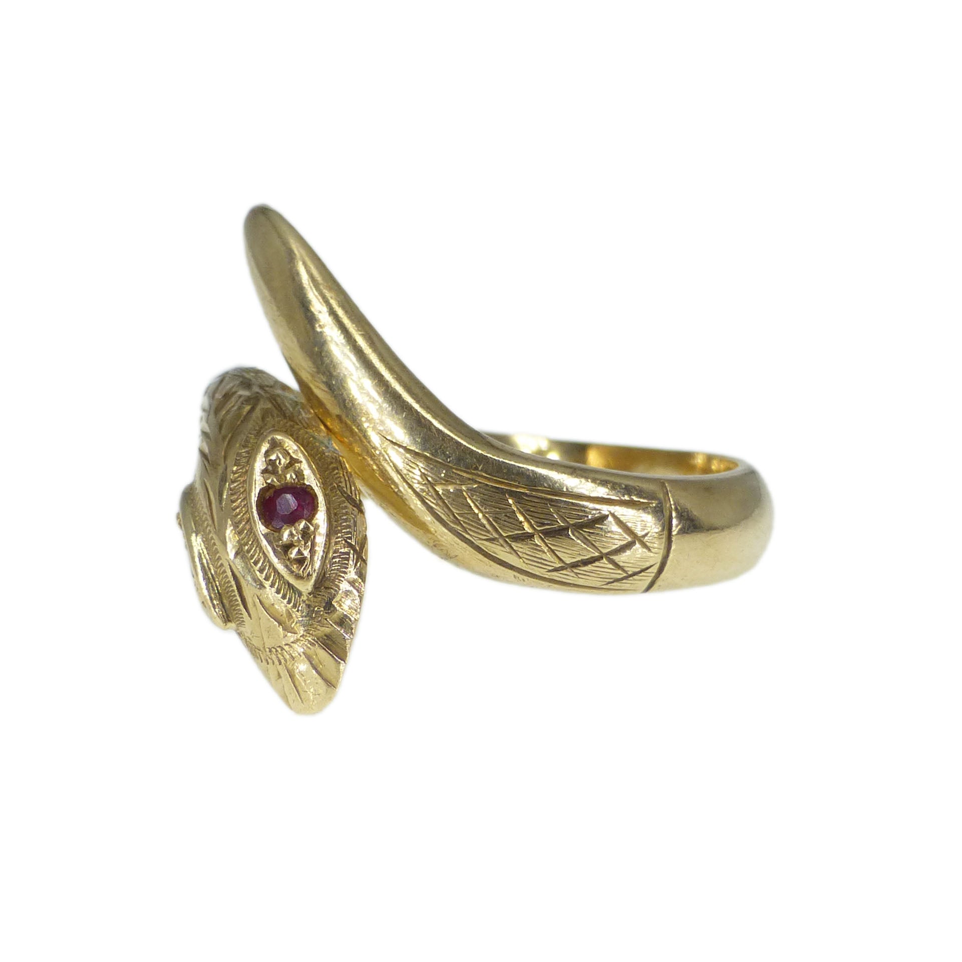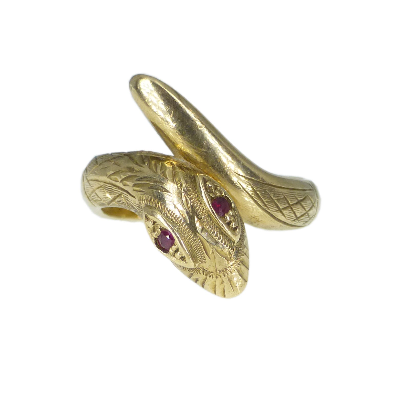 A wonderful chunky 9ct gold snake ring featuring a beautifully engraved head with two ruby stone eyes.