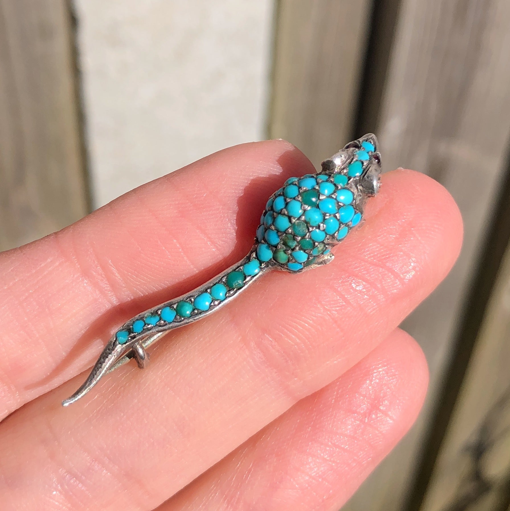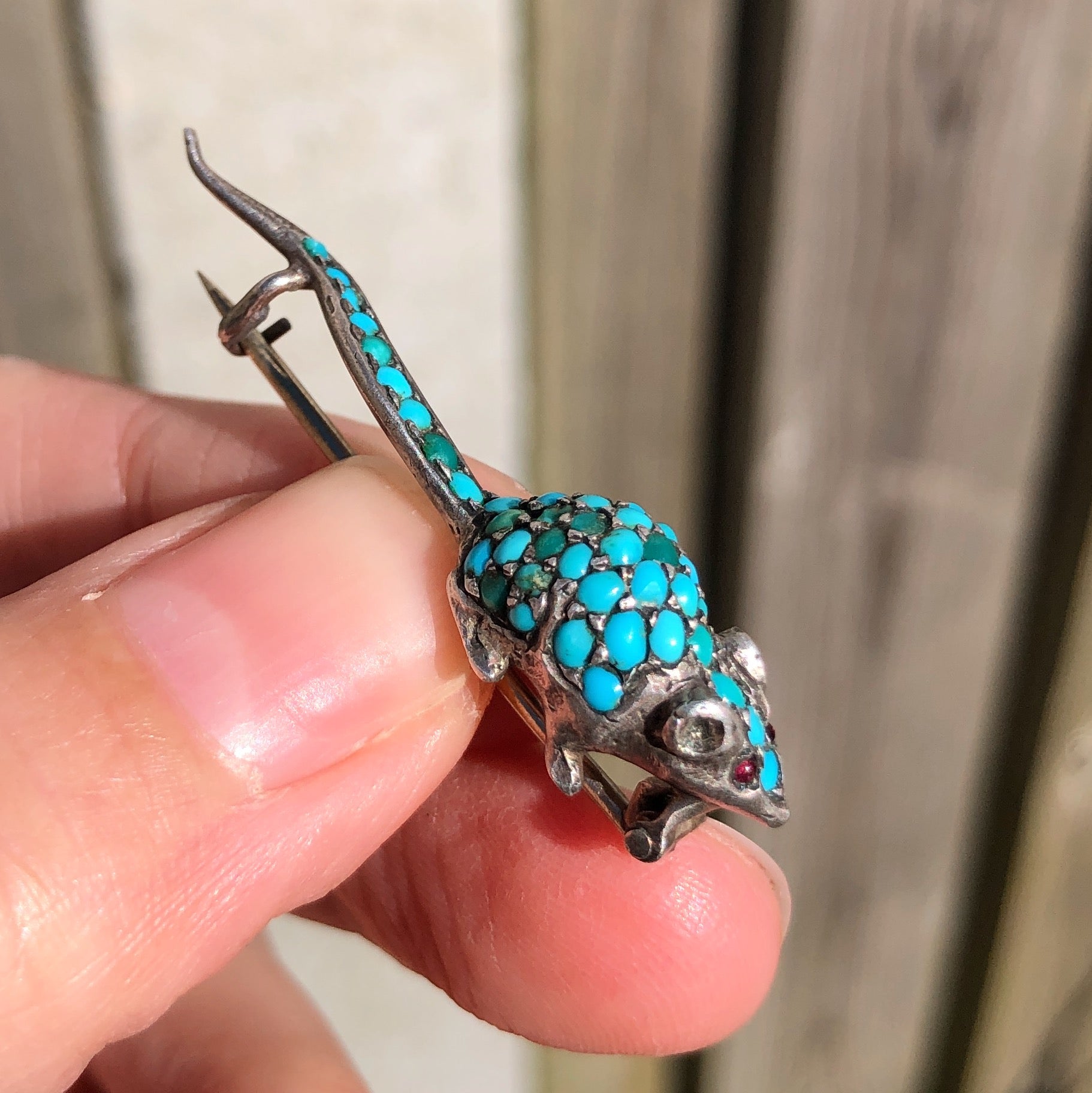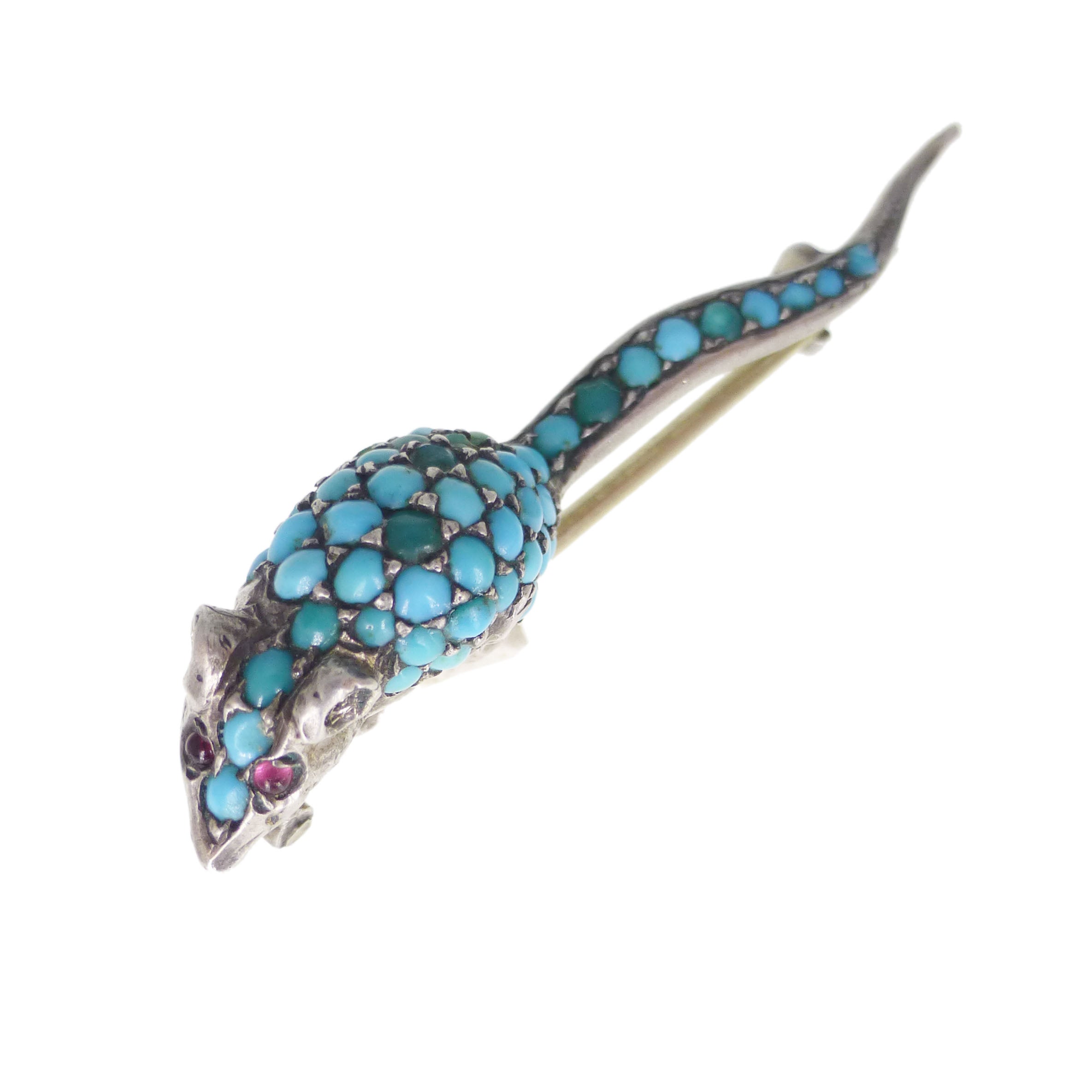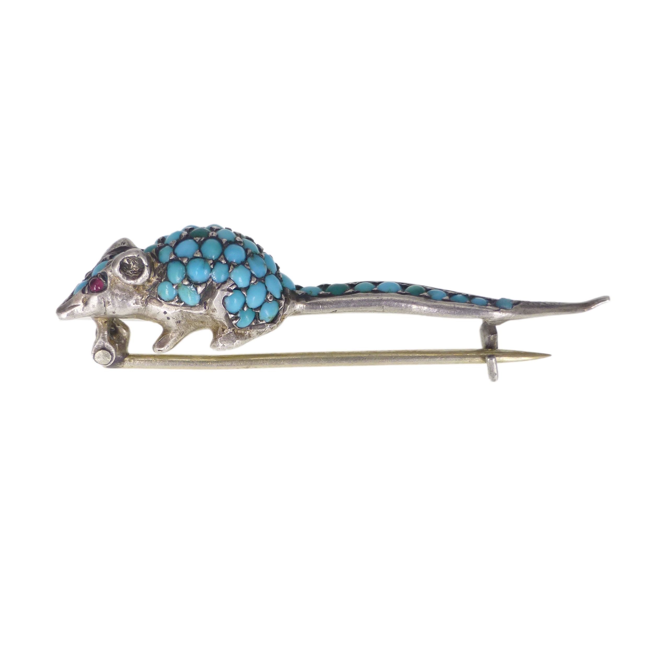 The mouse is beautifully detailed with a long tail and body studded with turquoise stones with two tiny red glass eyes.
