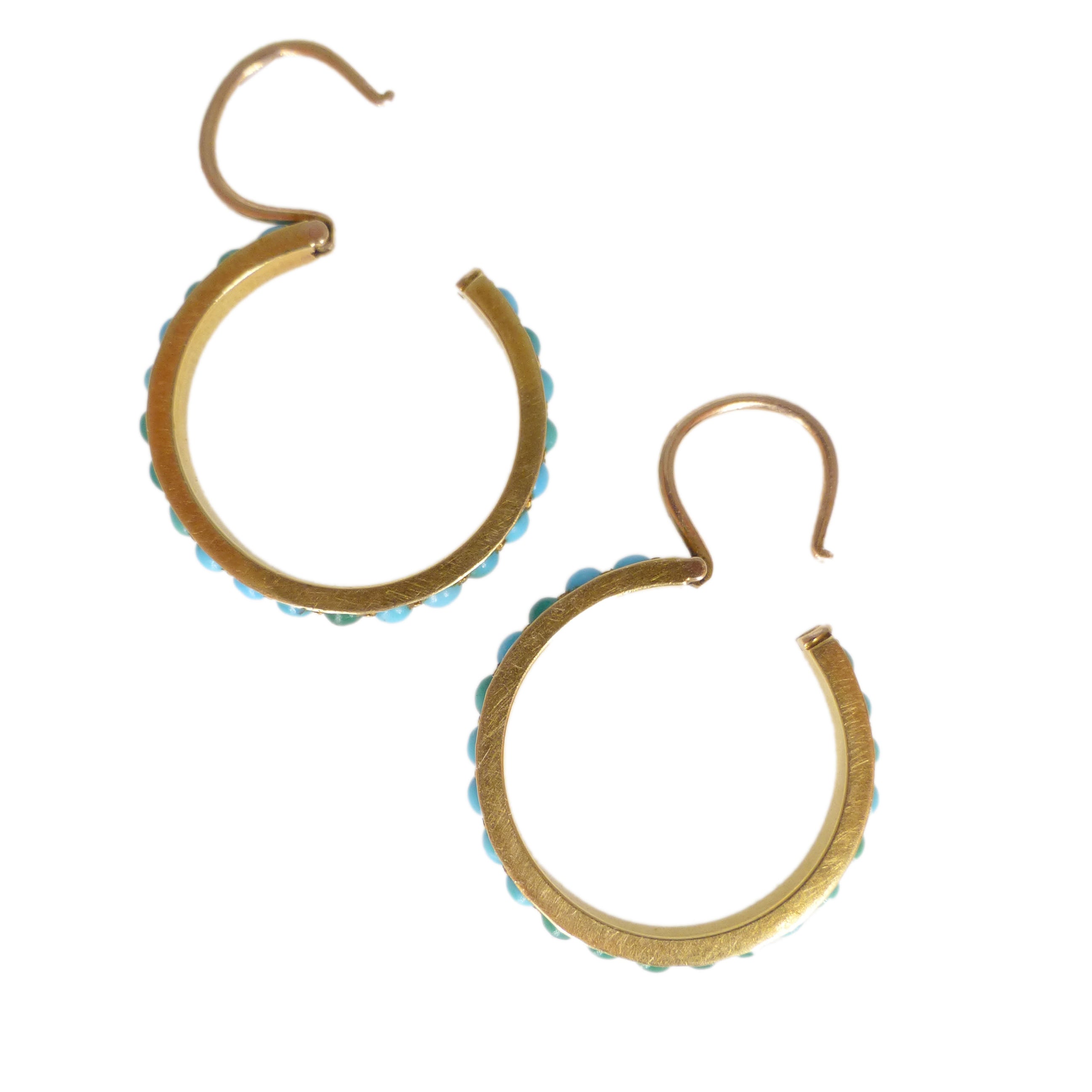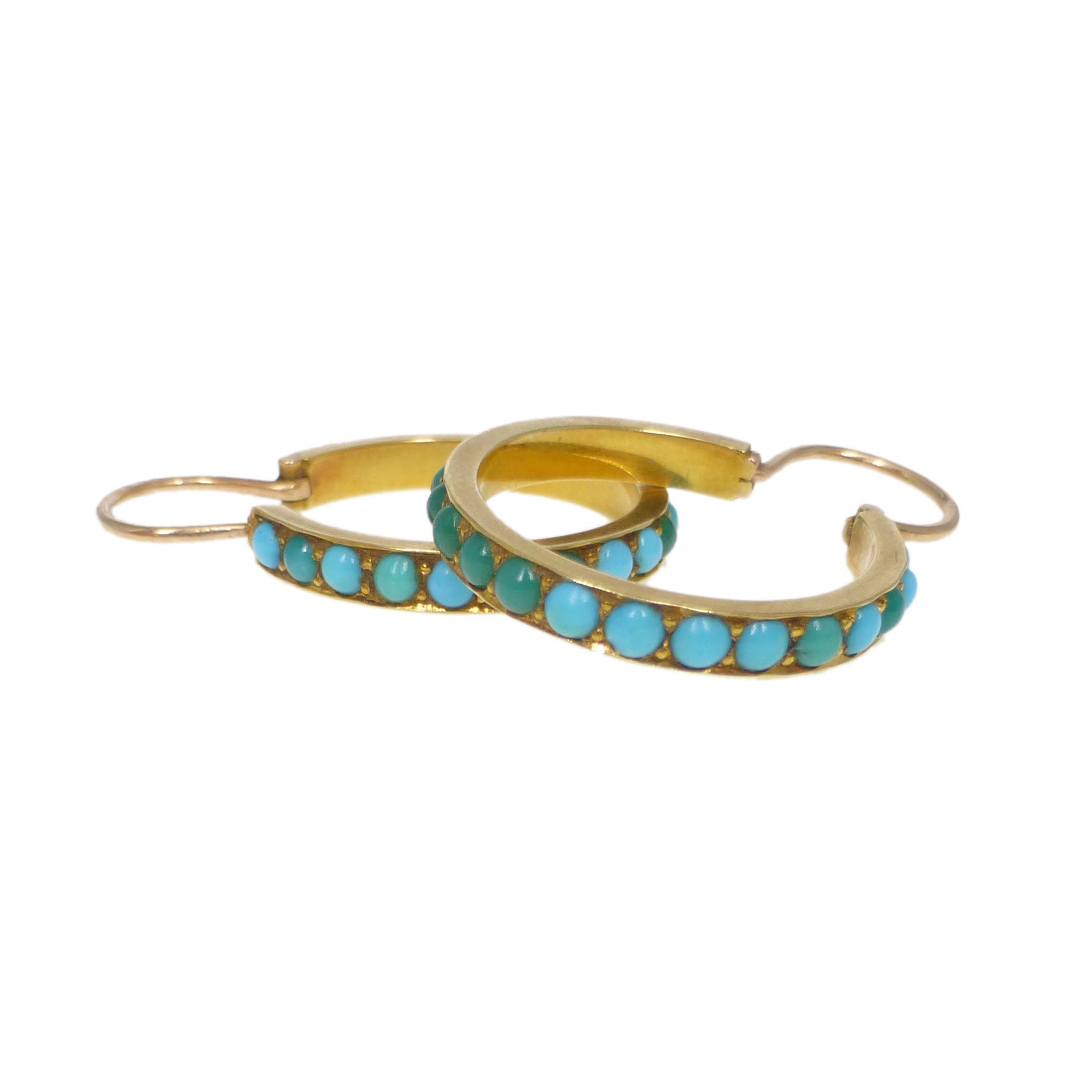 A wonderful pair of Victorian high carat gold creole hoop earrings. The earrings feature pavé set turquoise stones that run the entirety of each hoop.