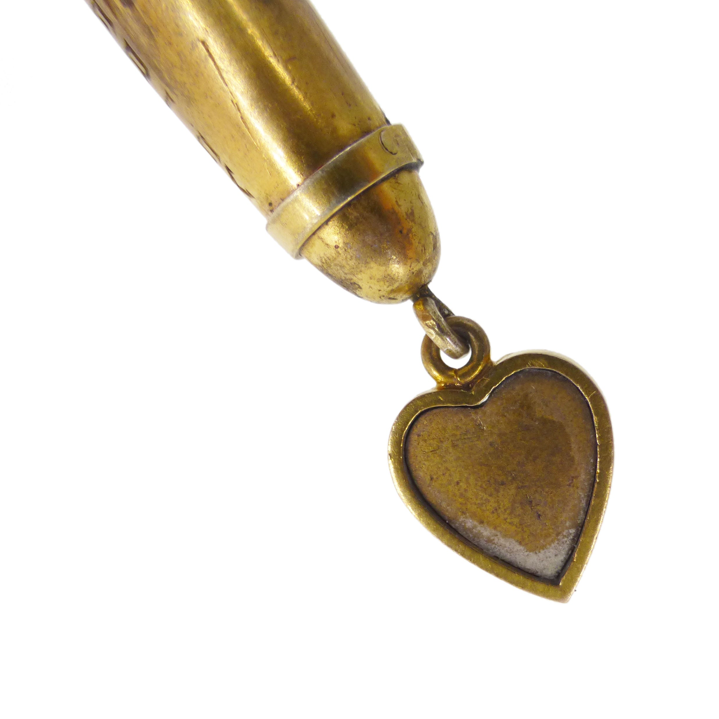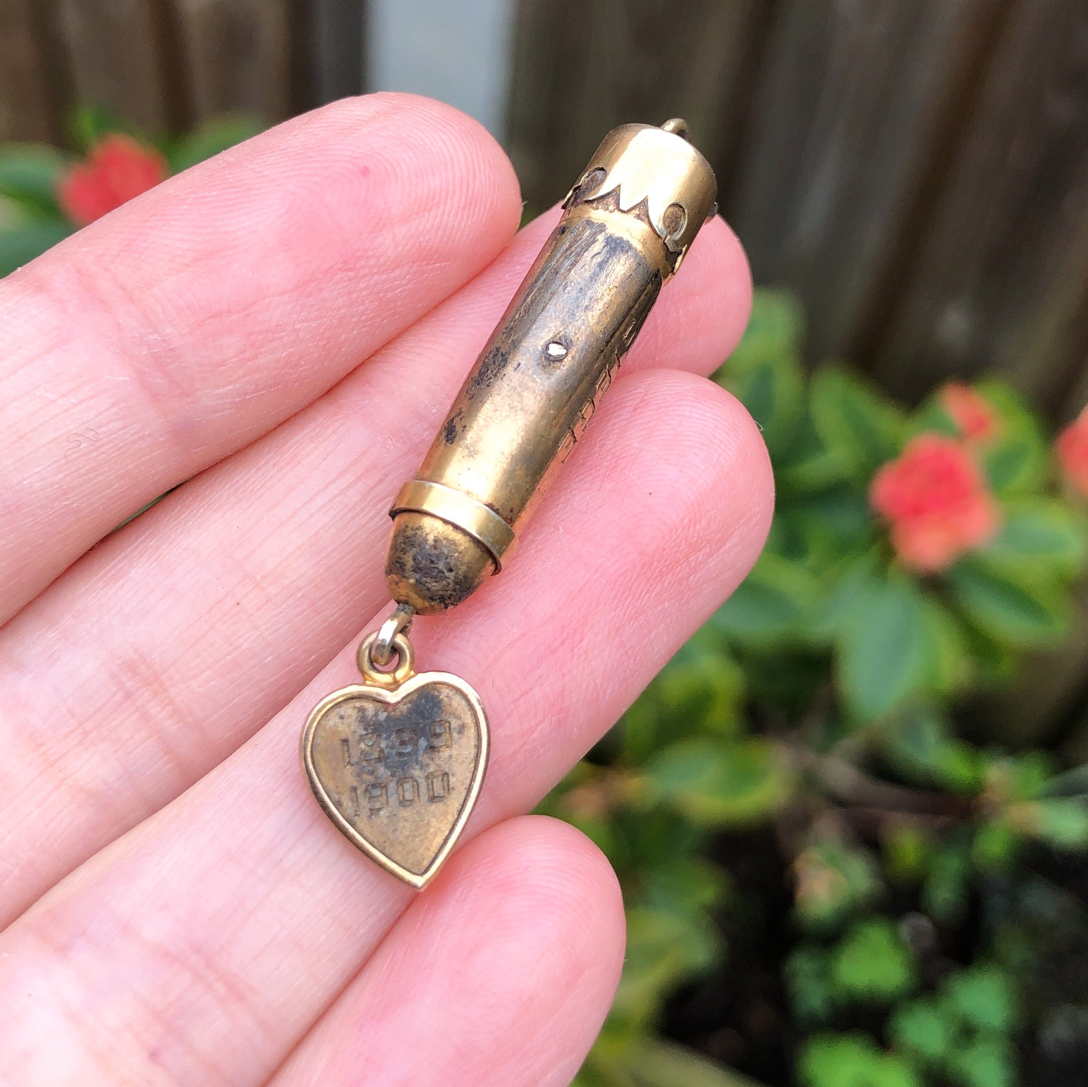 As shown in the pictures there is some age related surface wear to the bullet casing and heart. The wear could be cleaned if preferred but I feel it is important to offer it in the original condition.