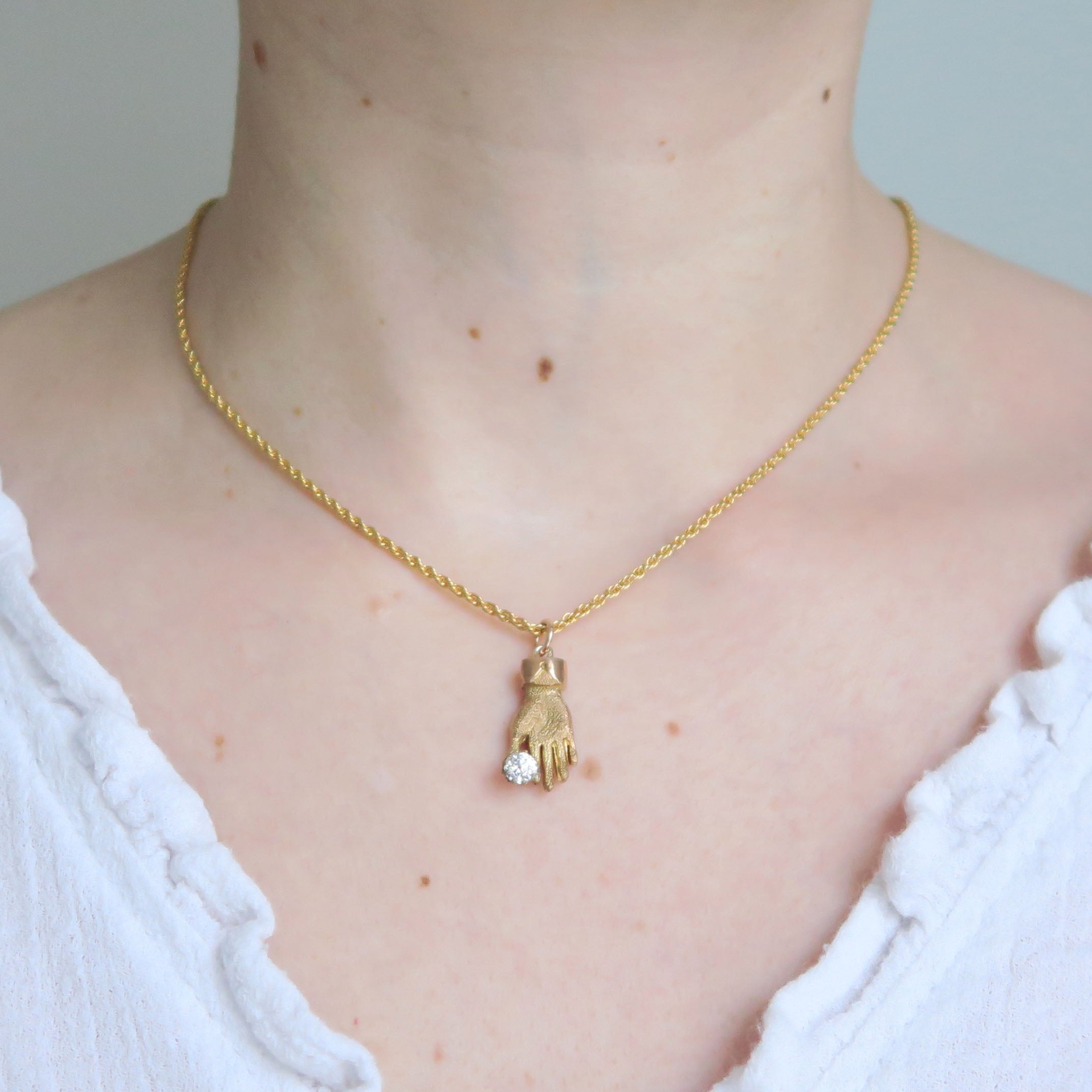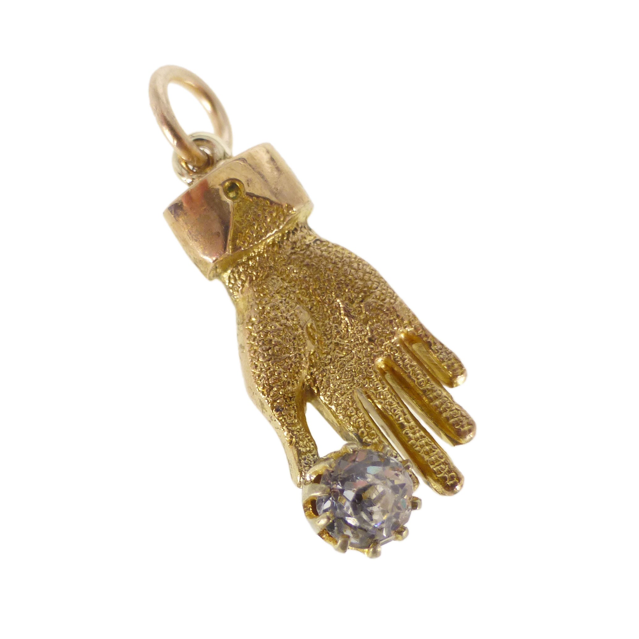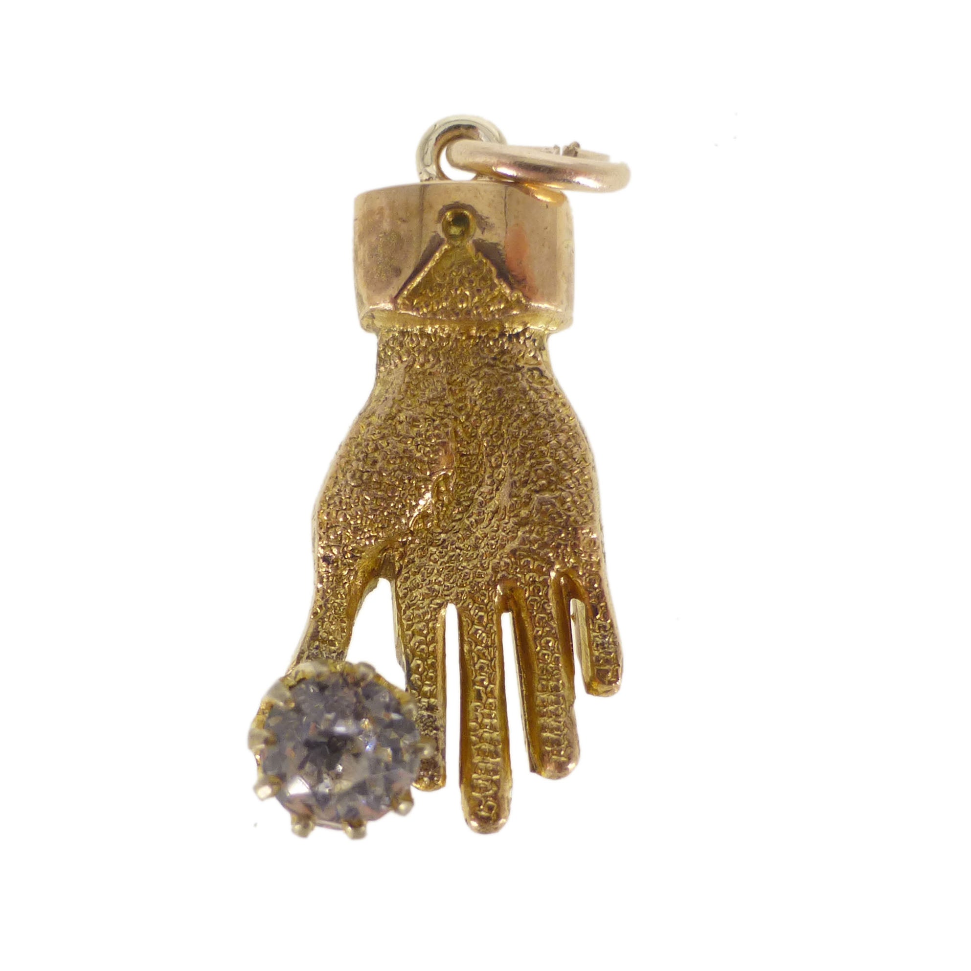 The hand is gold plated and features a detailed with a cuff with a sparkling paste stone. The charm features a hooked top with a gold plated bale attached.