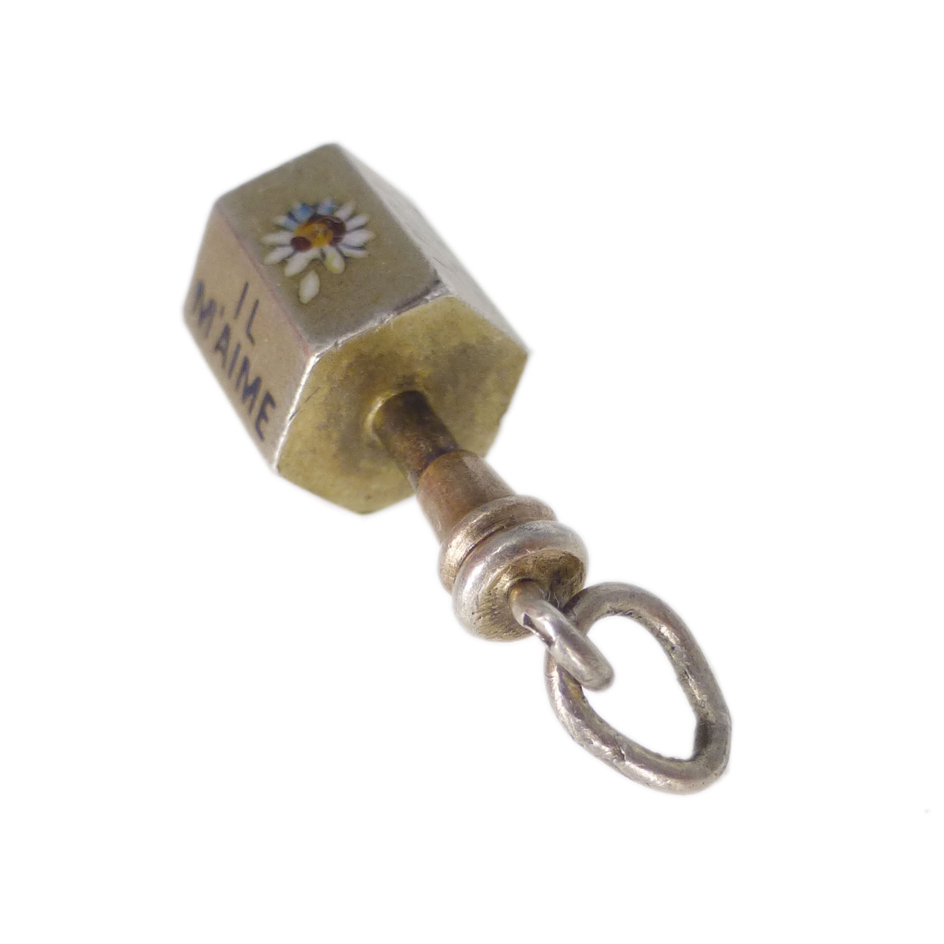 The six sided charm features an enamelled daisy shedding a petal with the phrases - Il M'aime, He loves me, Un Peu, A little, Beaucoup, A lot, Paissionnement, Passionately, Pas Du Tout, Not at all.