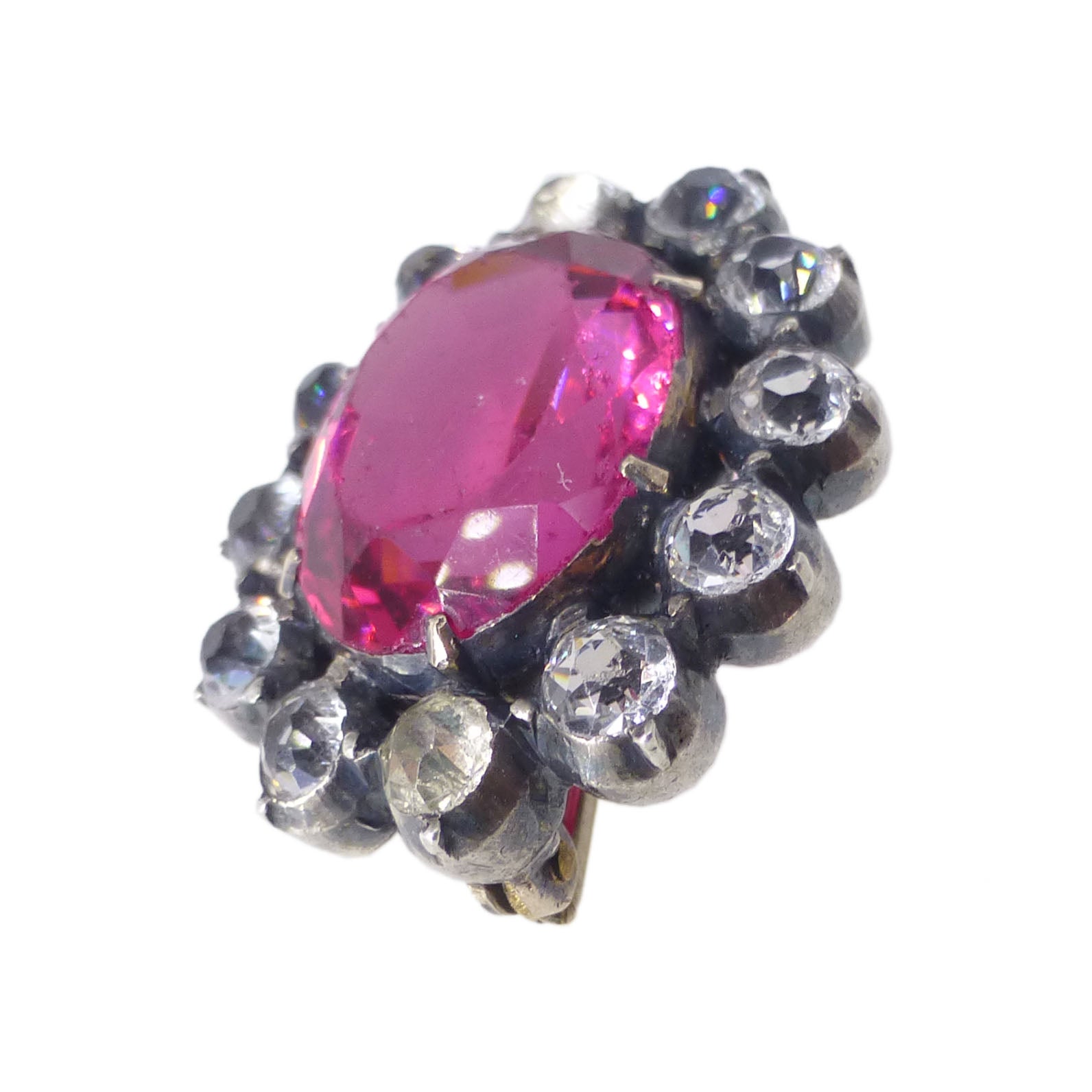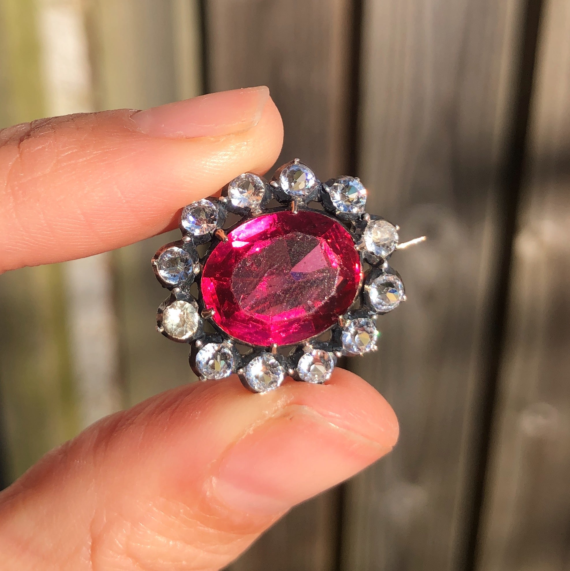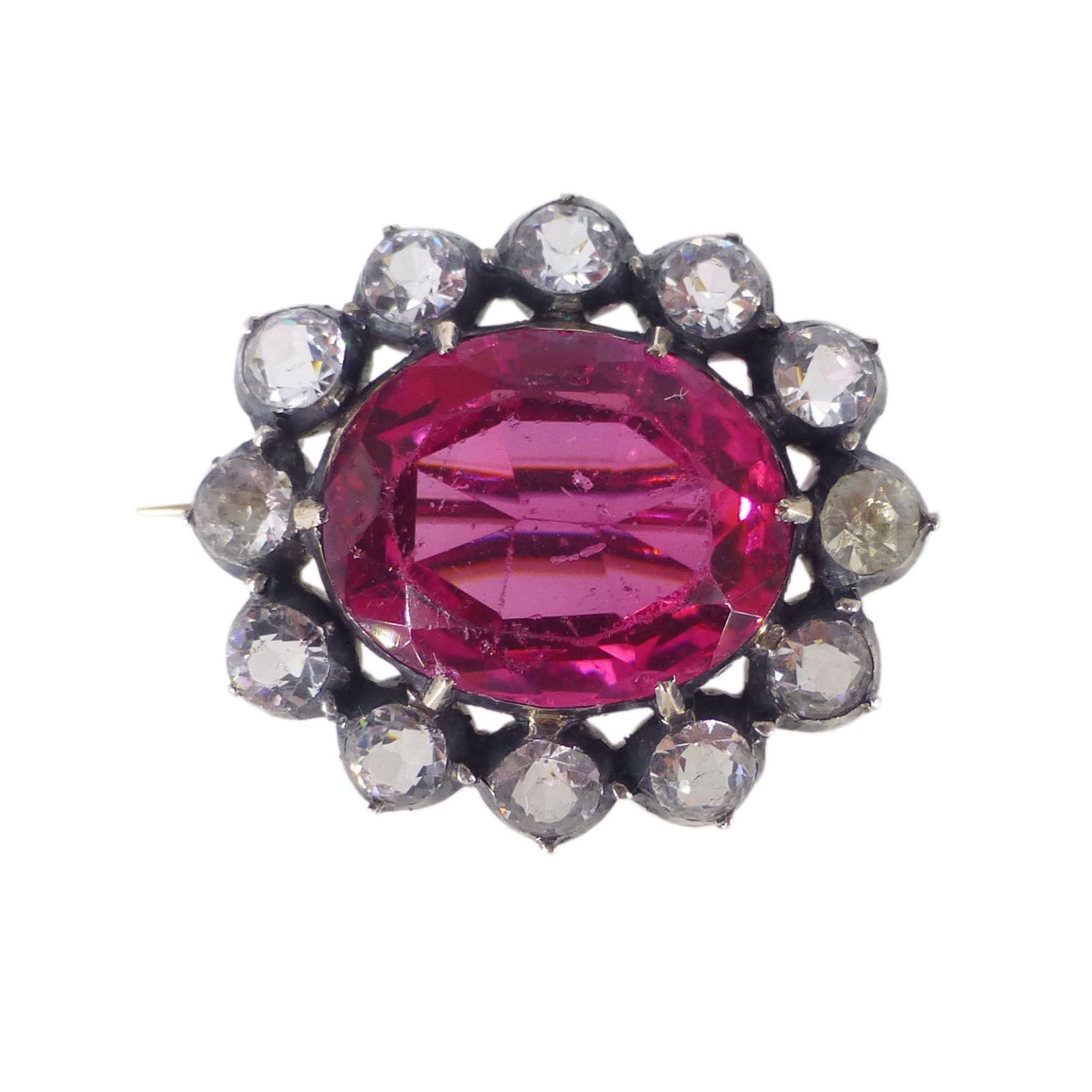 A beautiful antique silver brooch dating to the Victorian period. The brooch is set with a vibrant bright pink paste stone framed by sparkling clear paste stones.