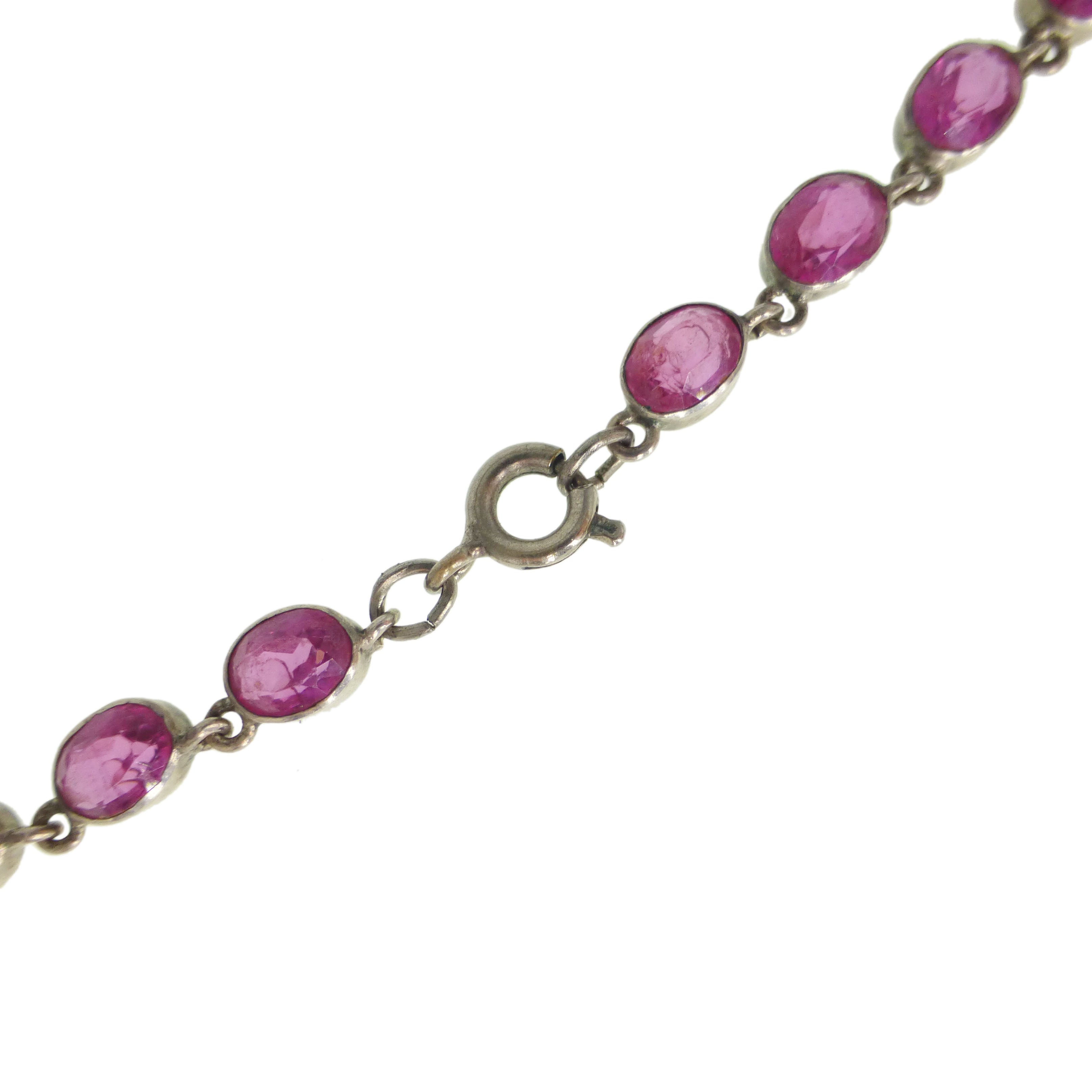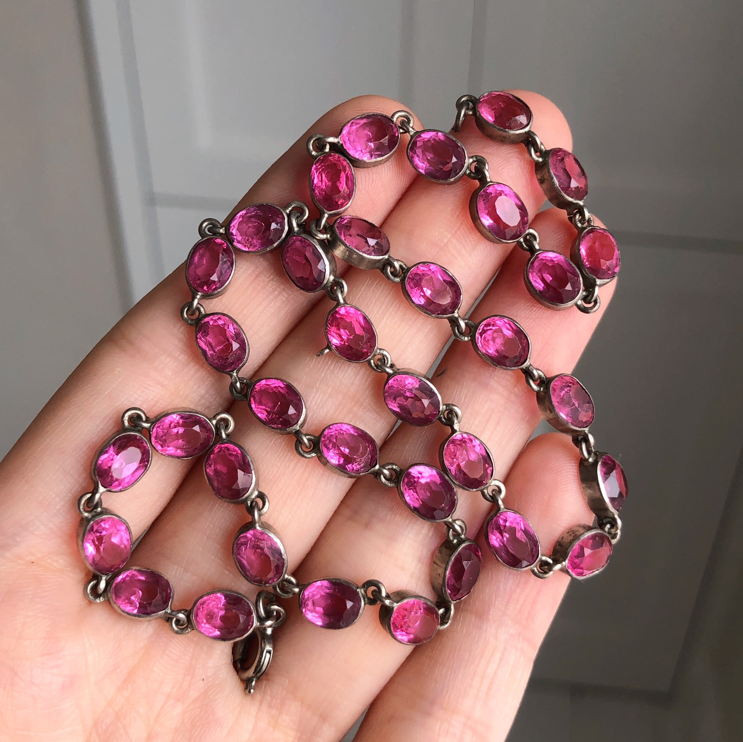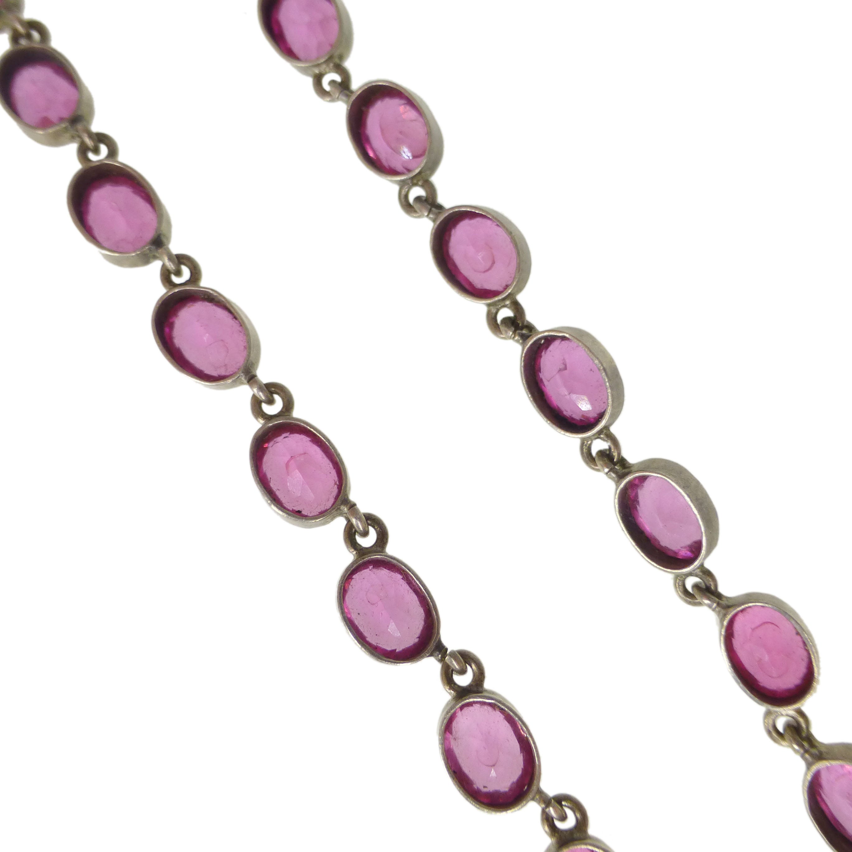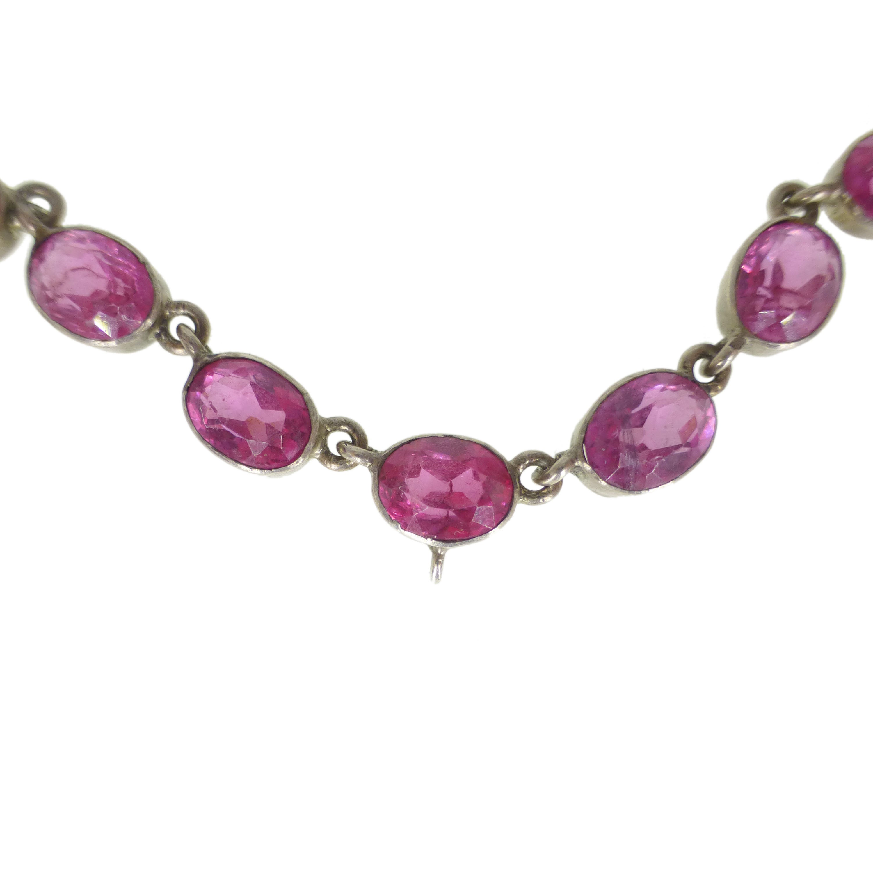 A wonderful antique necklace dating to the late 19th Century. The necklace features vibrant faceted pink glass stones set into open backed silver frames.