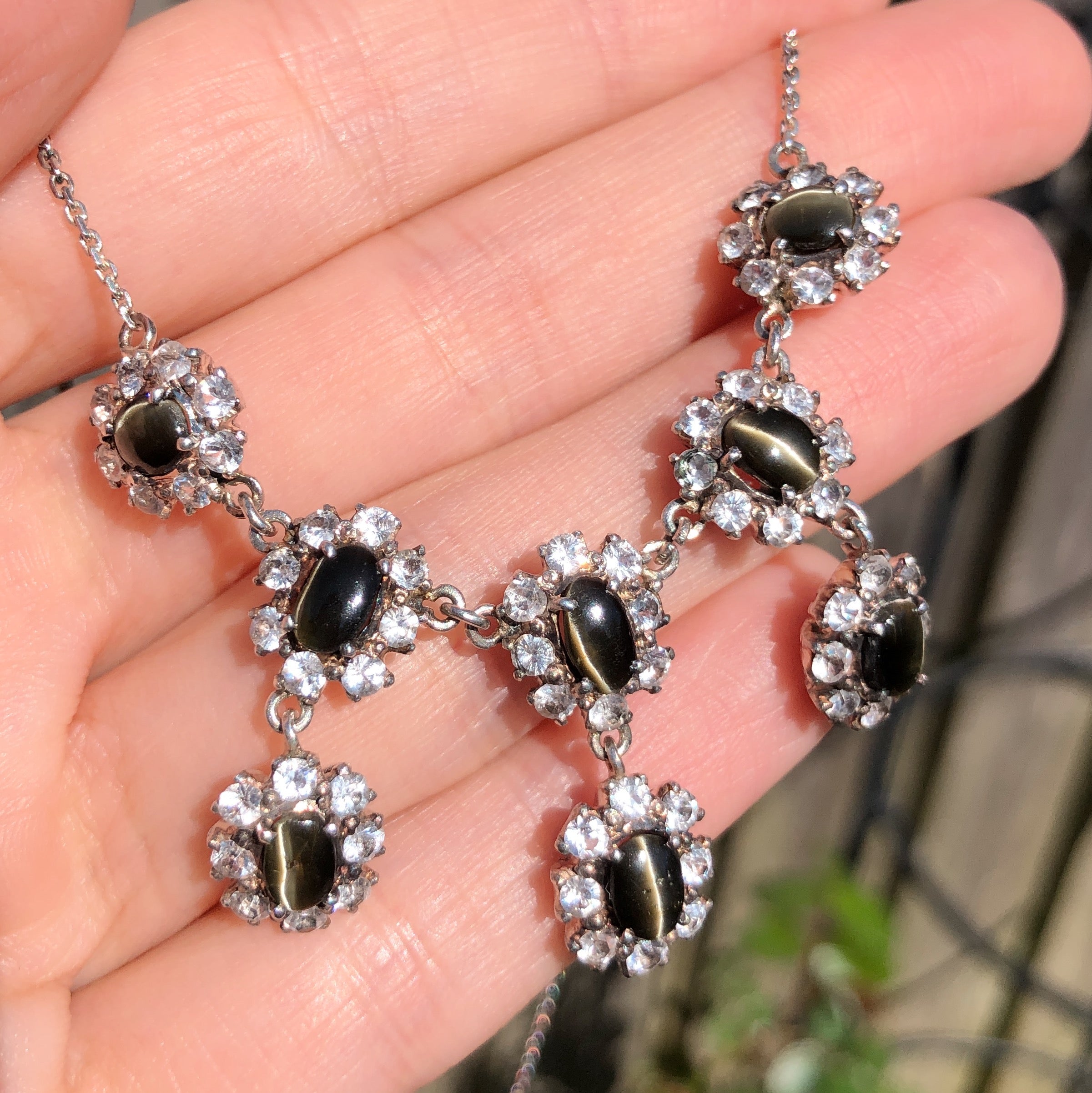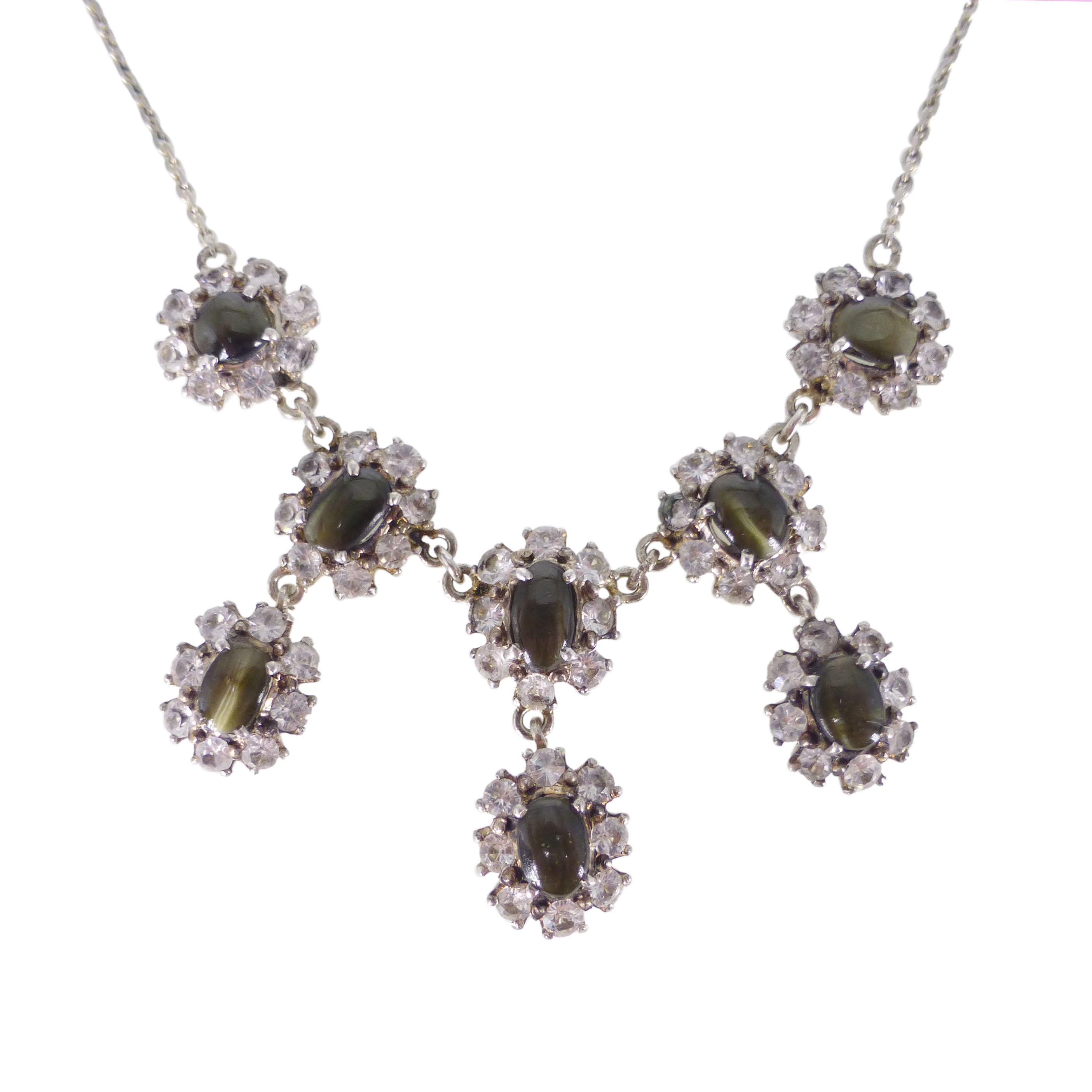 The necklace features beautiful Chrysoberyl Cat's Eye stones framed by sparkling white sapphires.