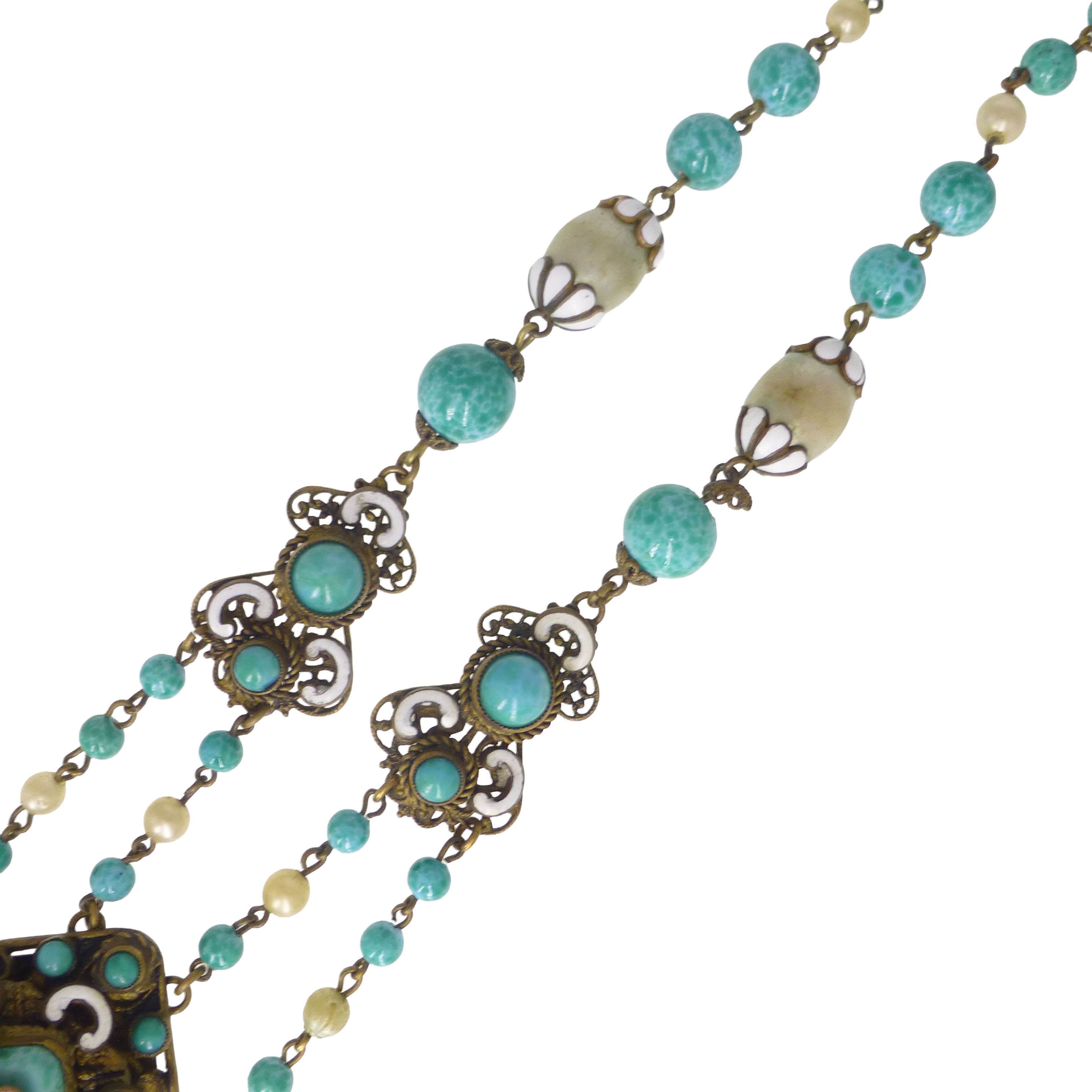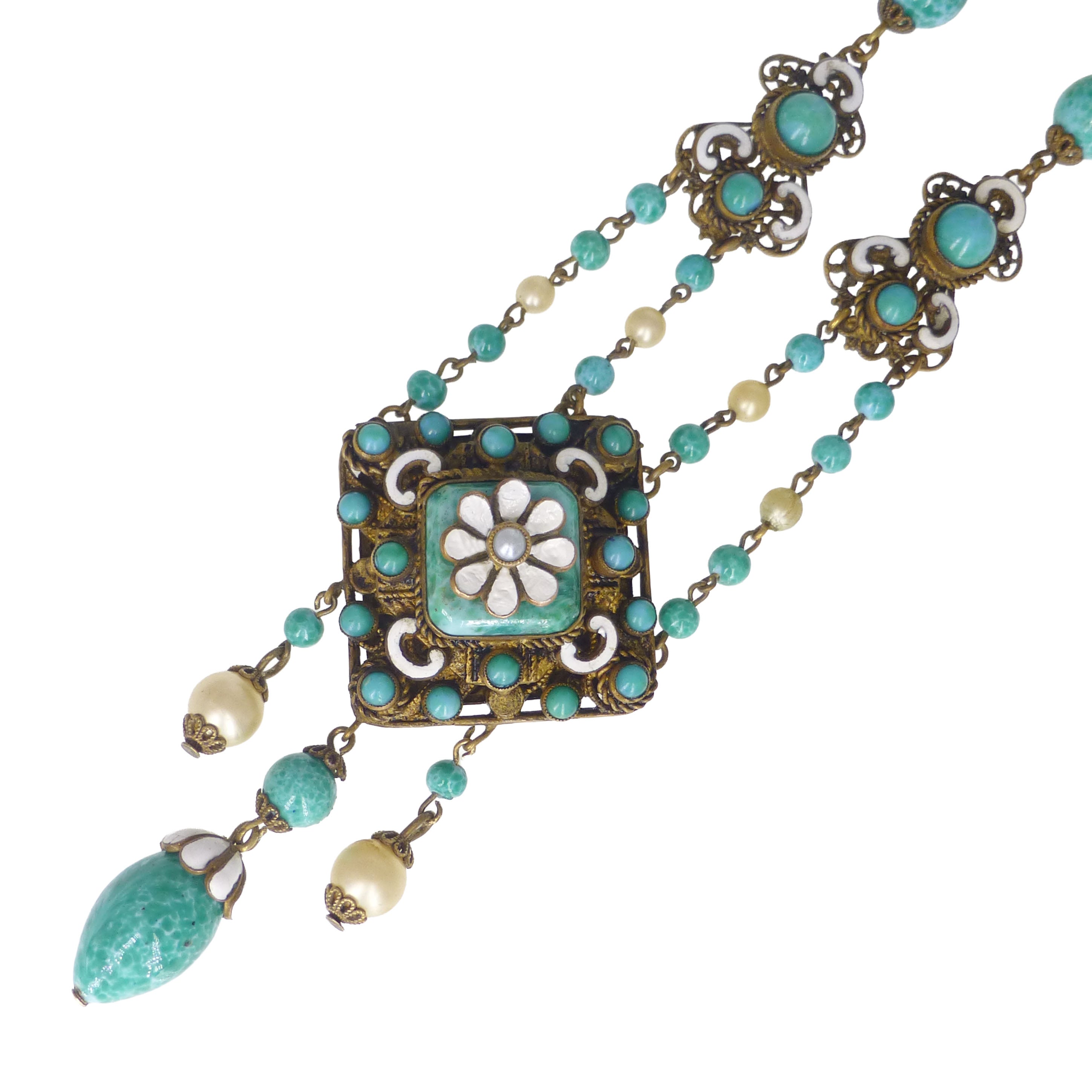 The necklace features a decorative central panel featuring peking glass stones with a white enamel flower framed by white enamel decorations.