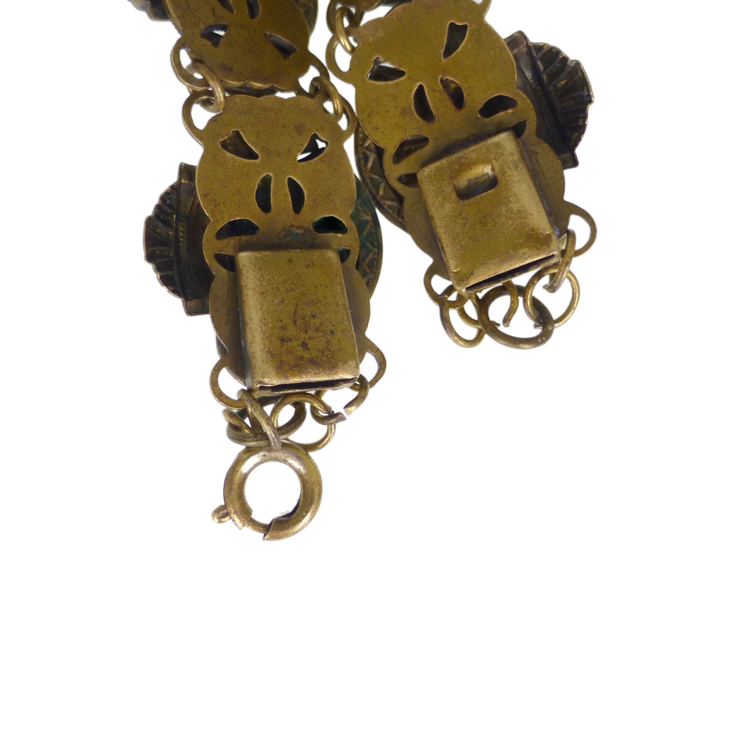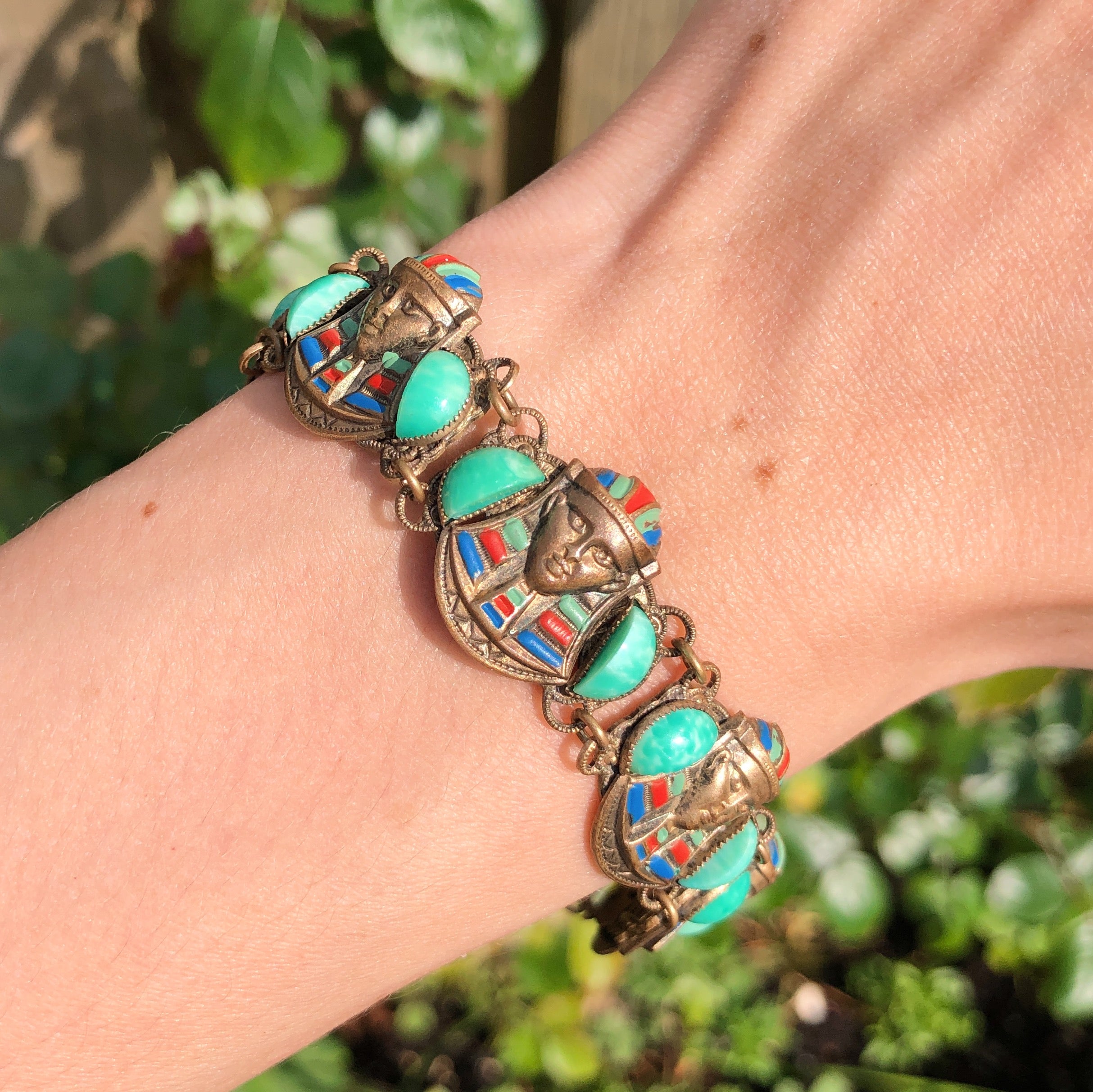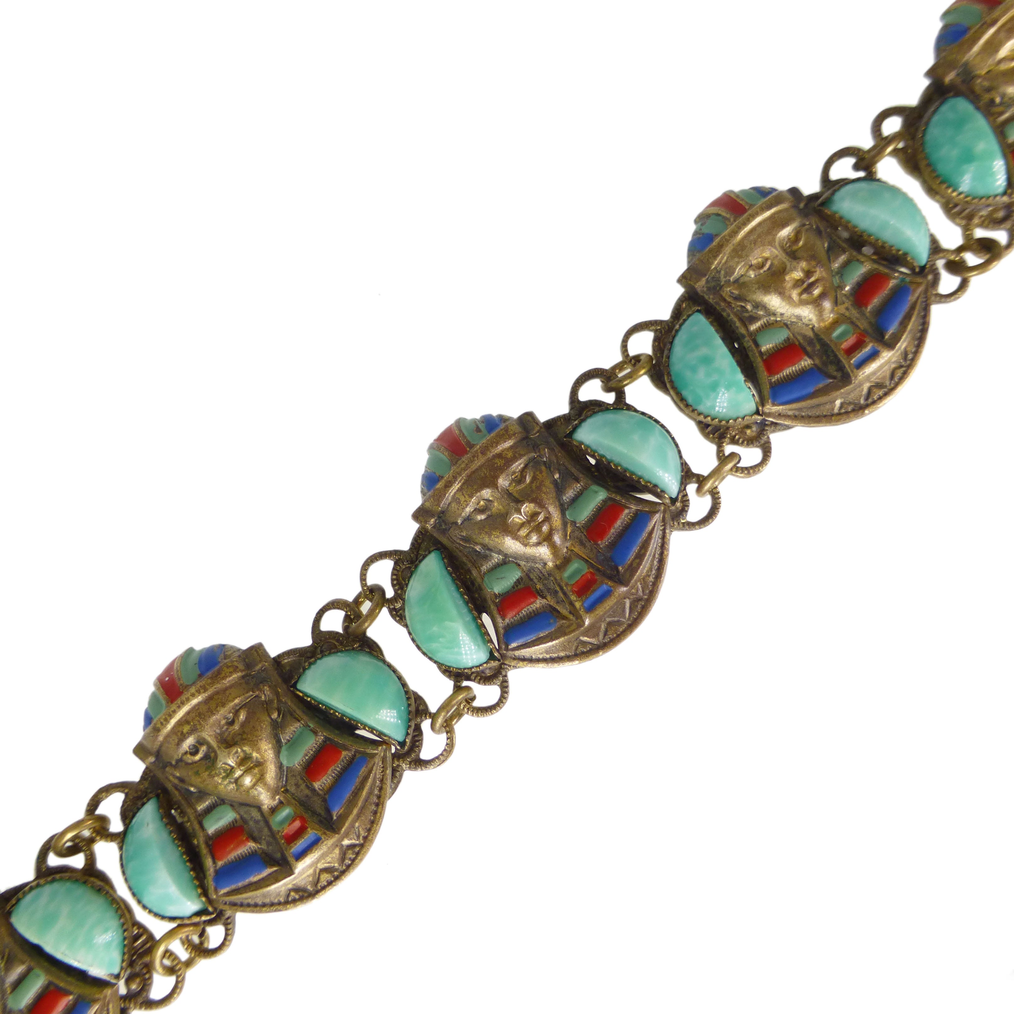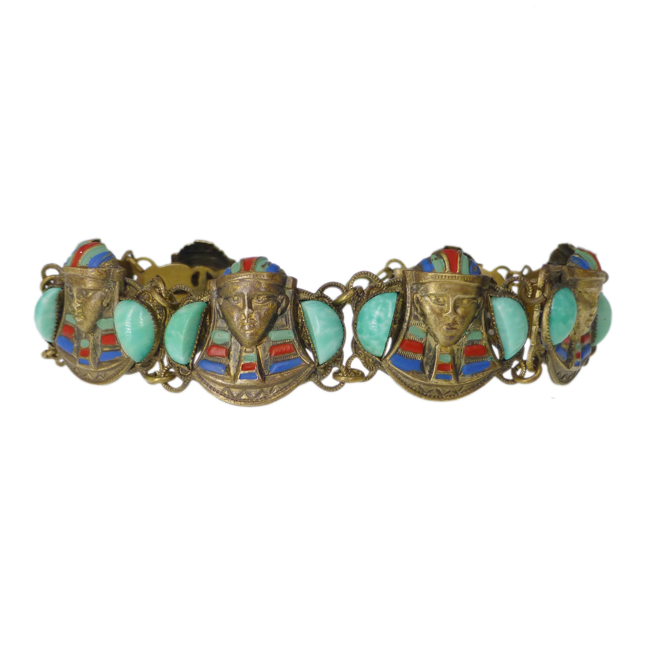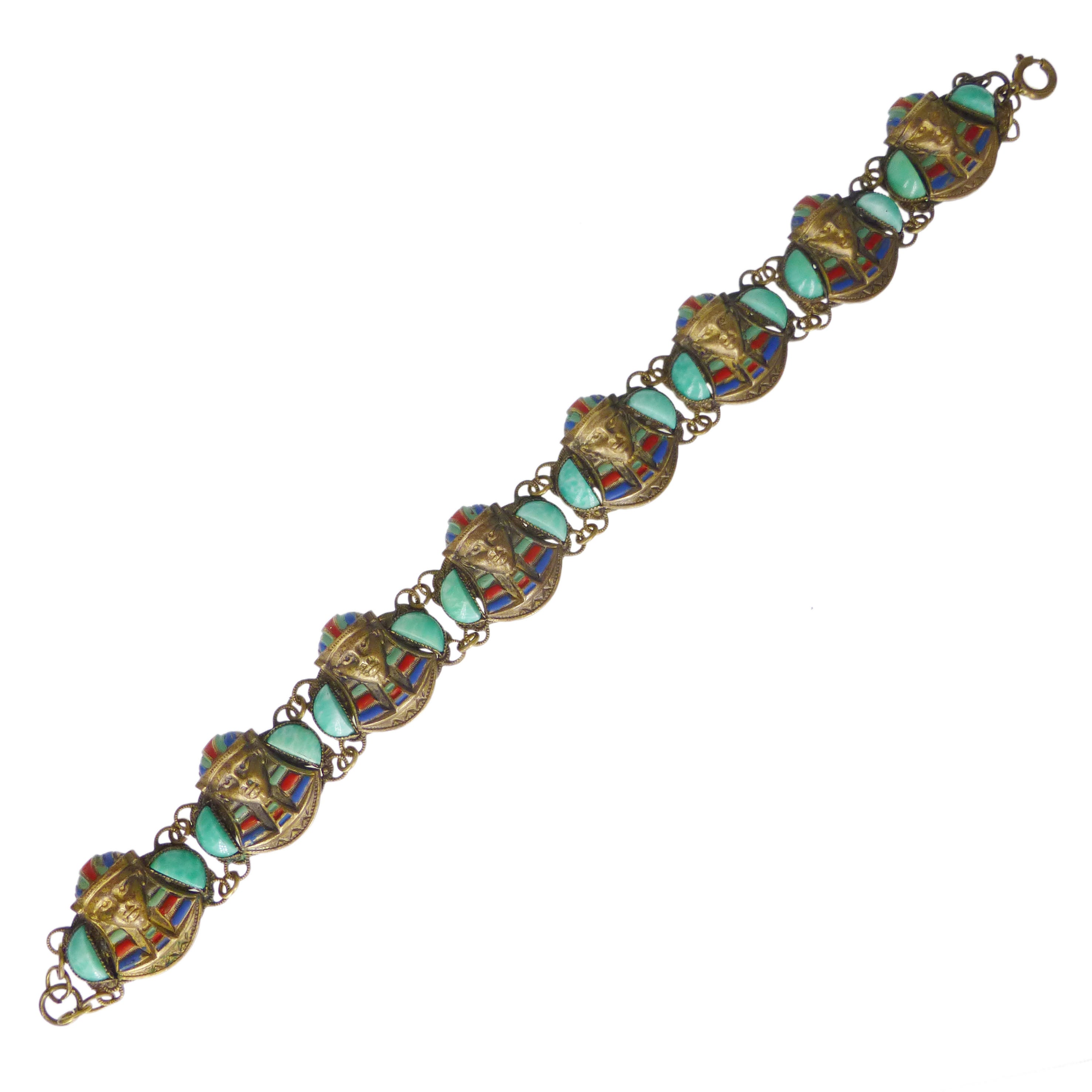 An iconic antique Egyptian revival bracelet by the Neiger Brothers. The bracelet features detailed metal panels set with carved green peking glass stones framing hand painted figural pharaohs.