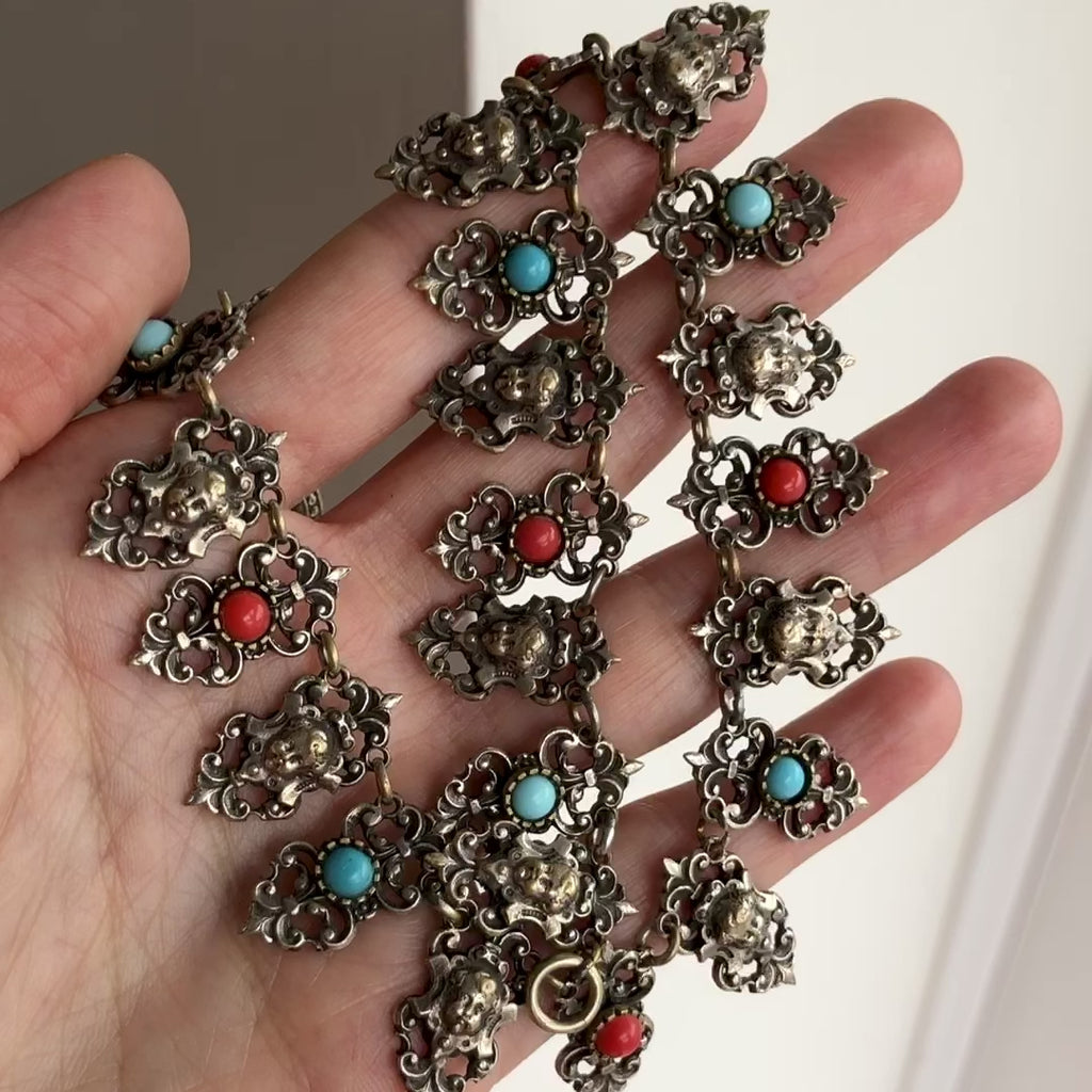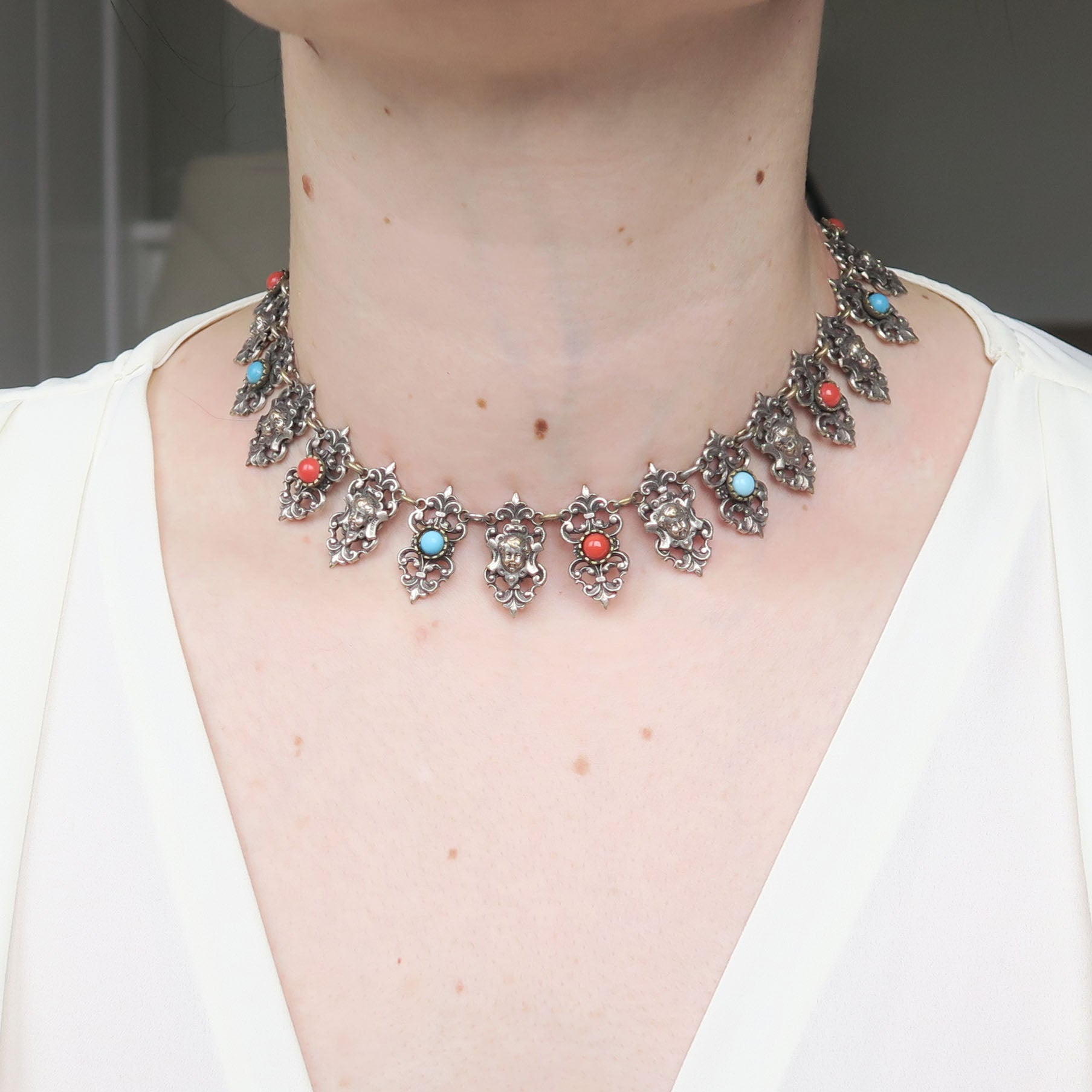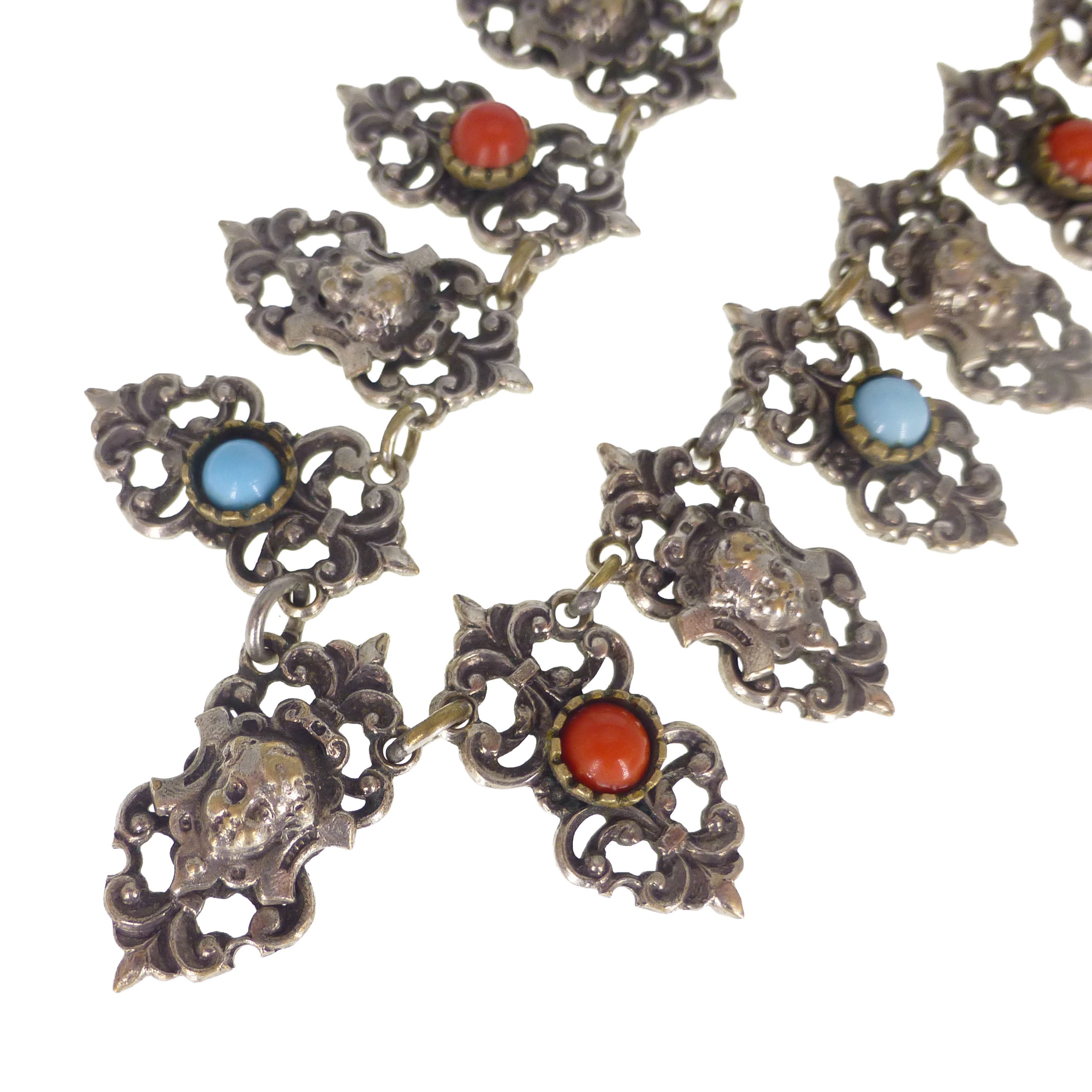 An amazing antique Renaissance revival necklace featuring detailed figural panels with coral and turquoise glass cabochons set in between.
